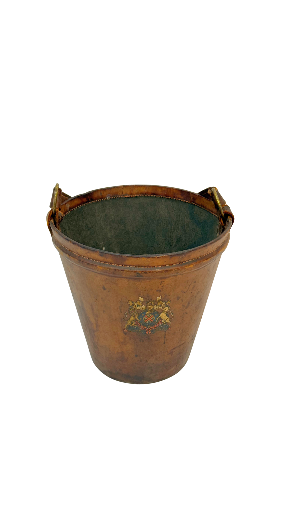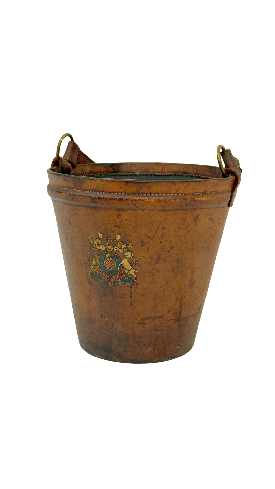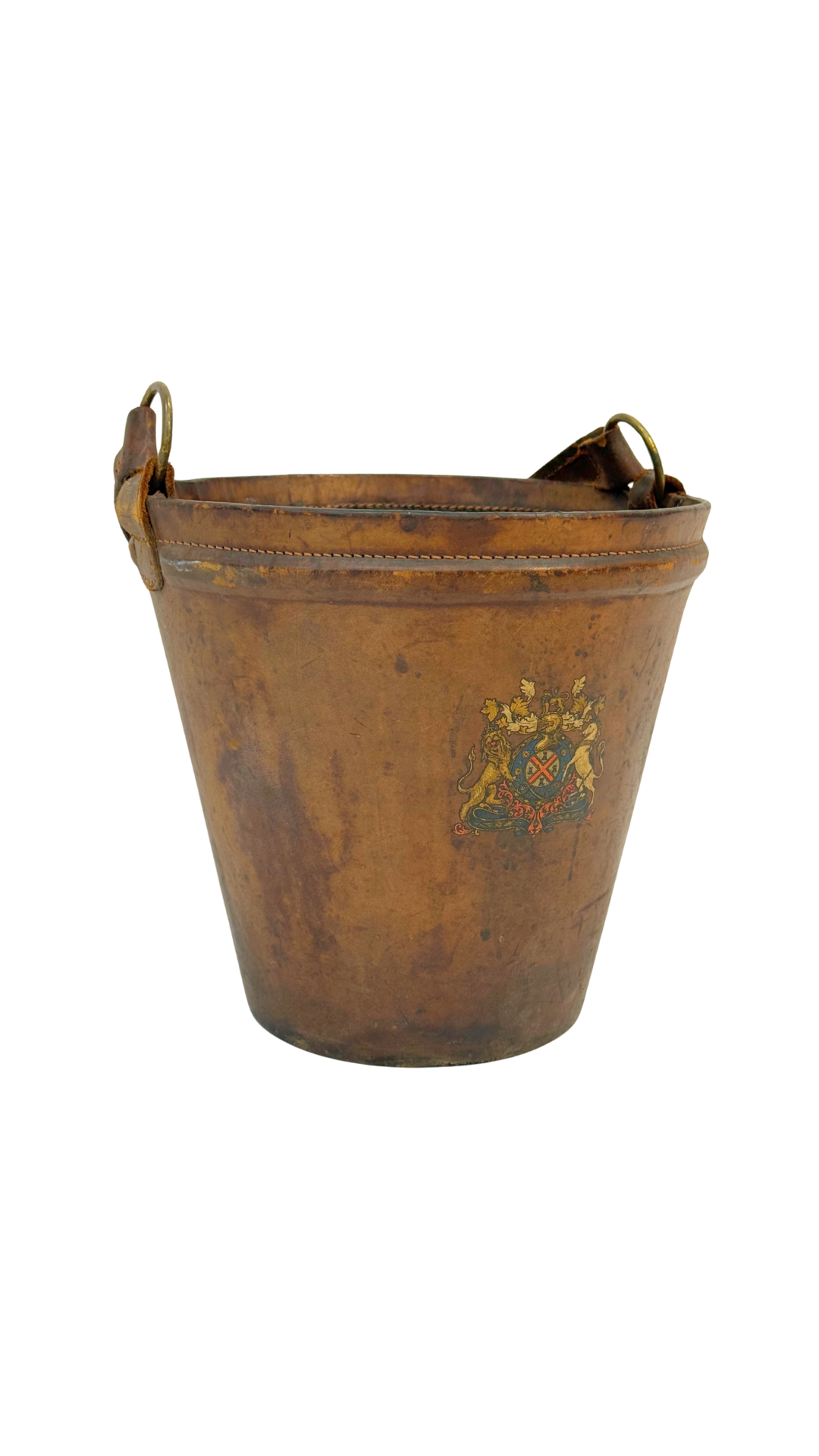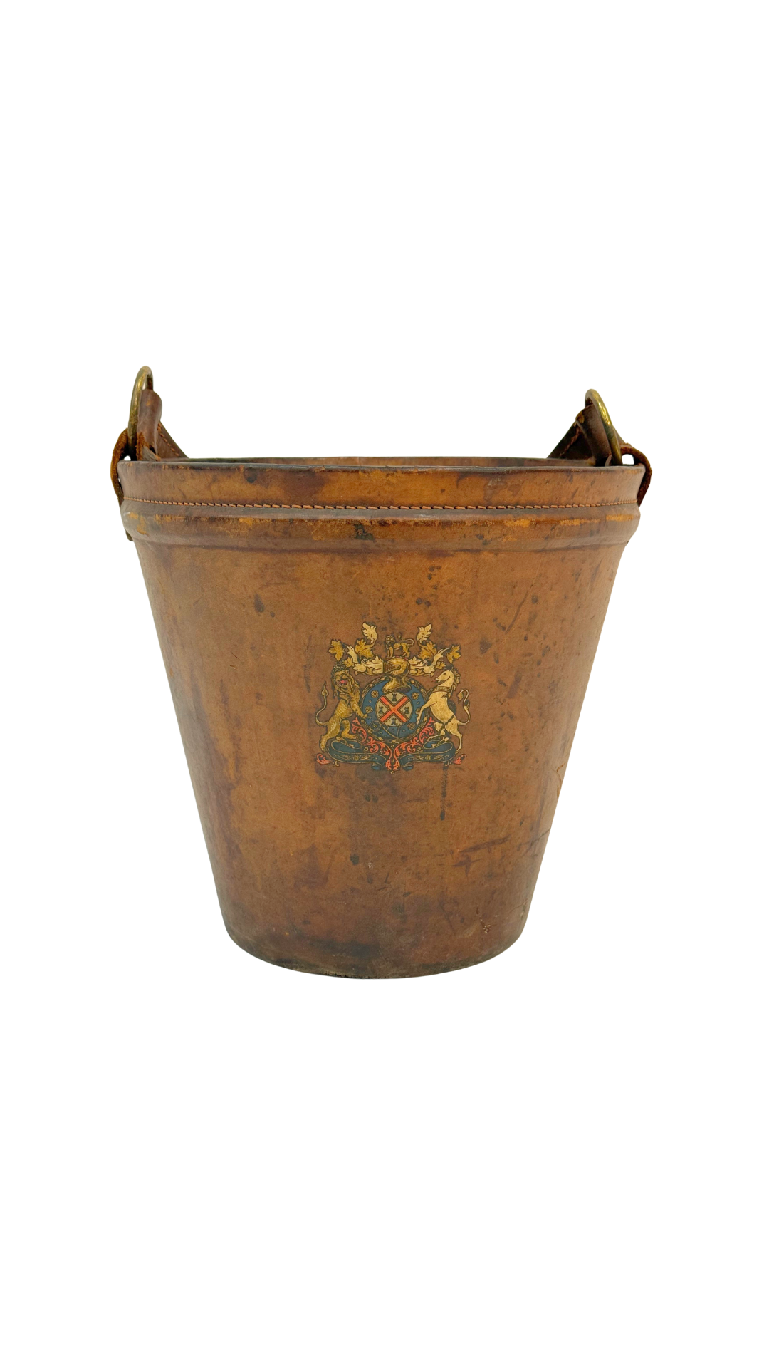 A remarkable 19th-century English fire bucket crafted in stitched leather, with brass rings for attaching a carrying handle. The bucket retains its original hand-painted armorial crest, featuring a heraldic shield flanked by lions — a decorative emblem that speaks to its historic provenance, likely tied to a civic institution or prominent family.