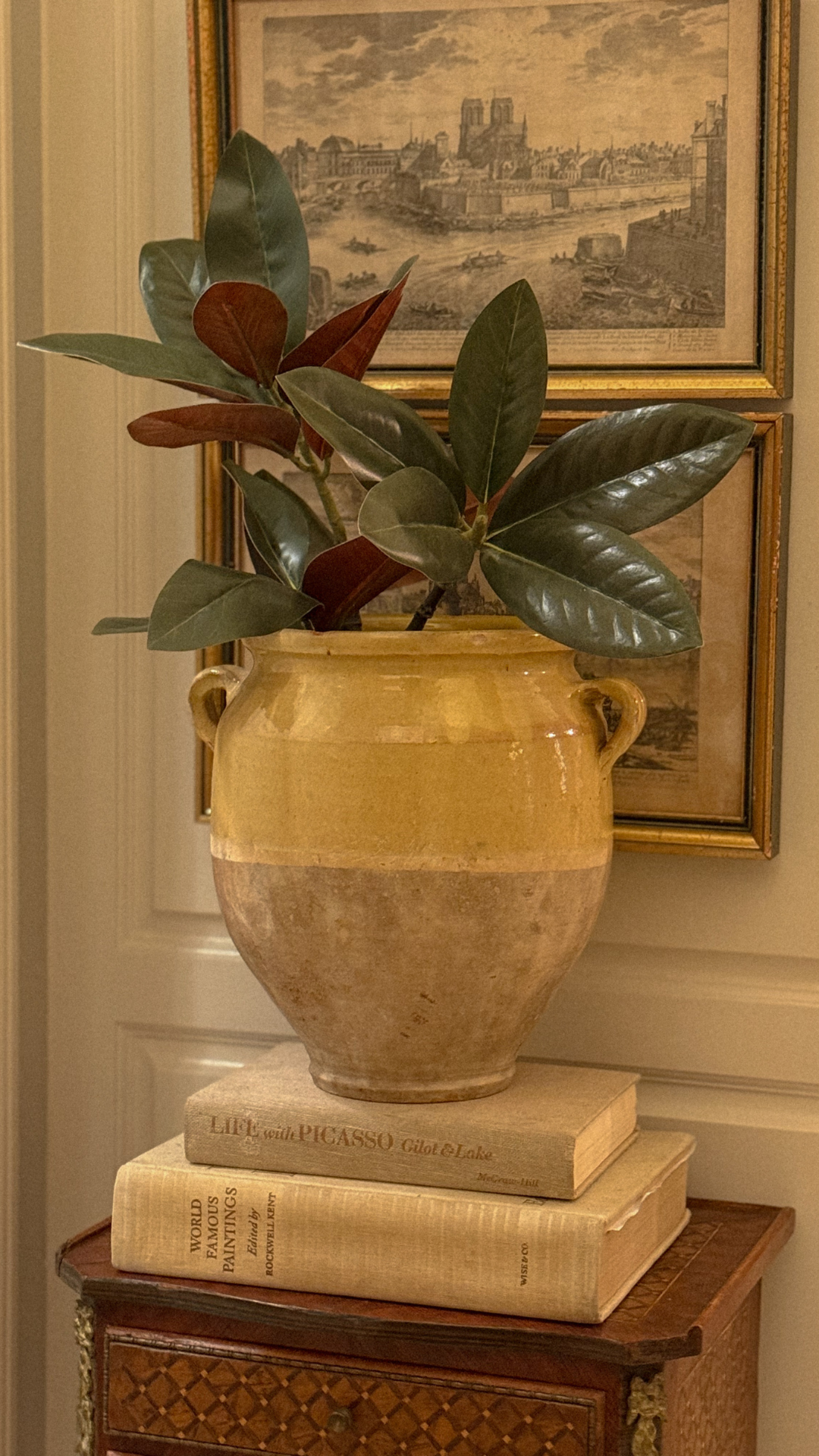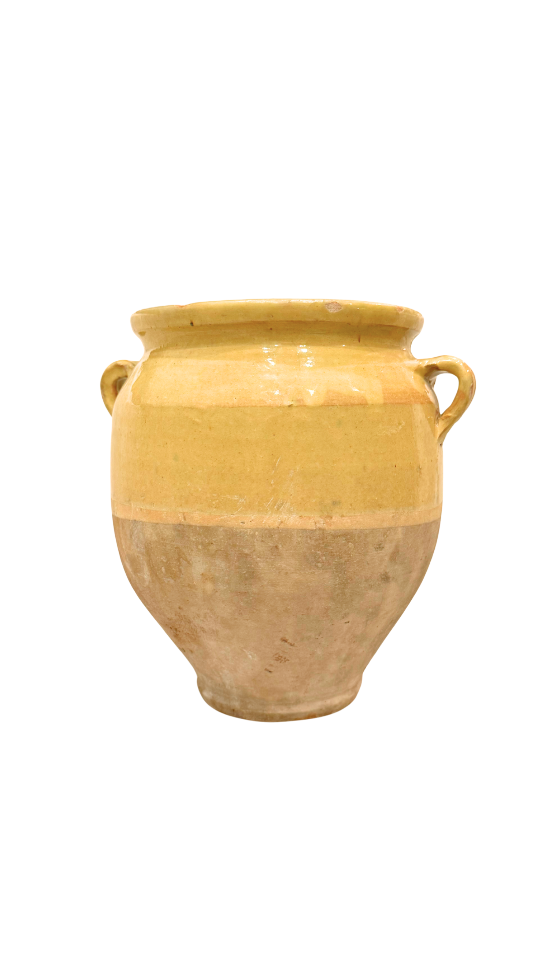 A beautiful 19th-century French confit pot with its signature two-toned glaze—rich ochre on top with an unglazed, raw clay base. This classic utilitarian piece was originally used to preserve duck or goose, a staple in rural French kitchens. The earthenware body and looped side handles are handmade, and the interior retains its original glaze with authentic wear. Lovely crazing, patina, and a touch of timeworn charm throughout. A statement piece for your kitchen styling or shelf display.