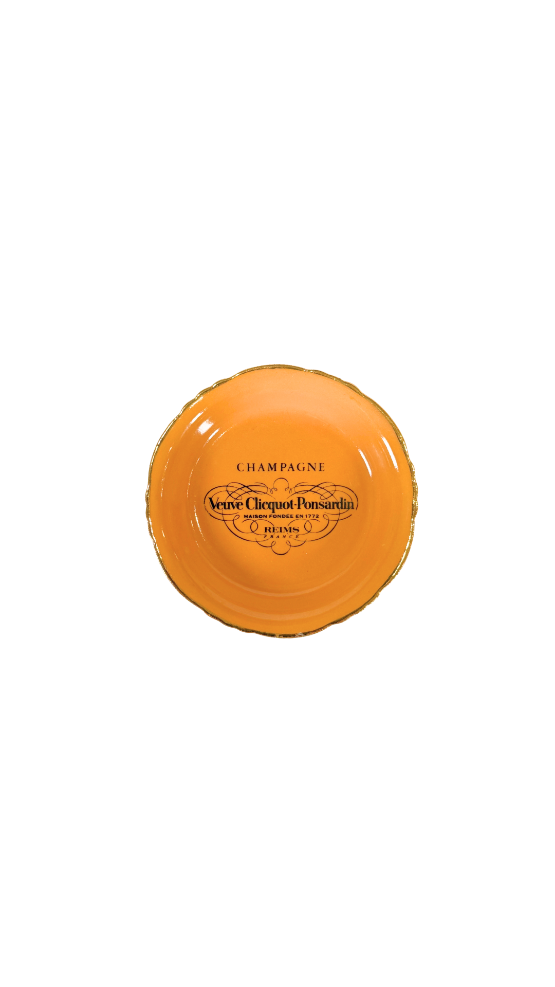 A striking French advertising ashtray produced for Veuve Clicquot-Ponsardin, one of the most prestigious and enduring Champagne houses in France. Rendered in the house’s iconic warm orange glaze and edged with a delicate gilt rim, the front is boldly marked Champagne Veuve Clicquot-Ponsardin, Maison Fondée en 1772, Reims, France—a design immediately recognizable to collectors and champagne enthusiasts alike.