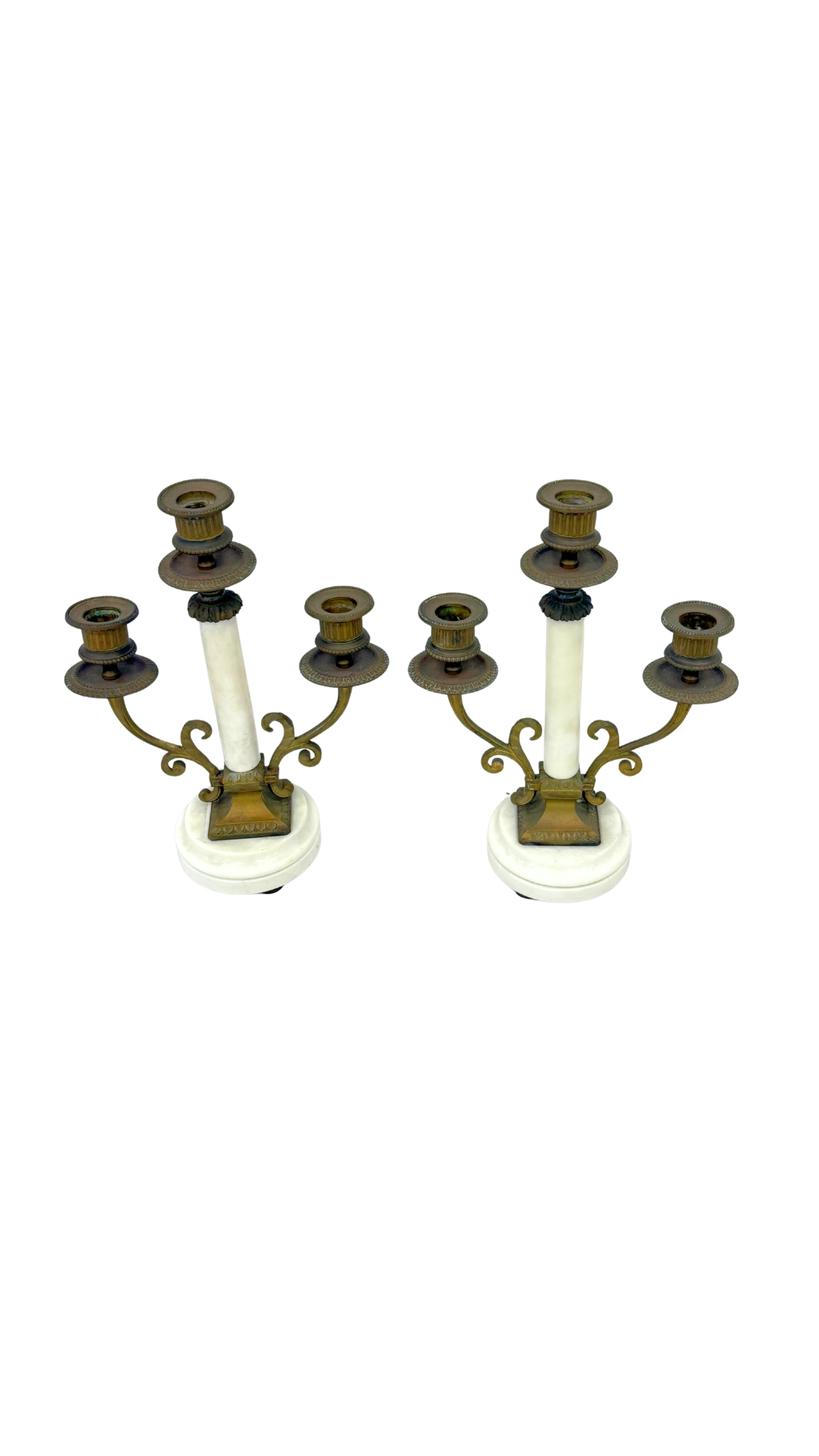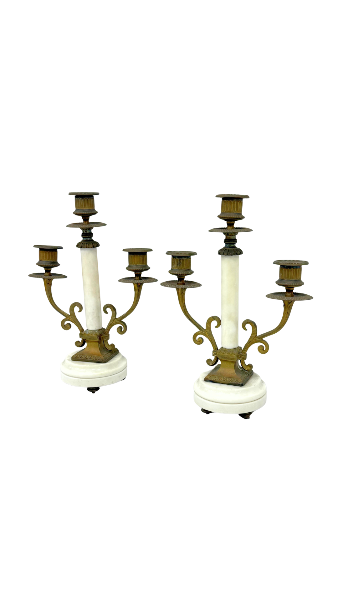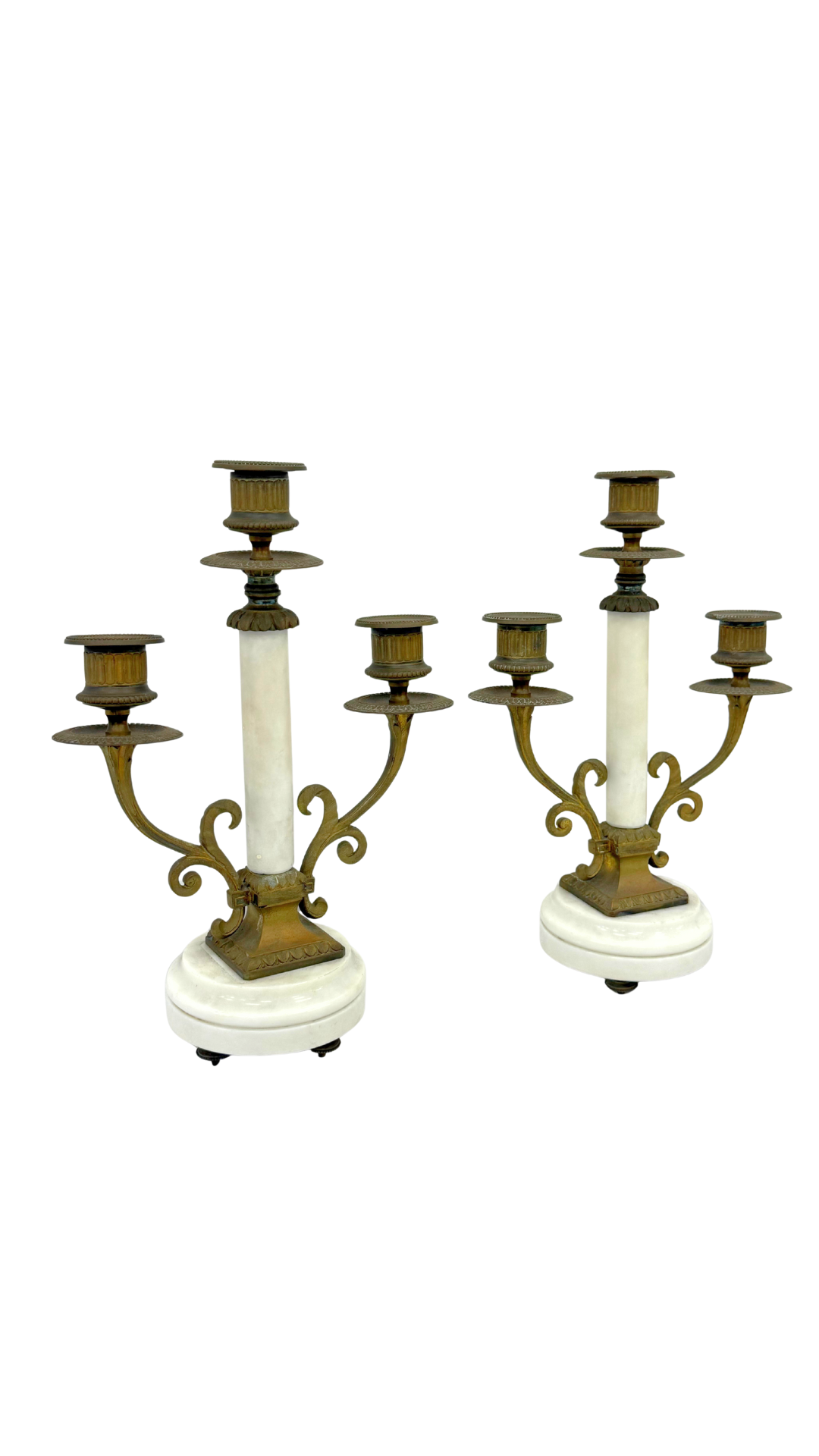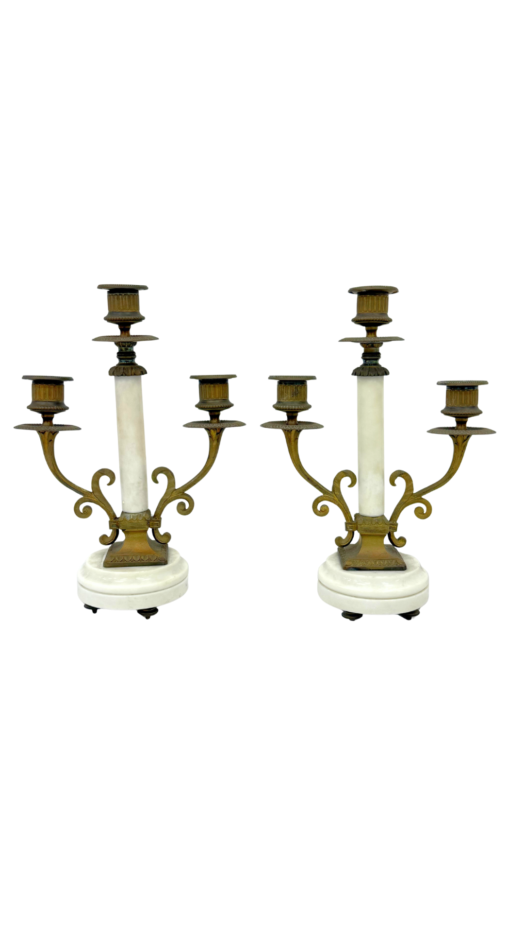Elegant and architectural, this pair of antique French candelabras is crafted from finely cast bronze and creamy alabaster. Each holds three taper candles and features a columnar center with sweeping scrolled arms. All resting on a circular alabaster base with bronze feet.