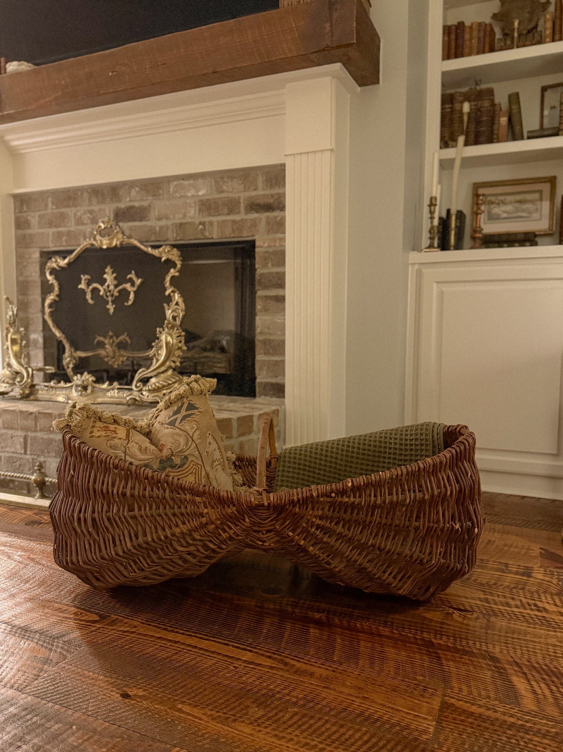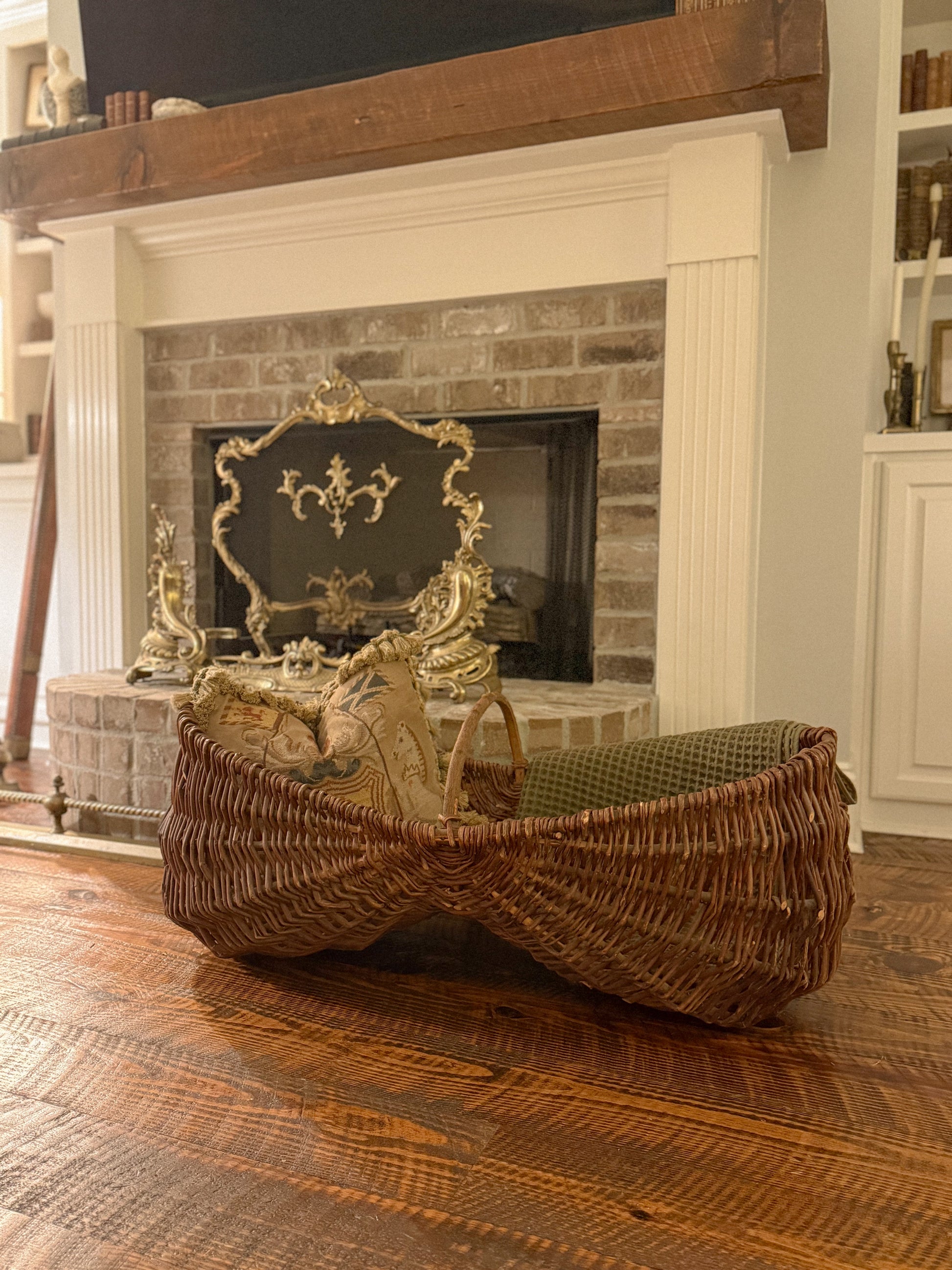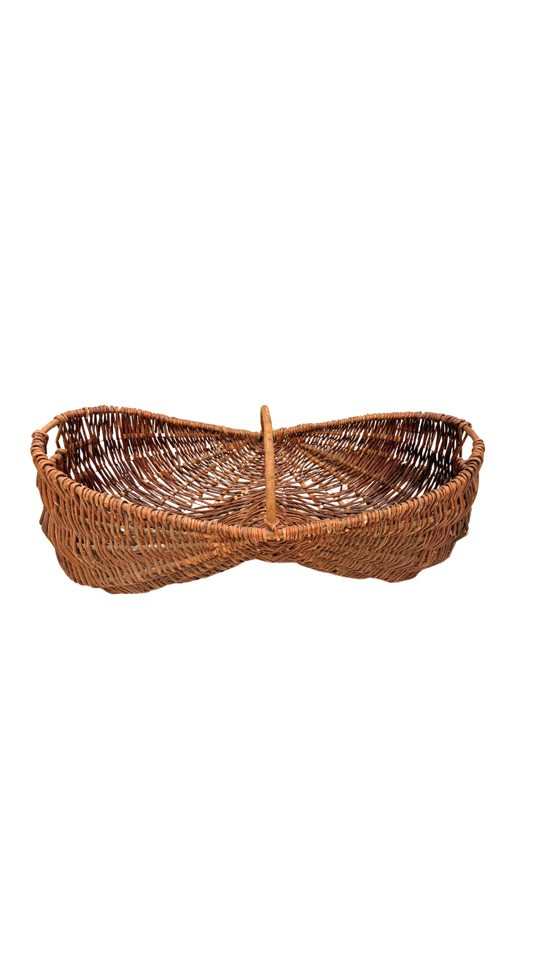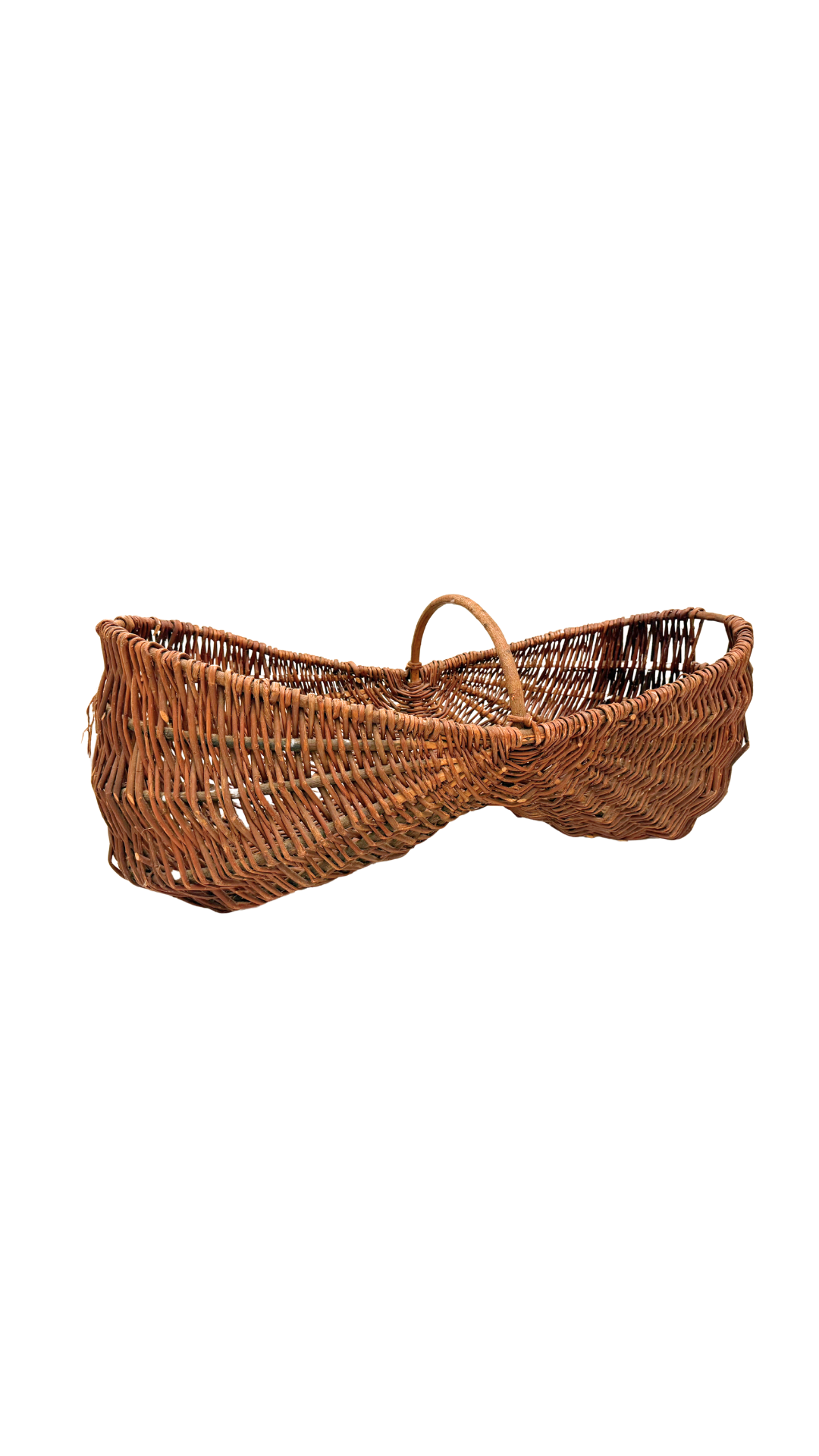 A truly exceptional find—this oversized buttock basket is hand-woven from natural reed and measures over three feet across. The dramatic hourglass form and arched handle give it that classic silhouette, while the scale and craftsmanship elevate it to a sculptural showpiece. The reed has beautiful texture and movement throughout, with a tight, symmetrical weave that holds its shape effortlessly. In excellent condition. Whether styled with branches, textiles, or left completely bare, it commands attention in any space.