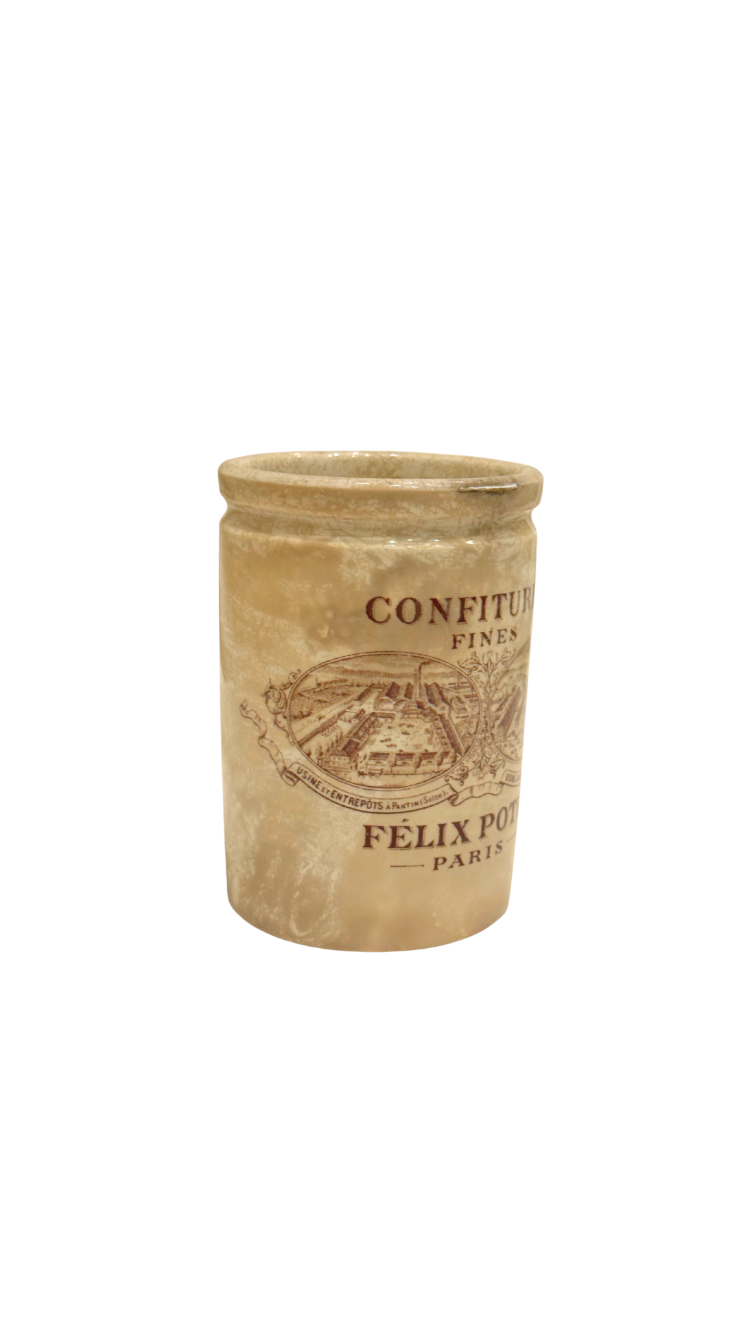 An authentic antique French confitures jar from the iconic Félix Potin, one of Paris’s most celebrated épiceries of the late 19th and early 20th centuries. This ceramic advertising jar features the classic Félix Potin transfer in warm sepia tones, depicting the firm’s Parisian facilities and proudly stamped “Confitures Fines – Félix Potin – Paris.”