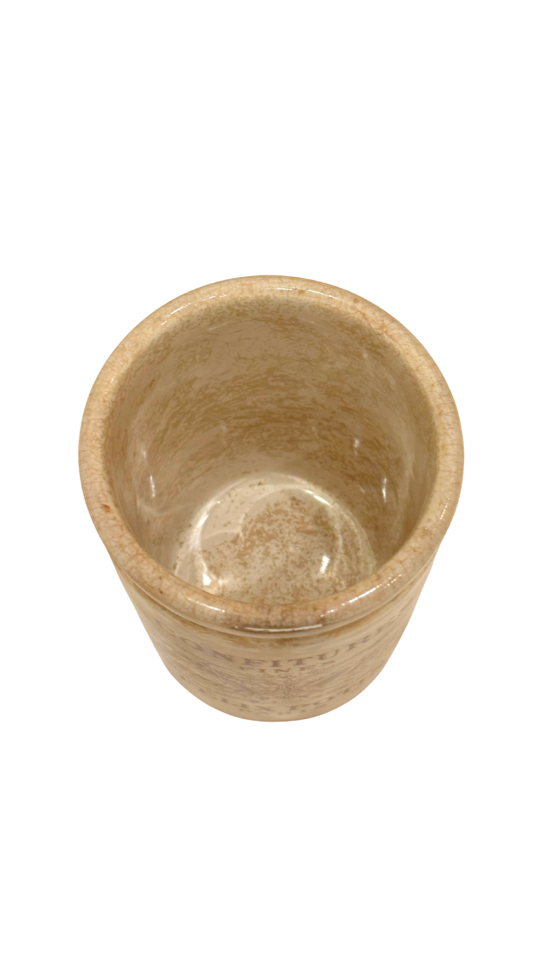Good antique condition consistent with age and use. Visible interior glaze wear, surface mottling, and kiln marks to the base, all typical for utilitarian advertising jars of this era. No cracks or repairs noted. Wear is purely cosmetic and contributes to the piece’s honest, storied character. Please review images closely, as they form part of the description.