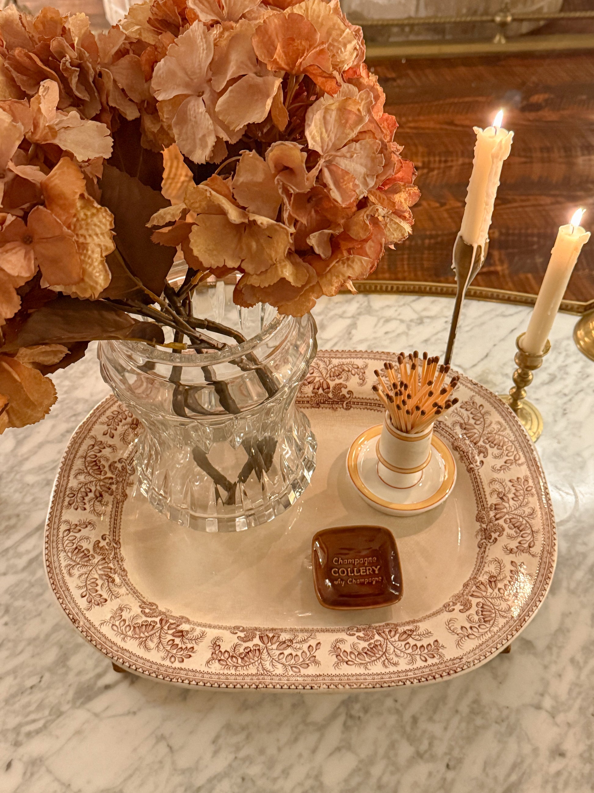A beautifully aged 19th-century English ironstone transferware platter, sourced in Louisiana and showcasing the warm, storied character collectors adore. The rich brown botanical transfer pattern frames the piece with Victorian elegance, while the creamy ironstone body has developed a gorgeous web of fine crazing — completely authentic to its age.