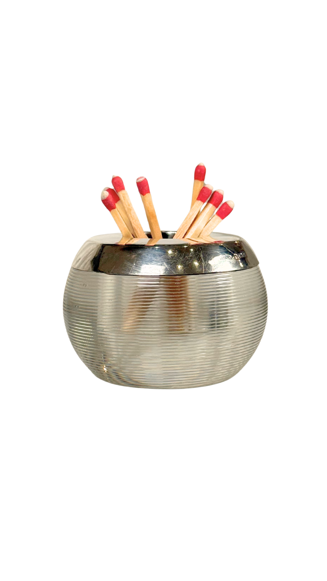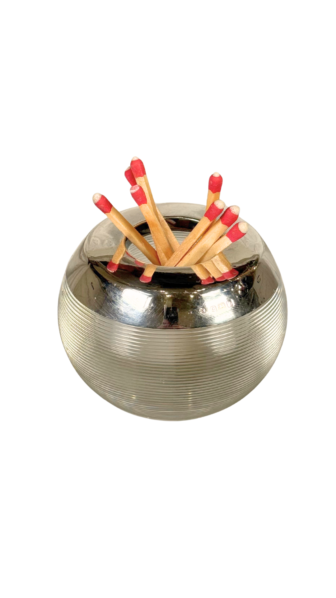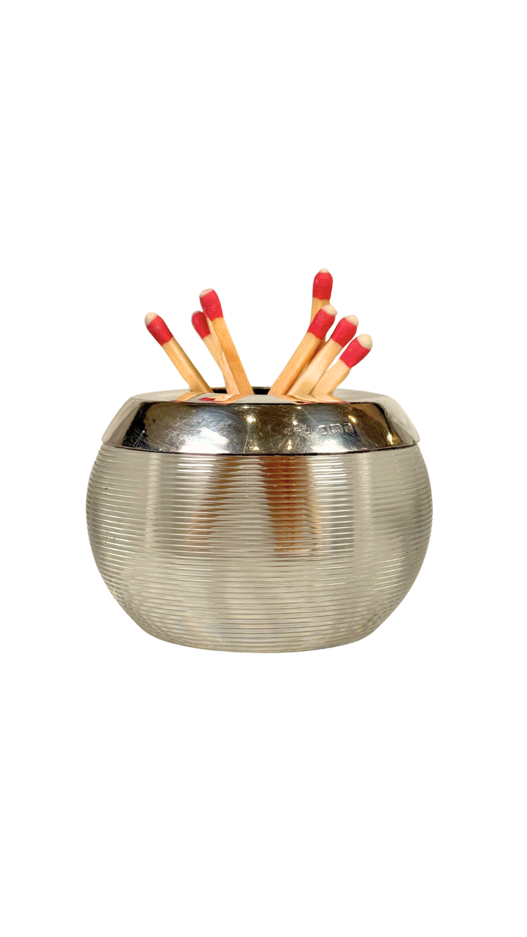 A finely crafted antique sterling silver (MARKED) match striker, also known as a pyrogène, featuring a rounded form with horizontal reeding and a fitted silver lid pierced to hold matches upright. The interior retains its original striker surface, designed for lighting wooden matches in daily use.