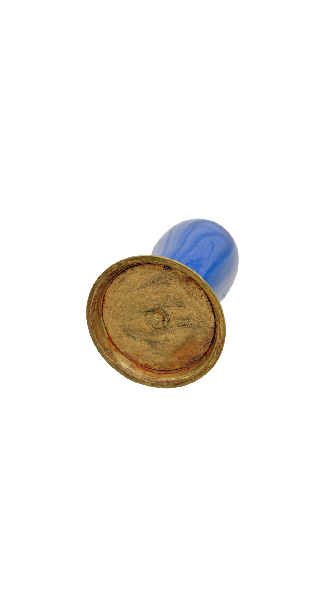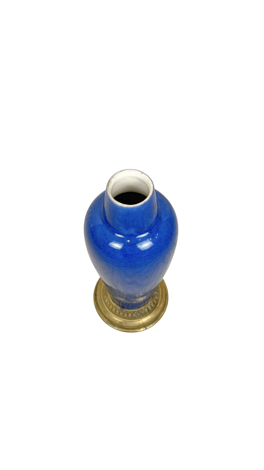 A striking French porcelain vase finished in a rich cobalt glaze and mounted on a detailed gilt bronze base. The form is classic and architectural — gently tapered with a narrow neck — allowing the color to take center stage while the ormolu mount adds a quiet touch of formality.
