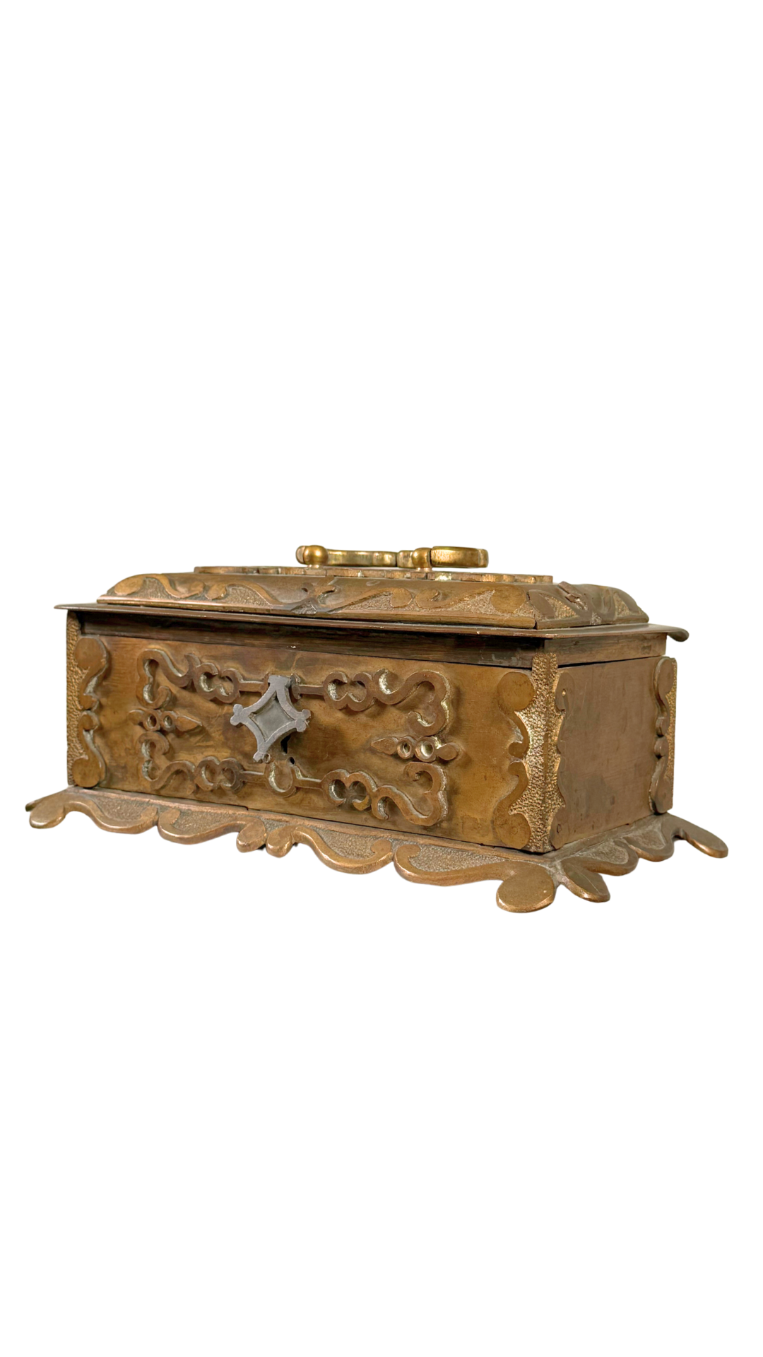 A beautifully weighty antique bronze casket box with rich surface patina and deeply worked detailing throughout. This piece features pierced and applied scrollwork, a raised lid with decorative handle, and sculptural feet that give it a grounded, architectural presence.
