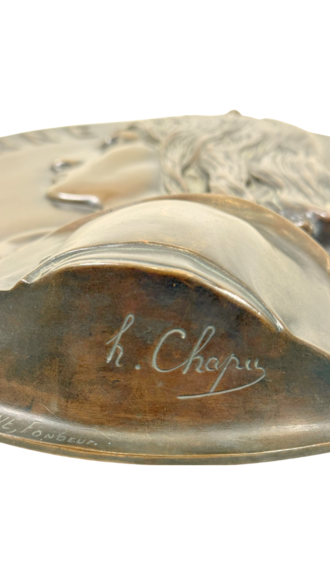 The sculptural relief showcases Chapu’s refined academic style—softly modeled facial features, flowing hair, and armor rendered with subtle realism. The bronze has developed a warm, time-earned patina that enhances the dimensionality of the portrait.