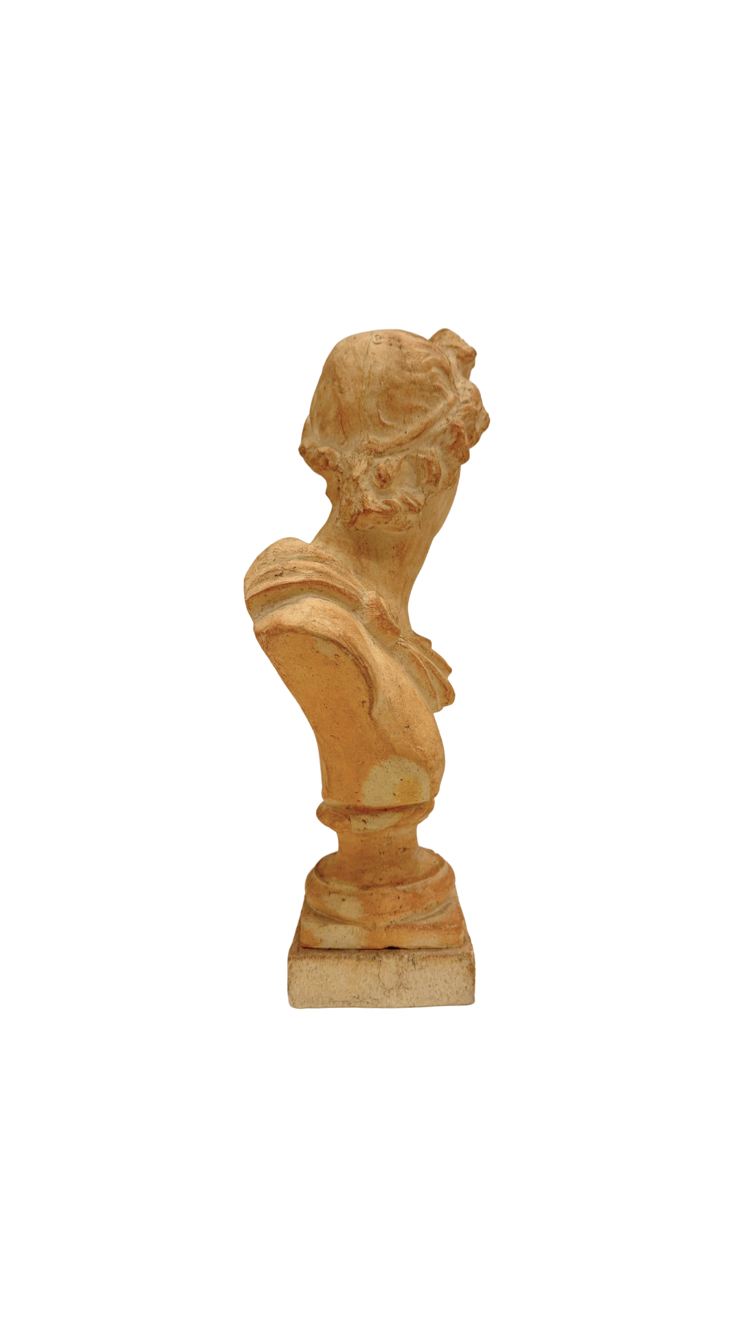A striking terracotta classical-style bust by Atelier Michel Cayla, known for their finely modeled sculptures inspired by Greco-Roman antiquity. This piece features beautifully rendered curls, a softly draped garment, and a graceful turned profile, all resting on a stepped pedestal base.