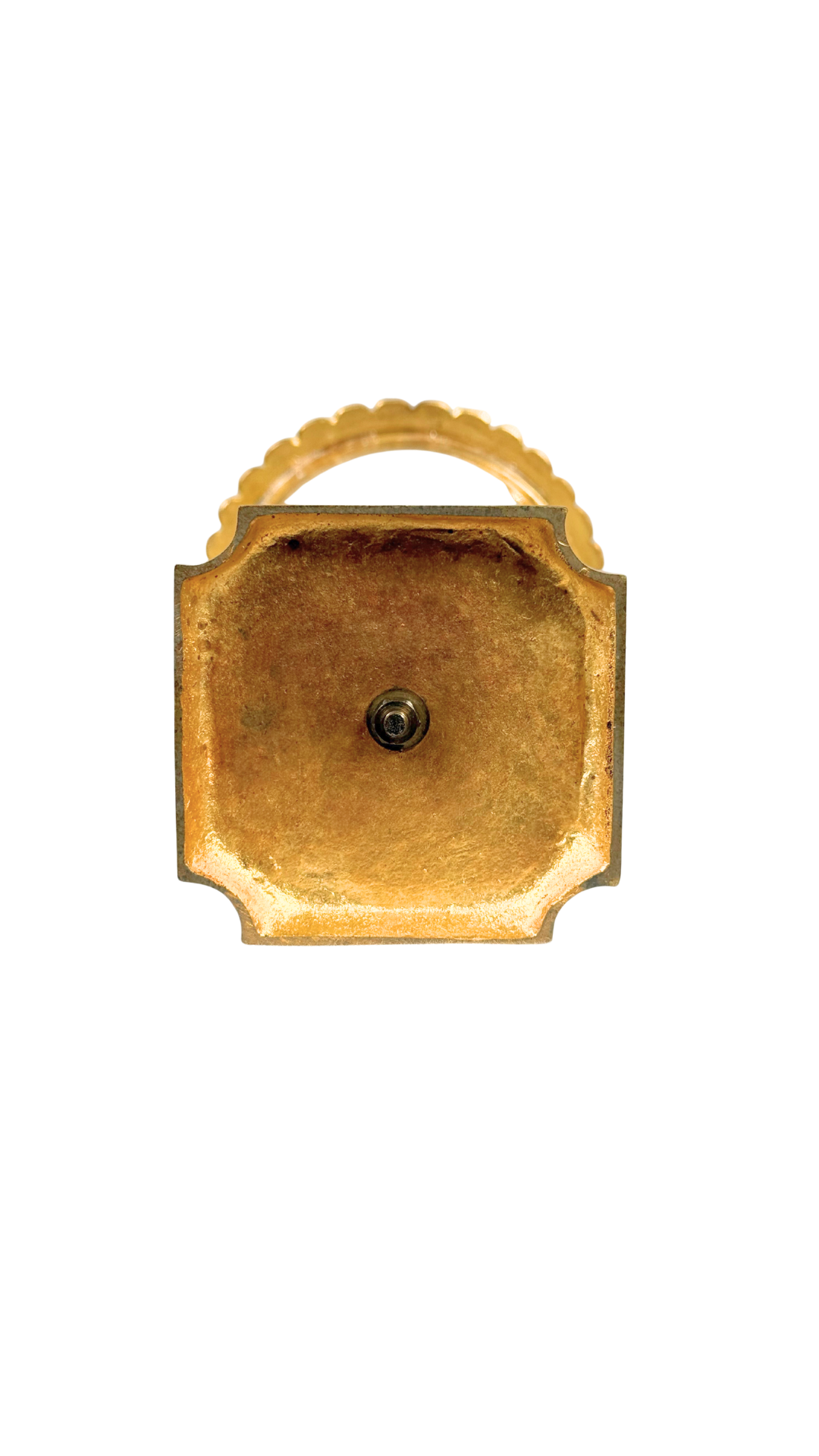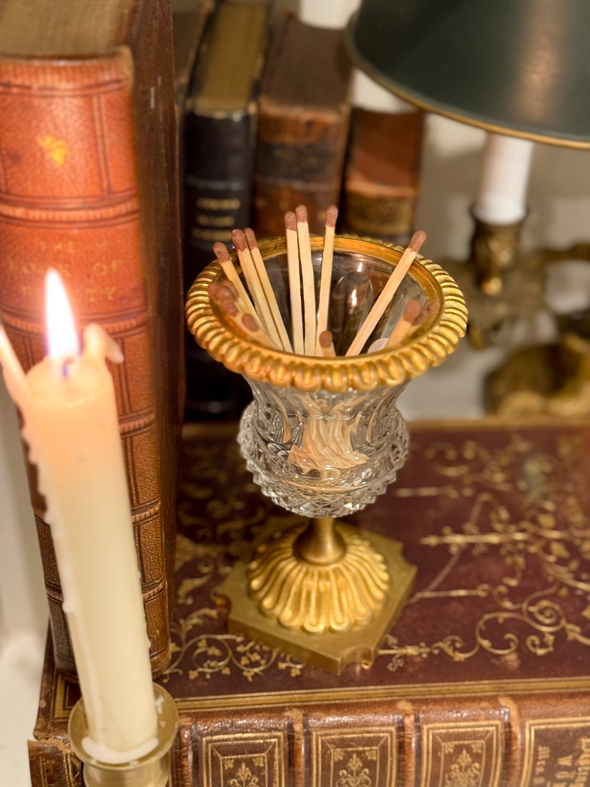 Raised on a fluted bronze stem and square base, the silhouette is classic and well balanced—decorative yet restrained. Originally intended as a small decorative vase or ornamental urn, it now lends itself beautifully to styling on a mantel, bookshelf, or tabletop. Currently shown with matches for scale and styling, though the piece was not originally intended as a match holder.