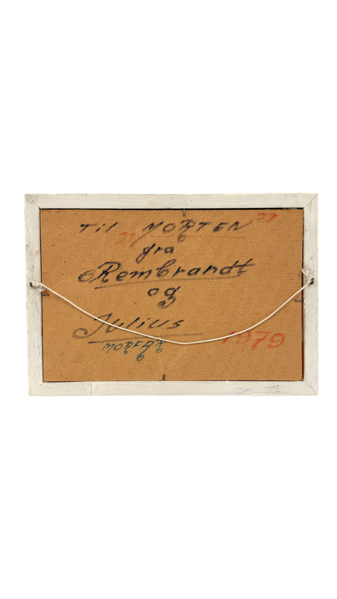 The back reveals a handwritten inscription reading “To Morten from Rembrandt and Julius Moreaux, 1979,” suggesting this was originally given as a gift — adding a personal, storied layer to the piece.