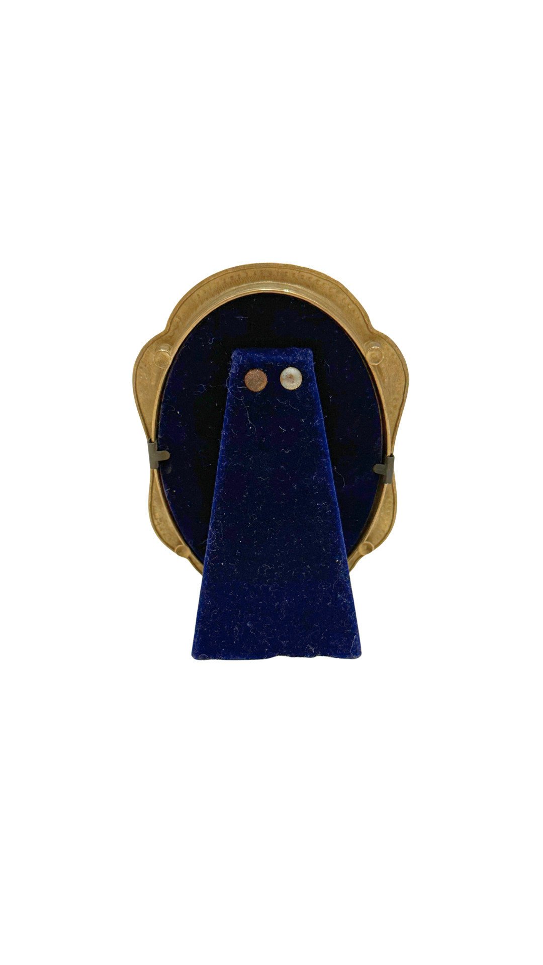 A delicate French oval frame, cast in gilt metal with softly scrolling details and a petite inner aperture. The original paper backing features faded French script, adding quiet texture and age without overpowering the piece.