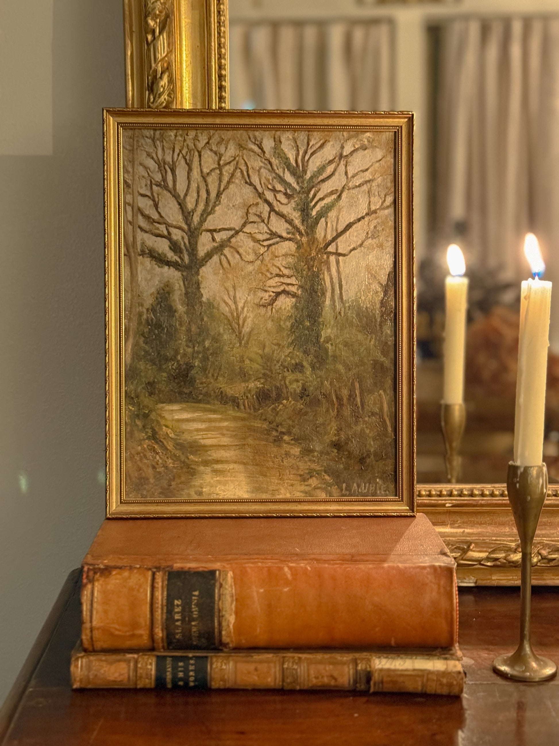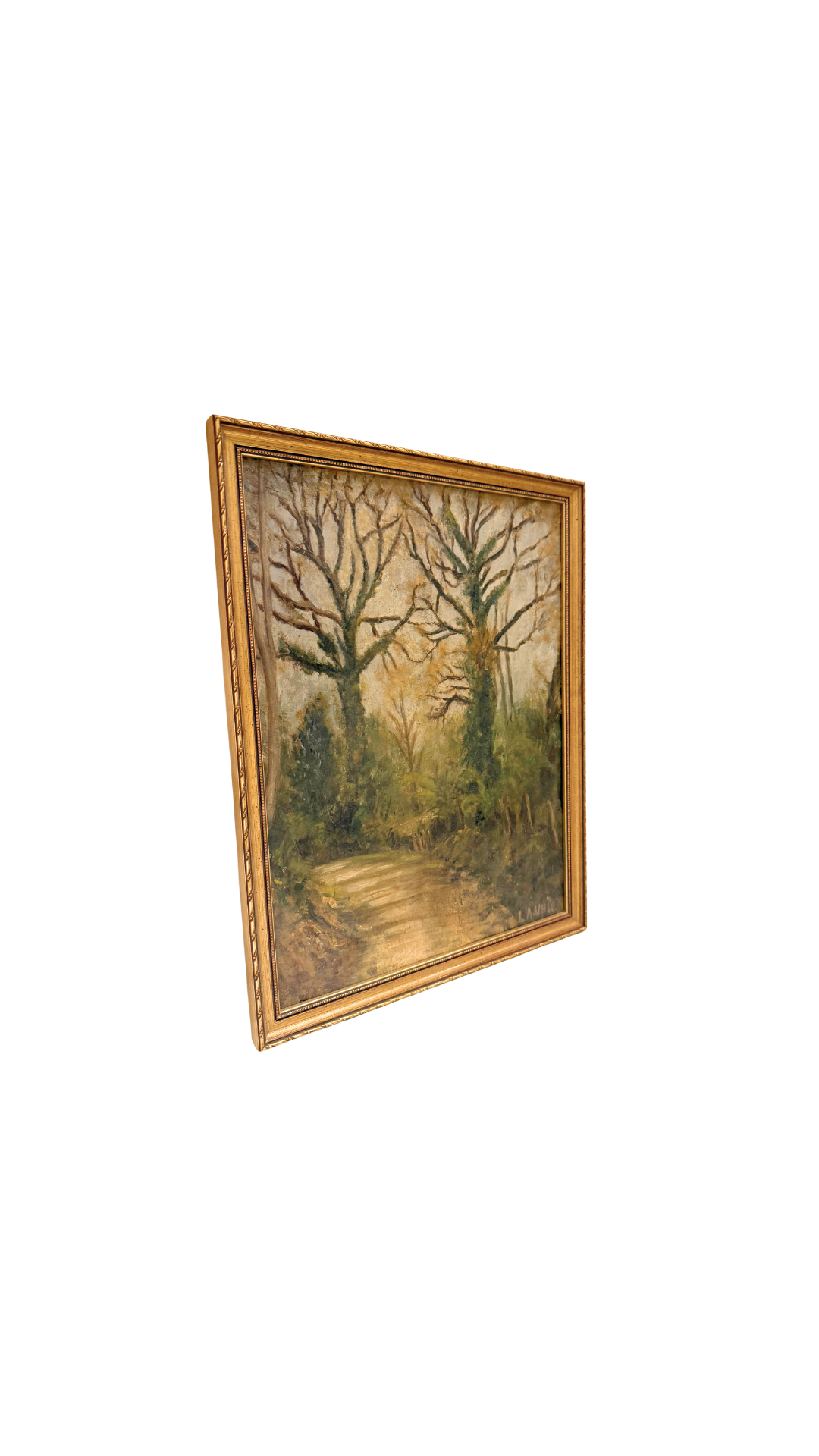 A serene French woodland captured by the hand of Laubie, this early 20th-century oil painting brings quiet beauty and depth to any space. The scene follows a winding dirt path bordered by towering, leafless trees draped in ivy—an atmospheric moment suspended between seasons.
