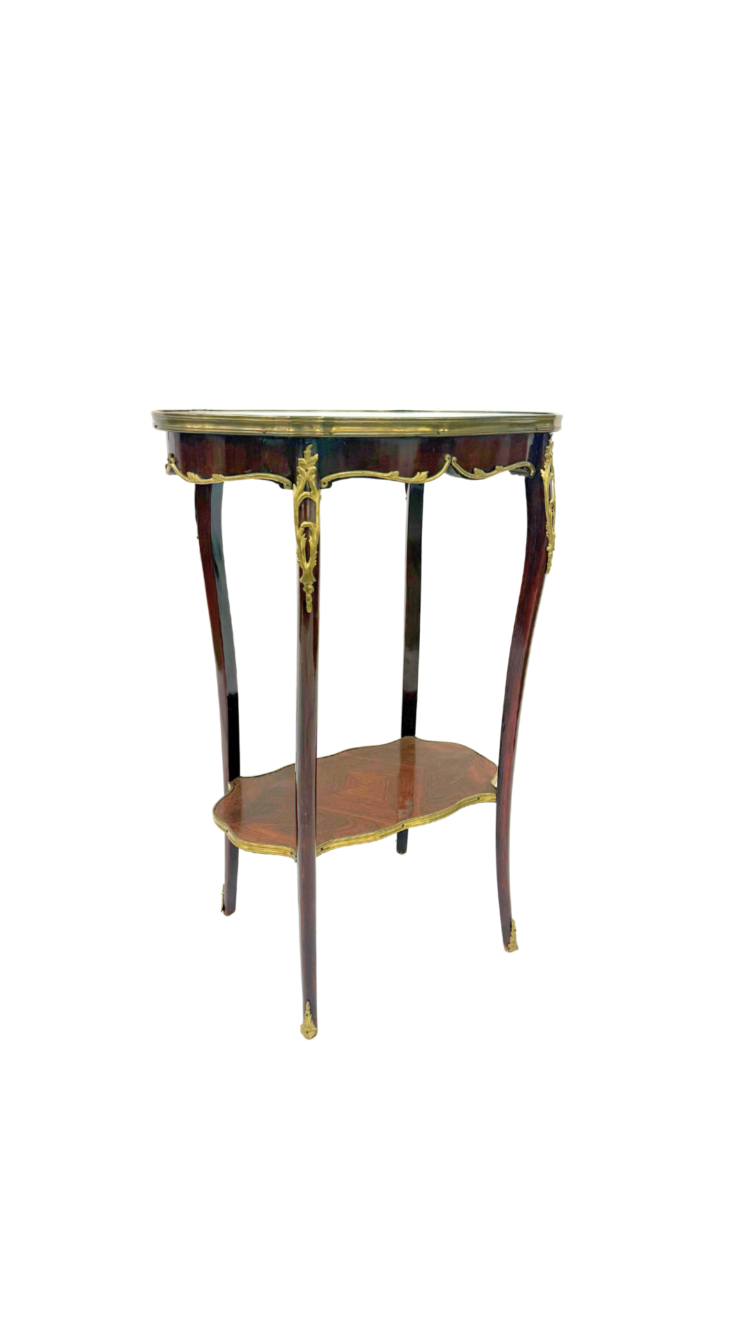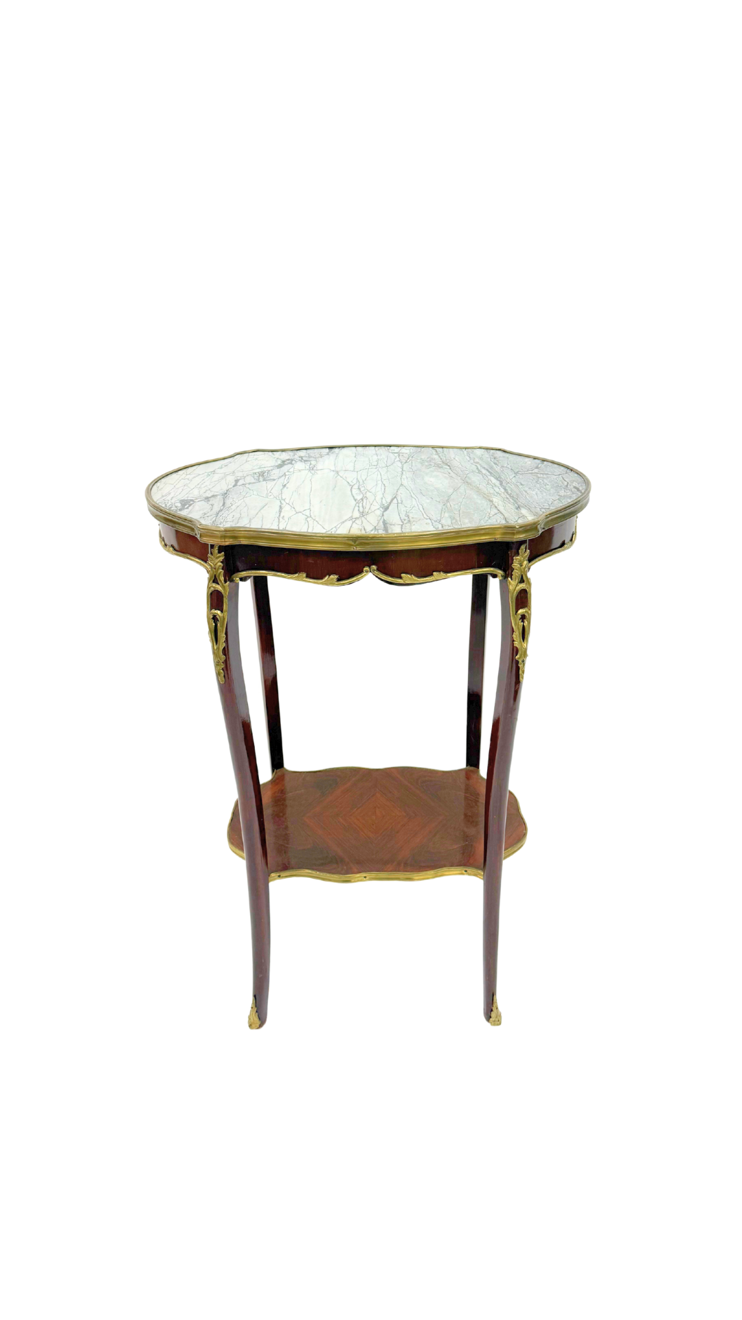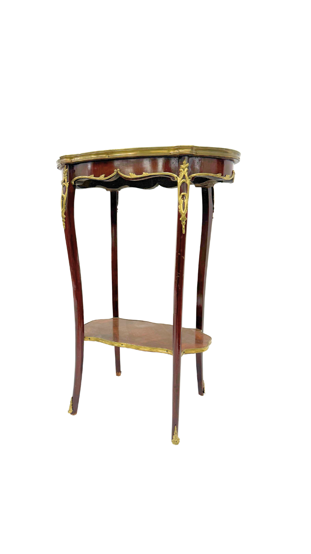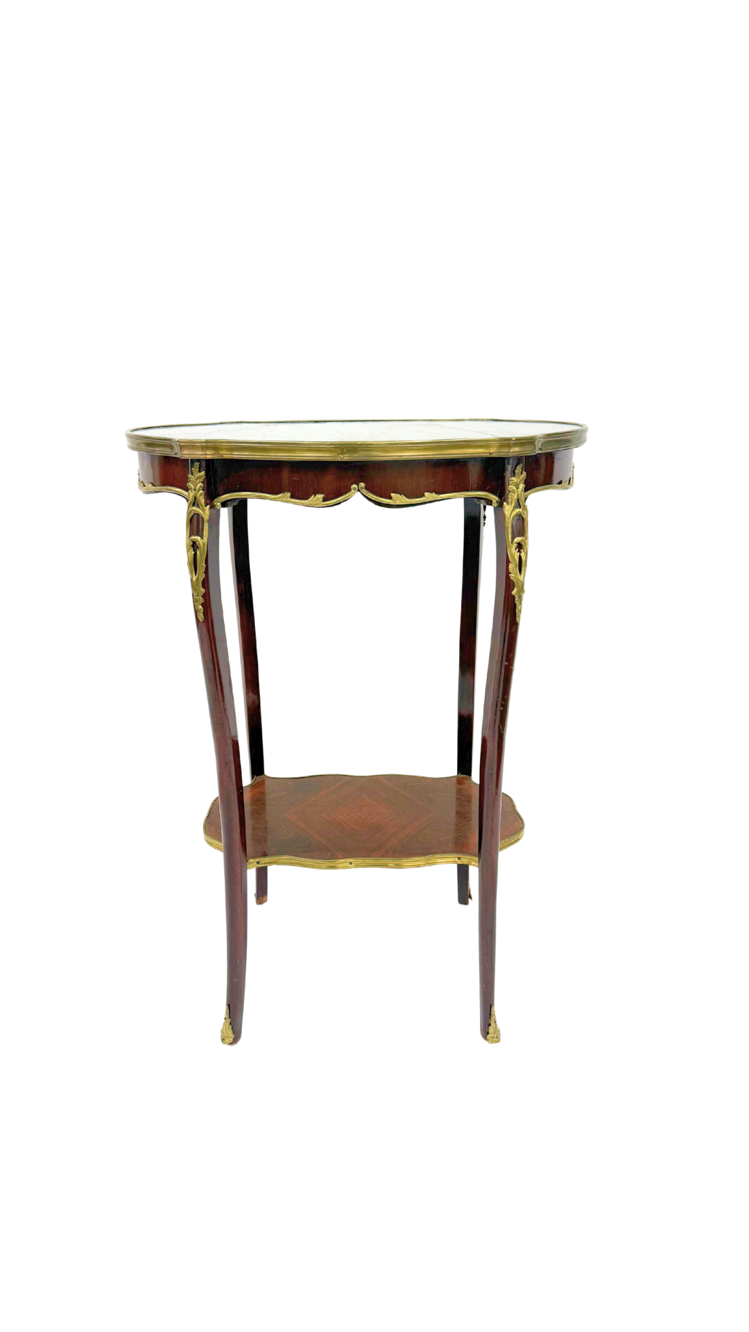 The dark mahogany frame is gracefully curved, resting on four slender cabriole legs adorned with gilt-bronze (ormolu) mounts at each knee and toe. These delicate accents add a soft shimmer and timeless contrast to the deep tones of the wood. The lower tier—a beautifully shaped shelf with inlaid parquetry—mirrors the top’s elegant curves, offering both function and symmetry. The combination of materials—marble, wood, and gilt bronze—brings both richness and restraint, making this table a versatile piece for hallways, salons, or beside a chaise.