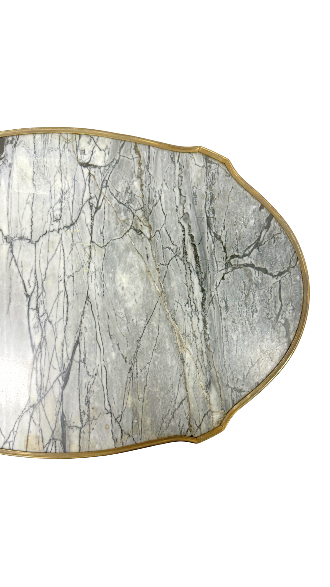 A refined example of French craftsmanship, this Louis XV-style side table features an elegant silhouette and beautifully layered details. The top is crowned with a richly veined gray marble, edged in a subtly contoured brass gallery that follows the gentle serpentine shape of the table’s frame, echoing the Rococo influences of the Louis XV period. The marble’s striking natural patterning introduces just the right amount of drama while remaining undeniably classic.