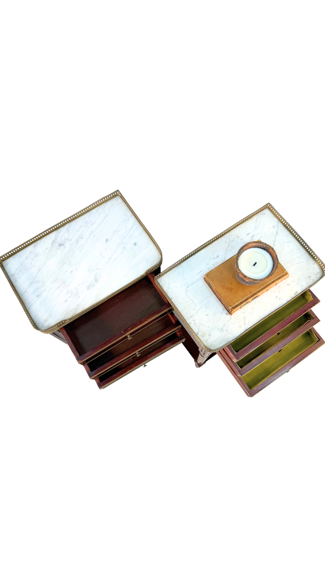 A refined pair of French Louis XVI–style nightstands, each crowned with its original white marble top and finished with a pierced brass gallery—classic details that bring an unmistakable French presence to any room. While sourced together, this pair is not identical, offering a collected, storied feel rather than a perfectly matched set.