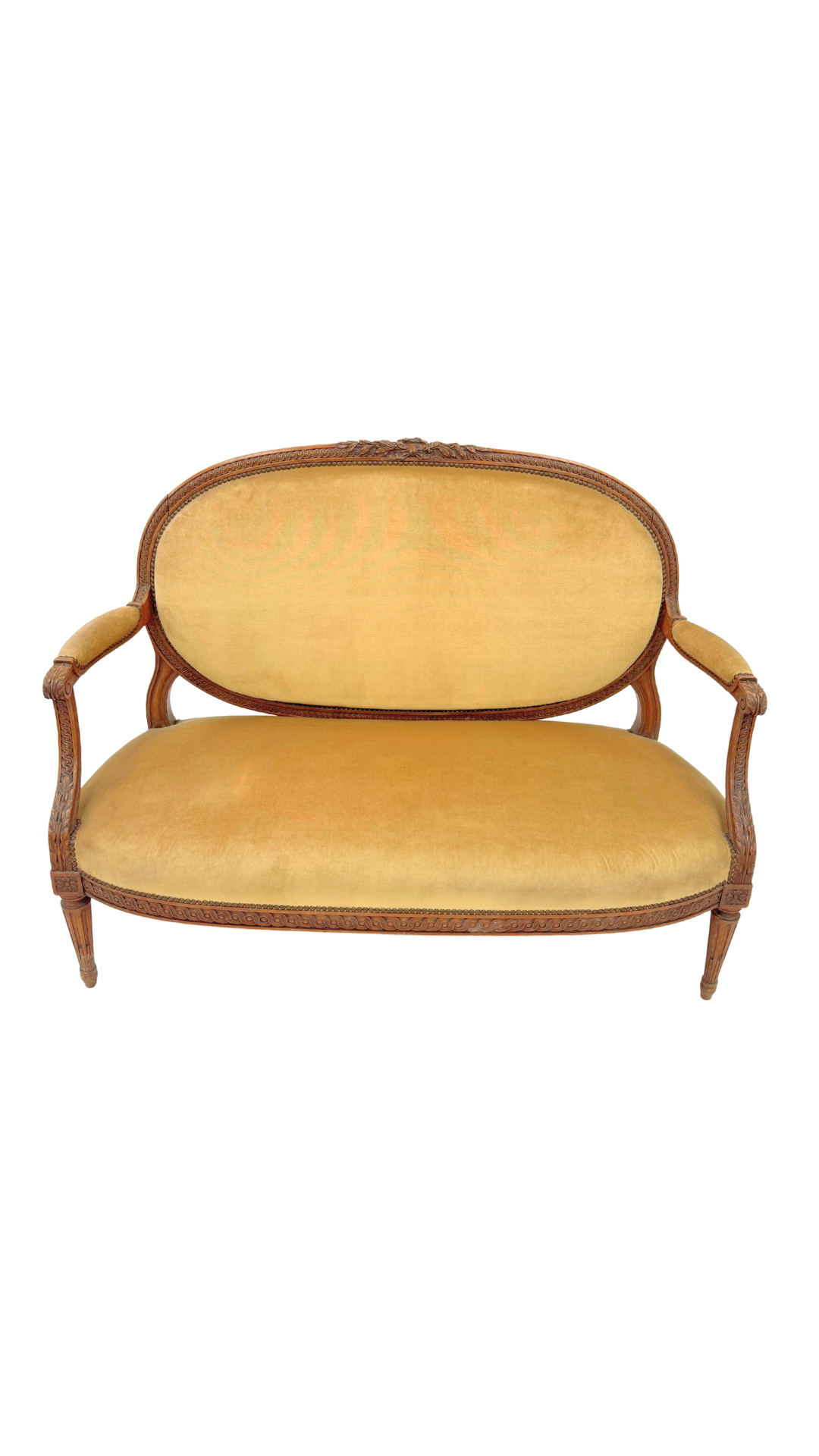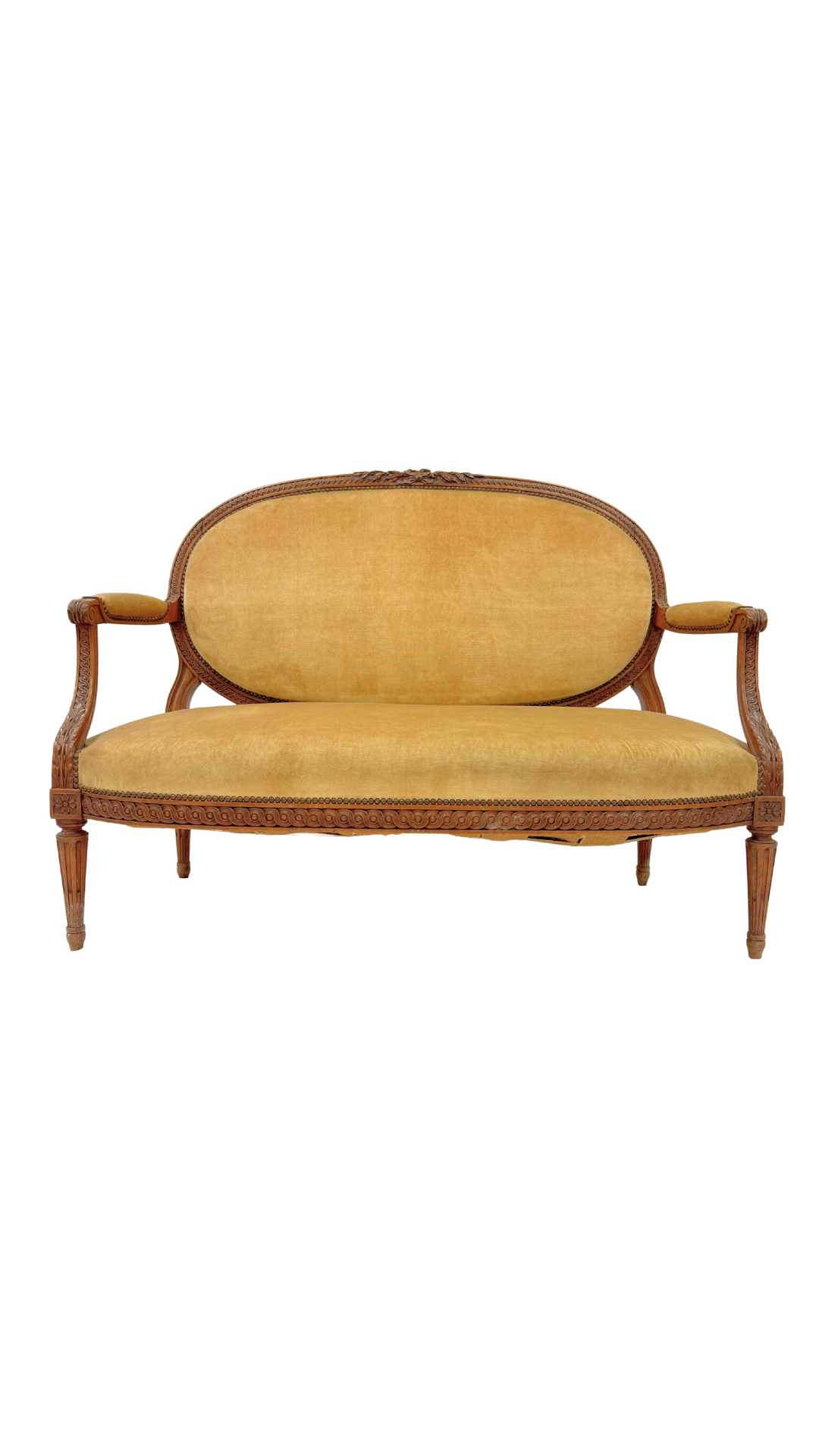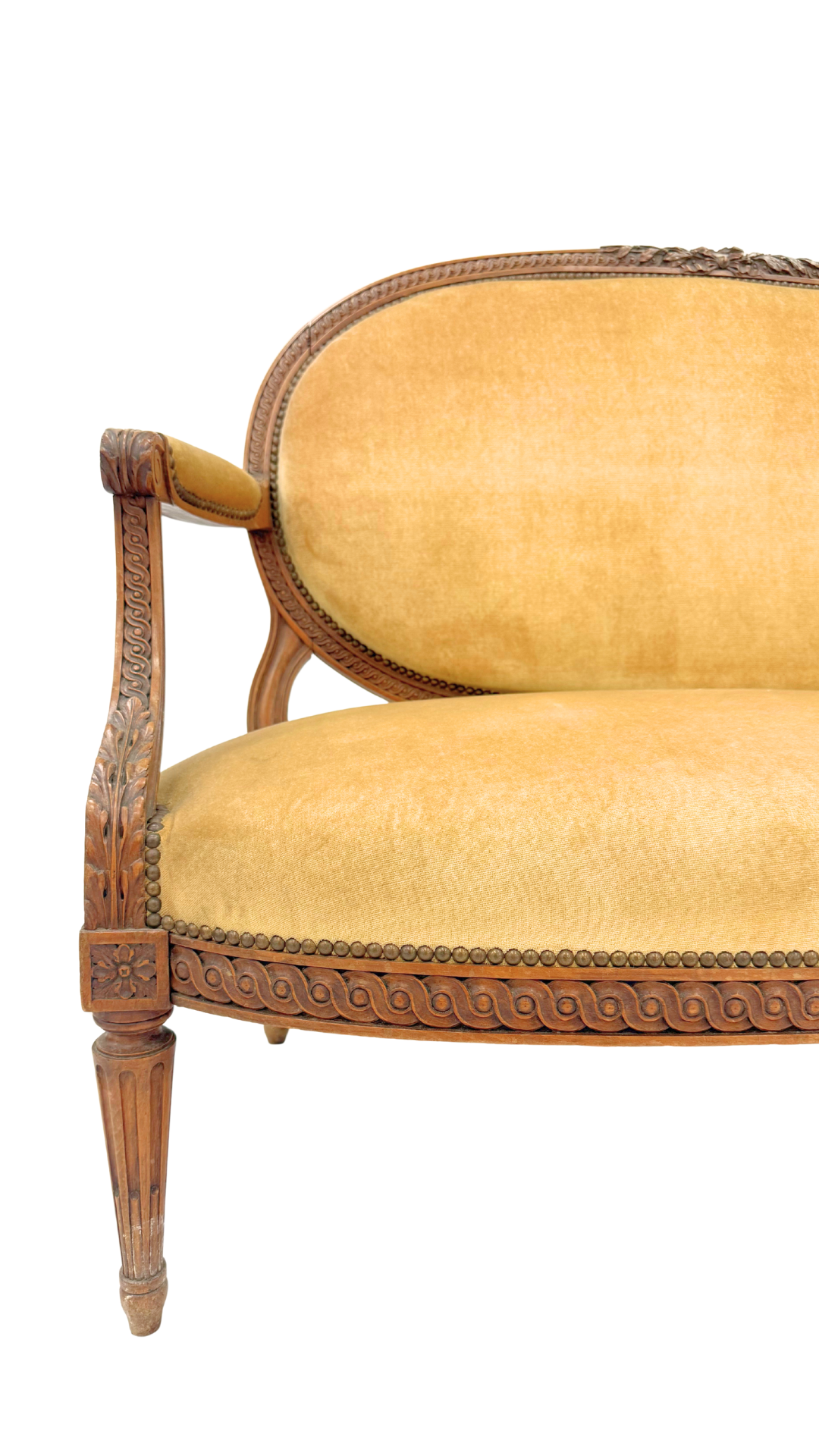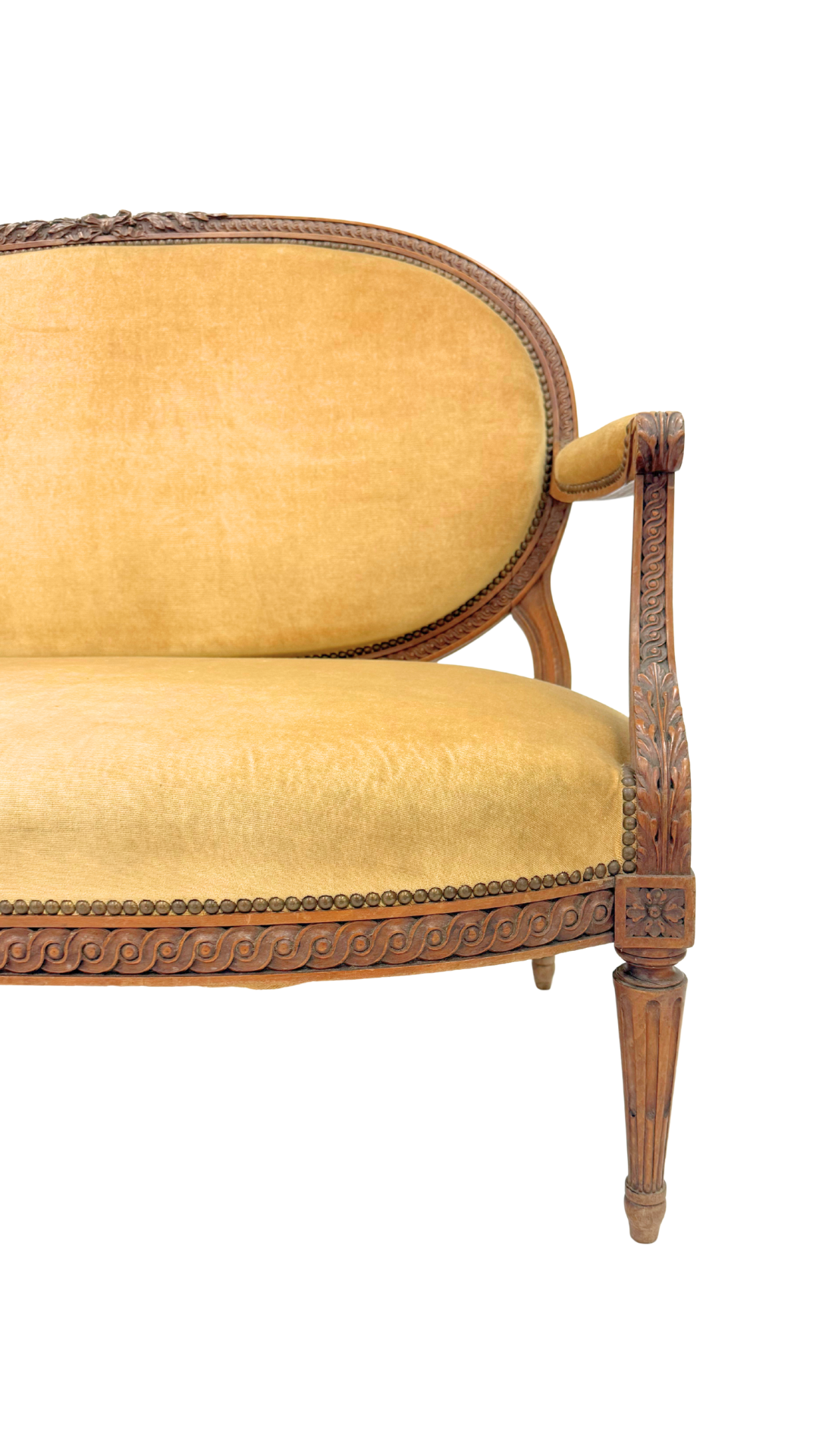 An elegant French Louis XVI style settee, beautifully proportioned with a carved beechwood frame featuring fluted legs, rosettes at each corner block, and subtle scroll arms. The frame showcases a warm, time-softened patina that highlights the craftsmanship of its period detailing. Upholstered in a classic neutral fabric, the piece balances refined formality with an inviting comfort, making it versatile for both formal salons and relaxed living spaces.