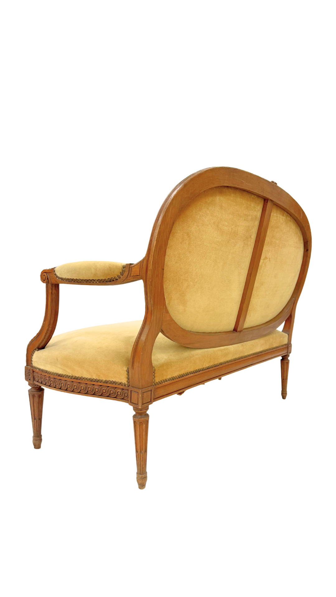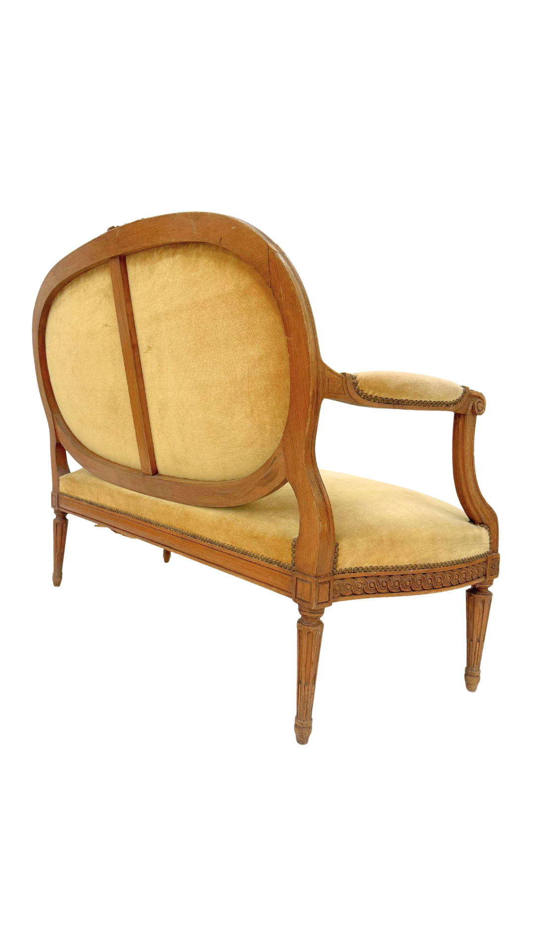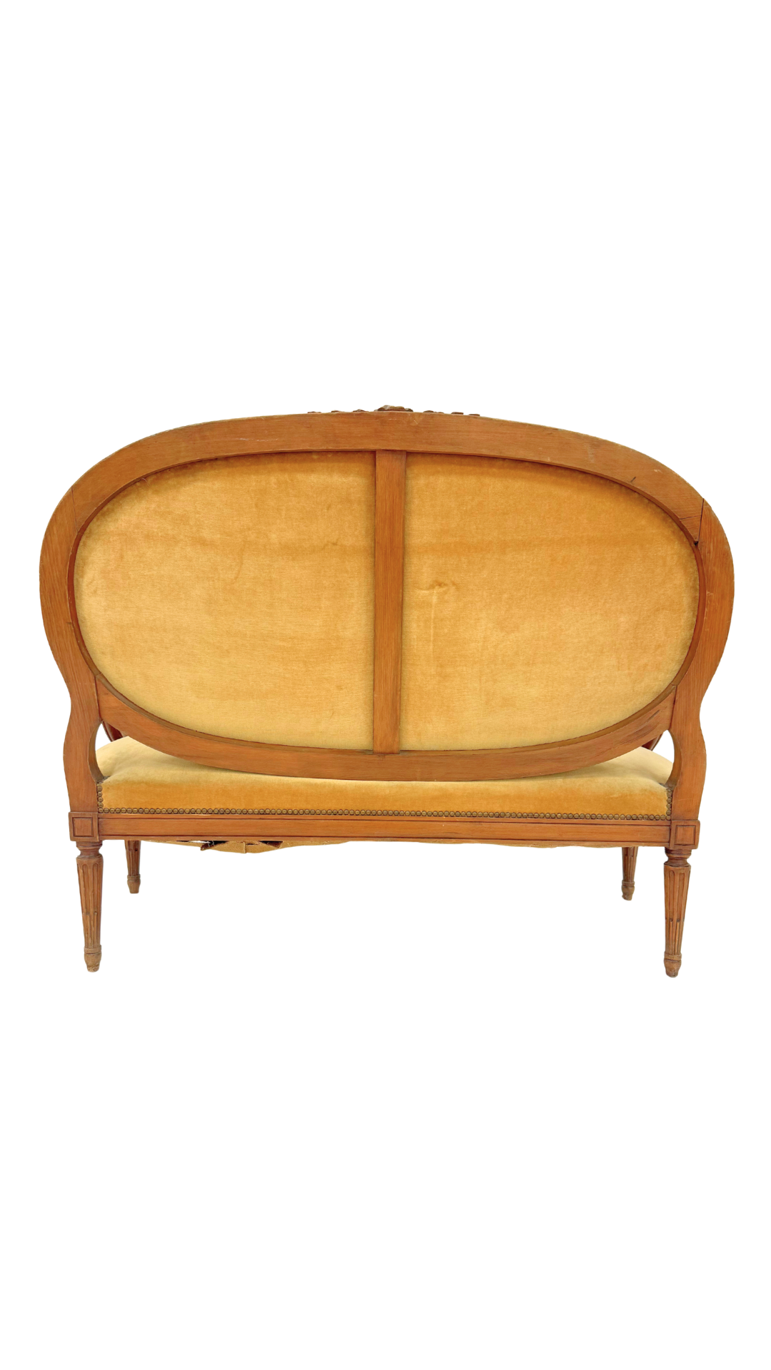 An elegant French Louis XVI style settee, beautifully proportioned with a carved beechwood frame featuring fluted legs, rosettes at each corner block, and subtle scroll arms. The frame showcases a warm, time-softened patina that highlights the craftsmanship of its period detailing. Upholstered in a classic neutral fabric, the piece balances refined formality with an inviting comfort, making it versatile for both formal salons and relaxed living spaces.