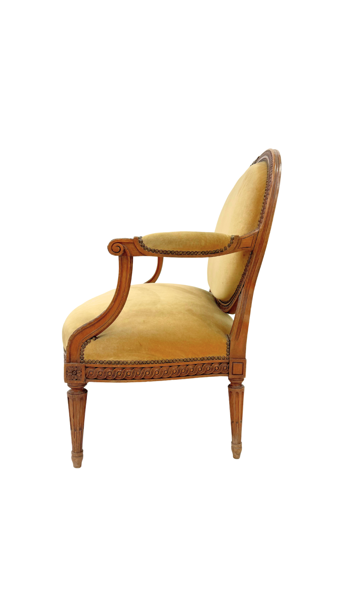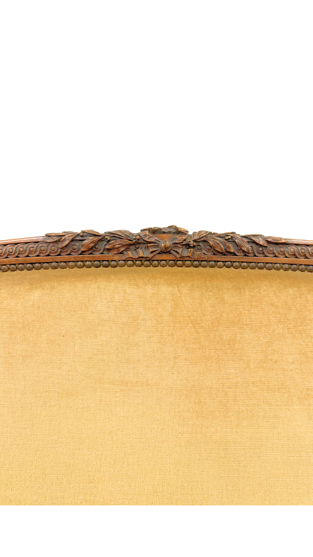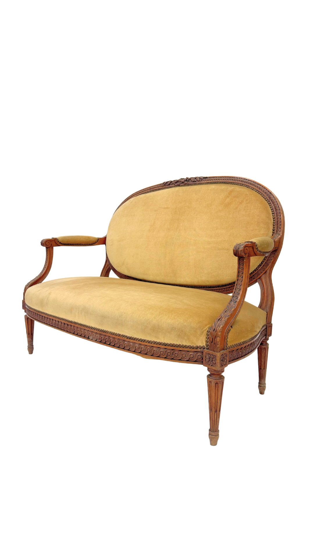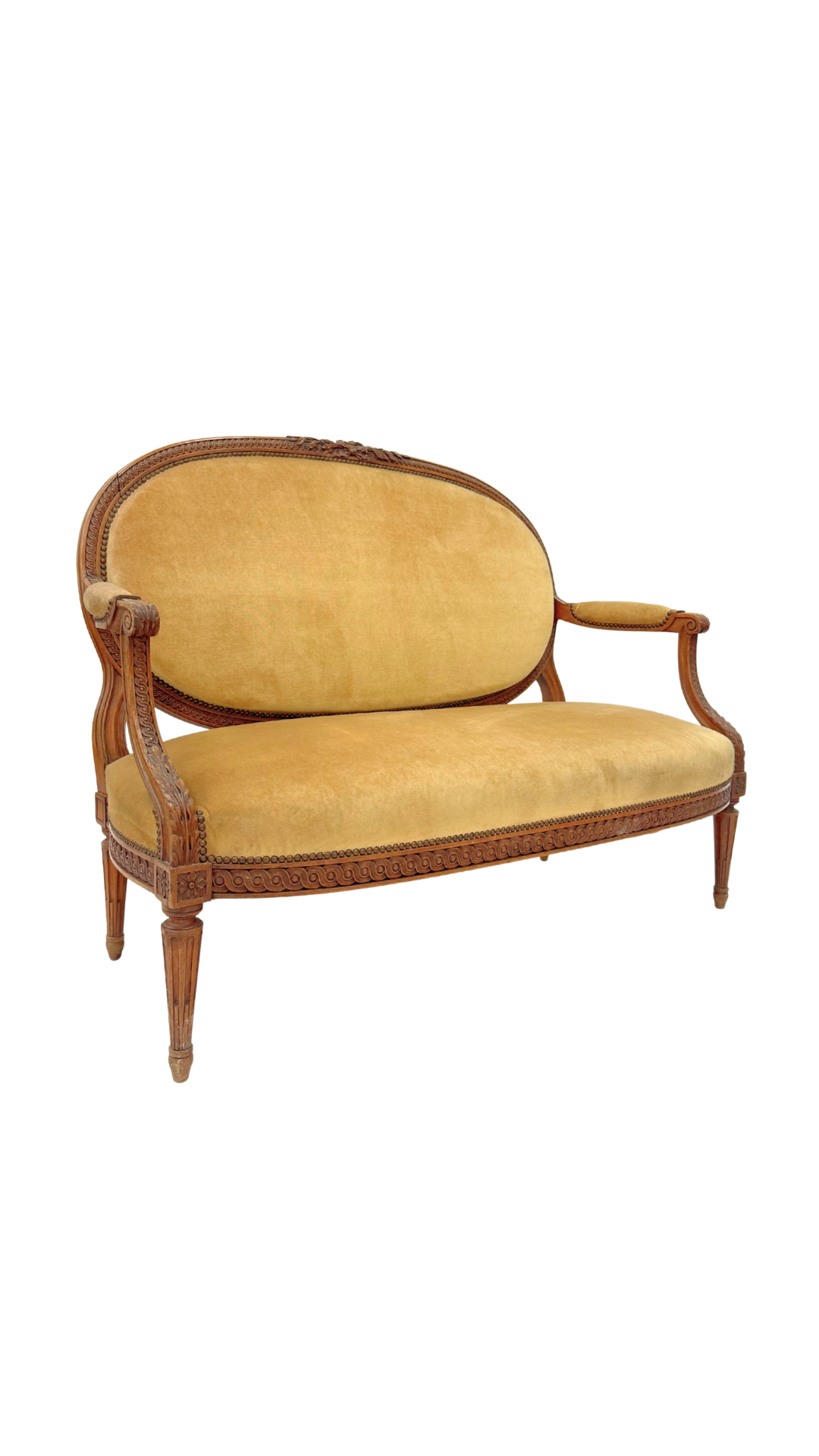 An elegant French Louis XVI style settee, beautifully proportioned with a carved beechwood frame featuring fluted legs, rosettes at each corner block, and subtle scroll arms. The frame showcases a warm, time-softened patina that highlights the craftsmanship of its period detailing. Upholstered in a classic neutral fabric, the piece balances refined formality with an inviting comfort, making it versatile for both formal salons and relaxed living spaces.