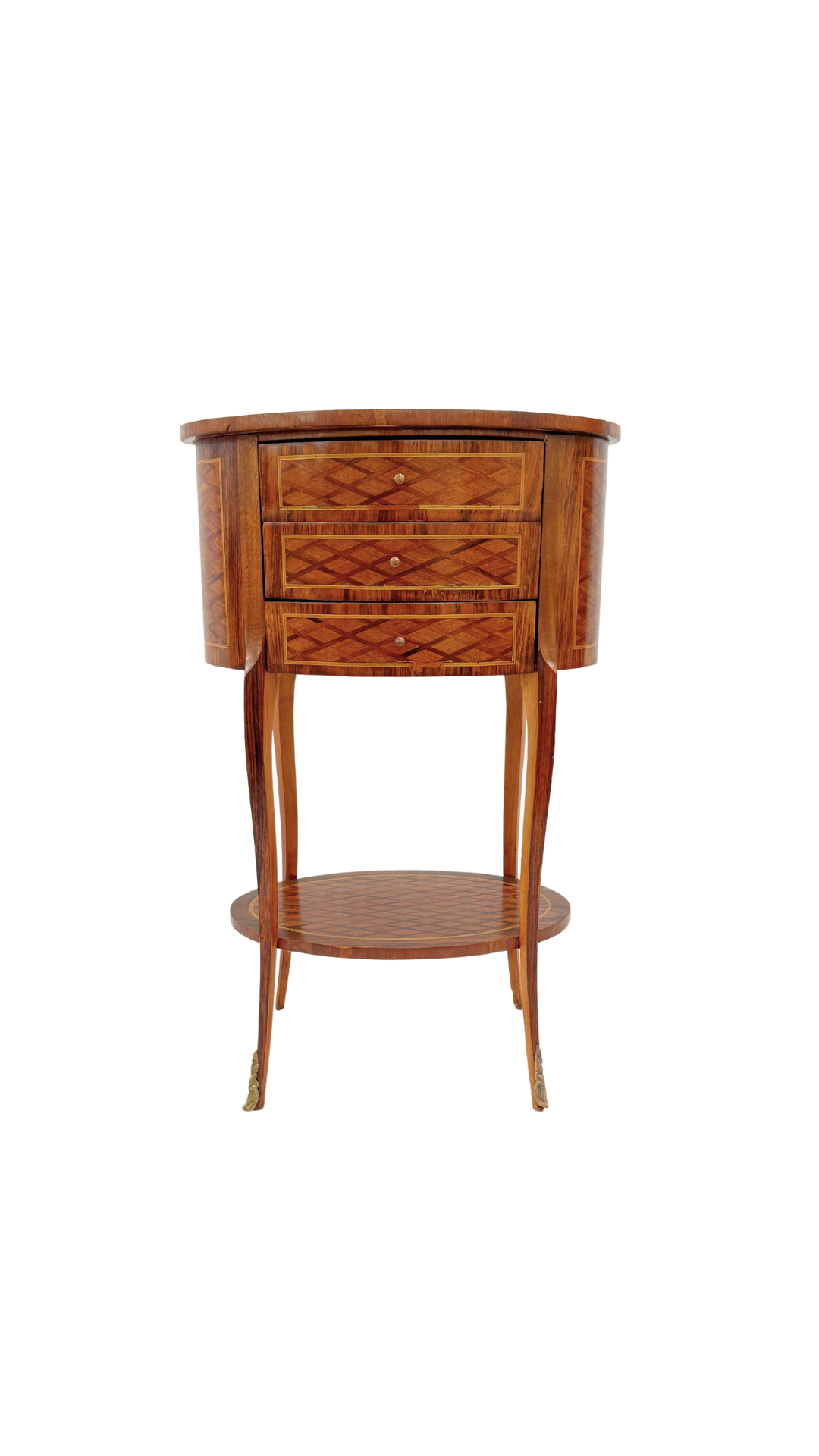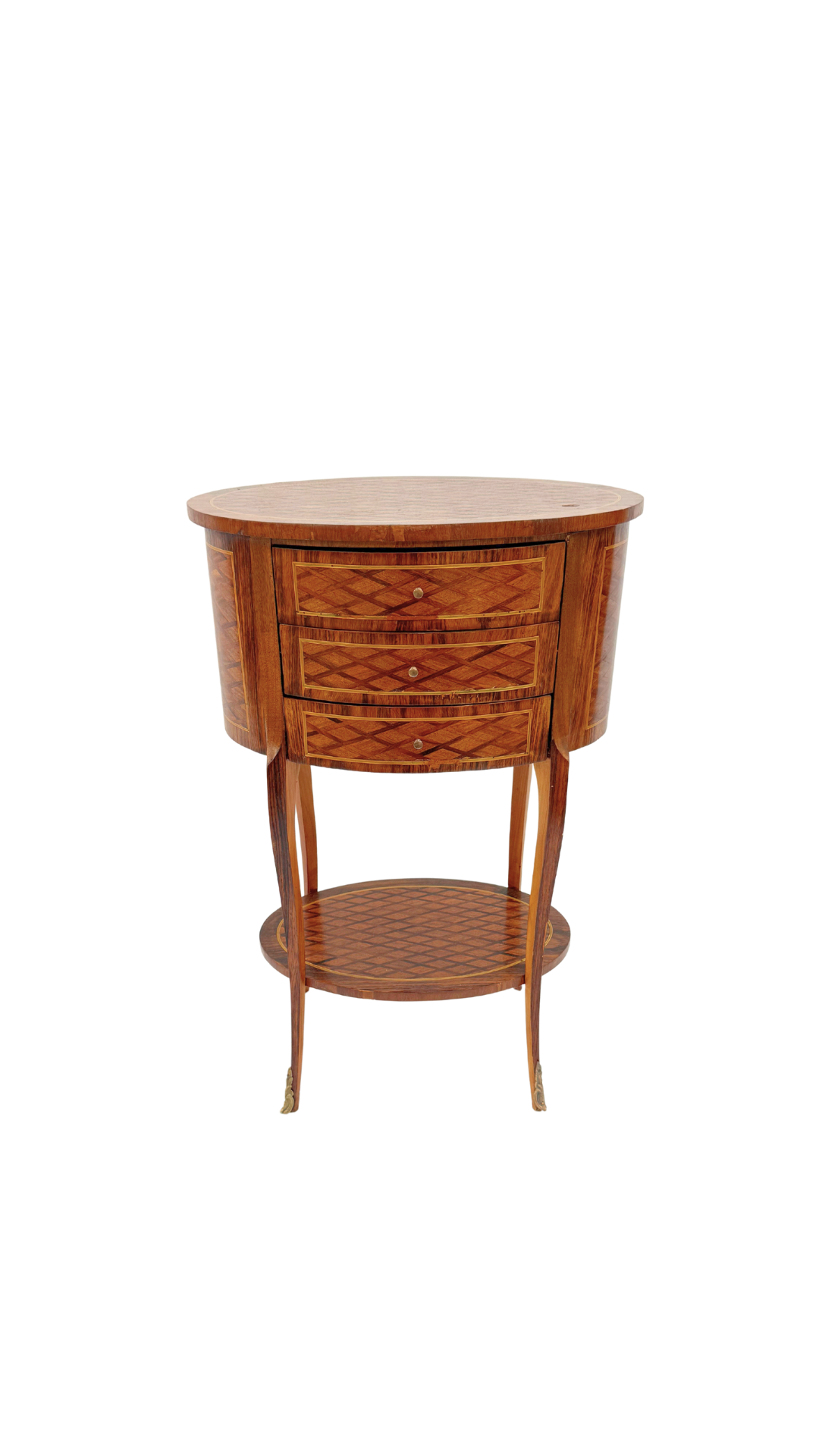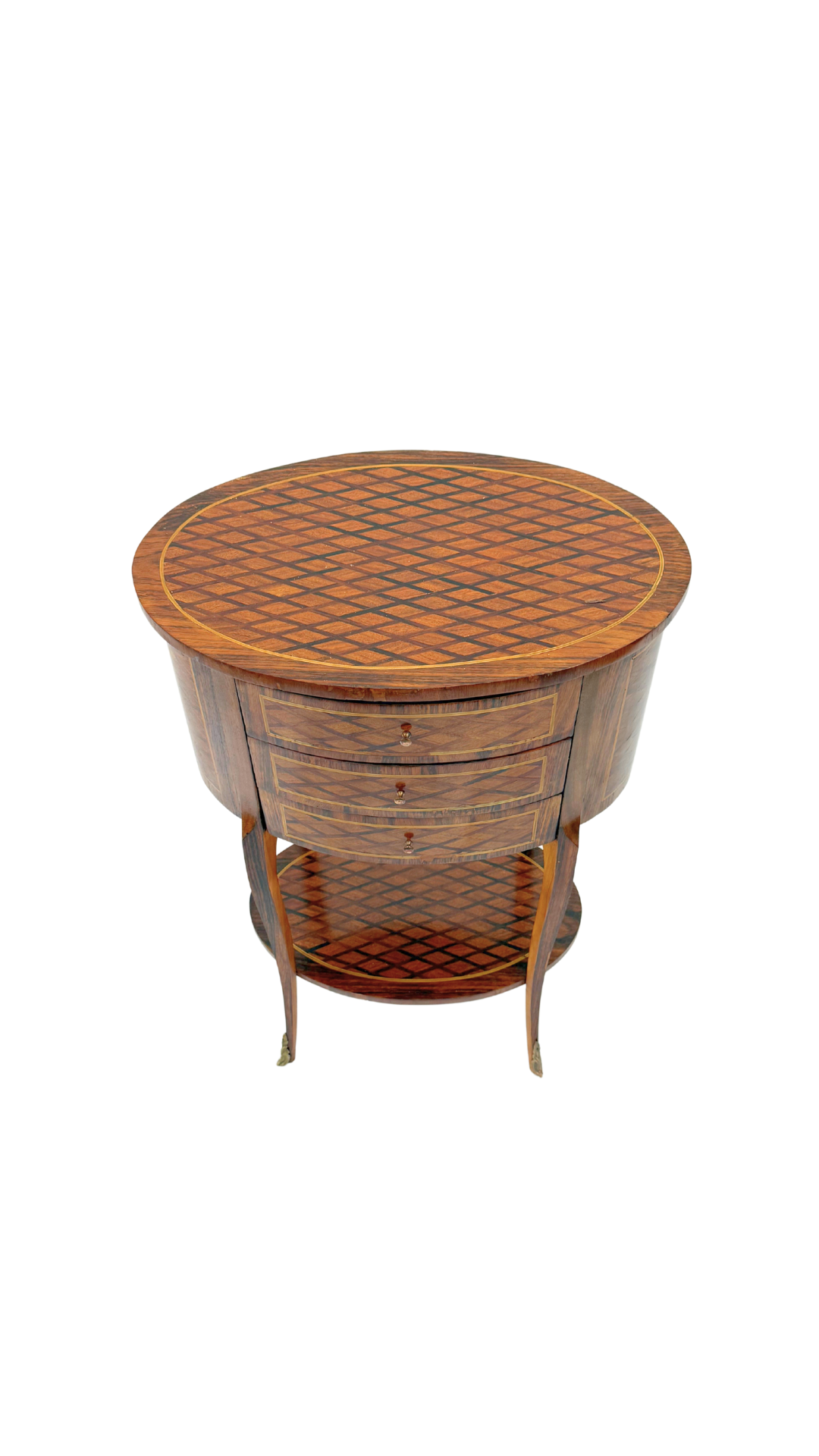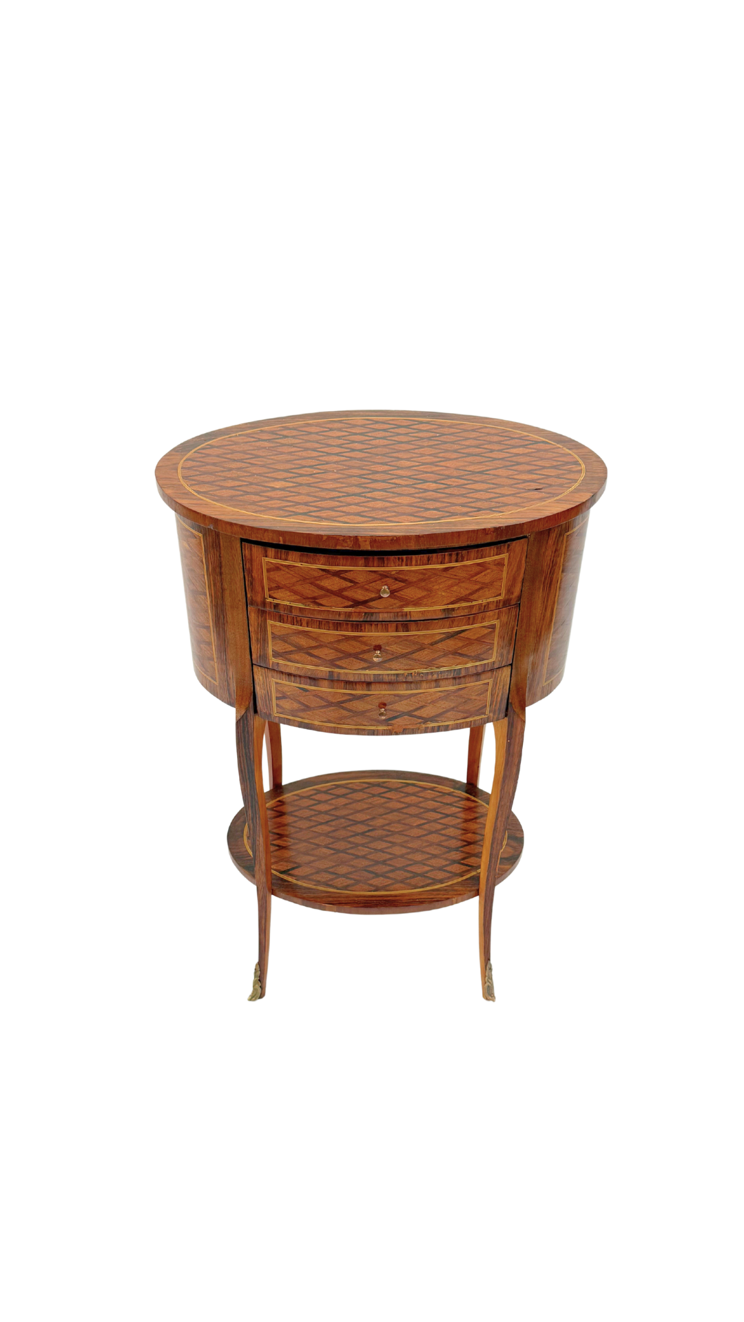 A true gem of craftsmanship, this petite French bouillotte-style table features marquetry throughout, diamond-patterned veneers that wrap the top, drawers, and lower tier in visual texture and warmth. Resting on slender, tapered cabriole legs with gilt bronze sabots, the form is light and elegant yet richly detailed. Three small drawers offer discreet storage making it practical and polished.