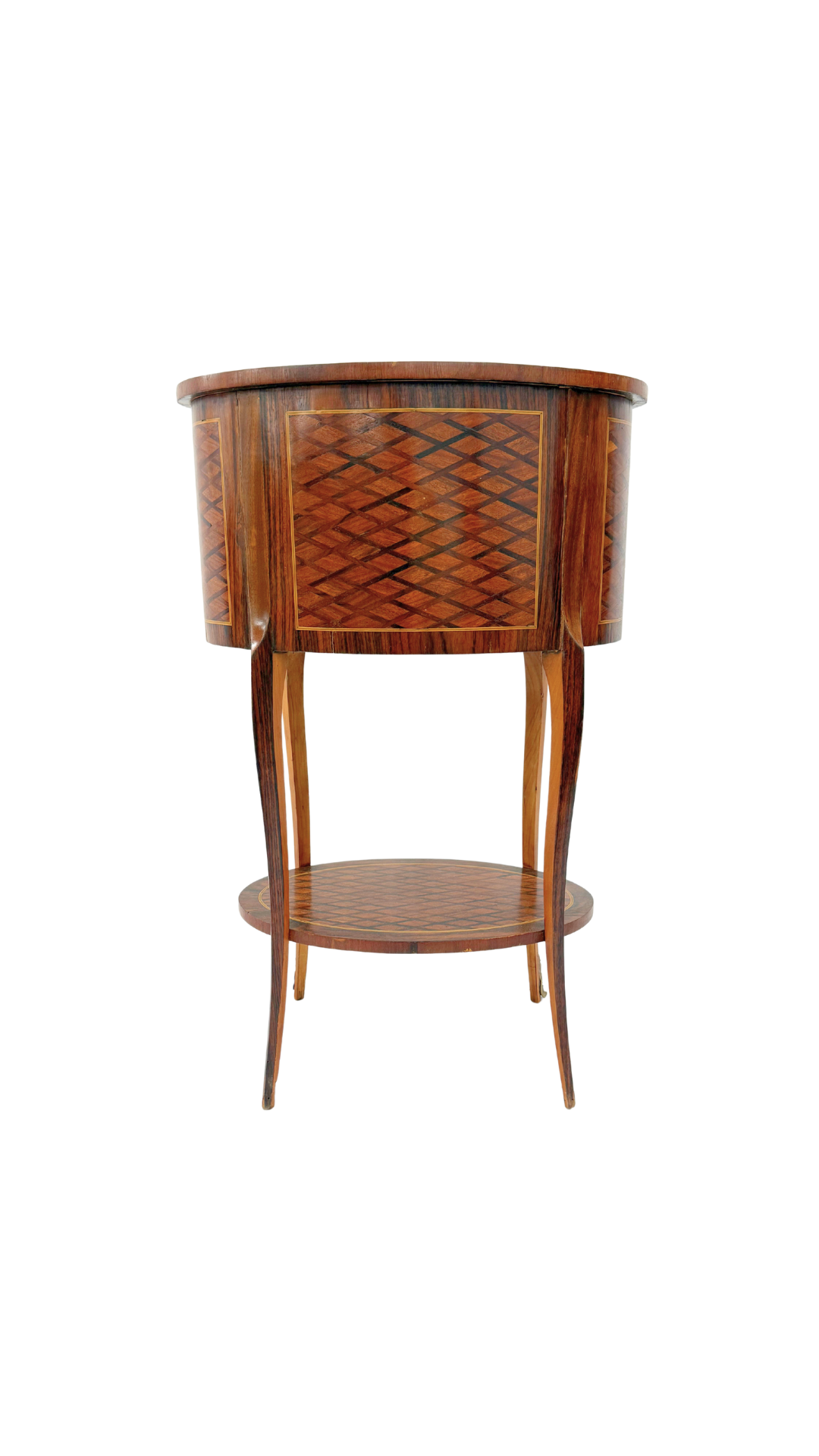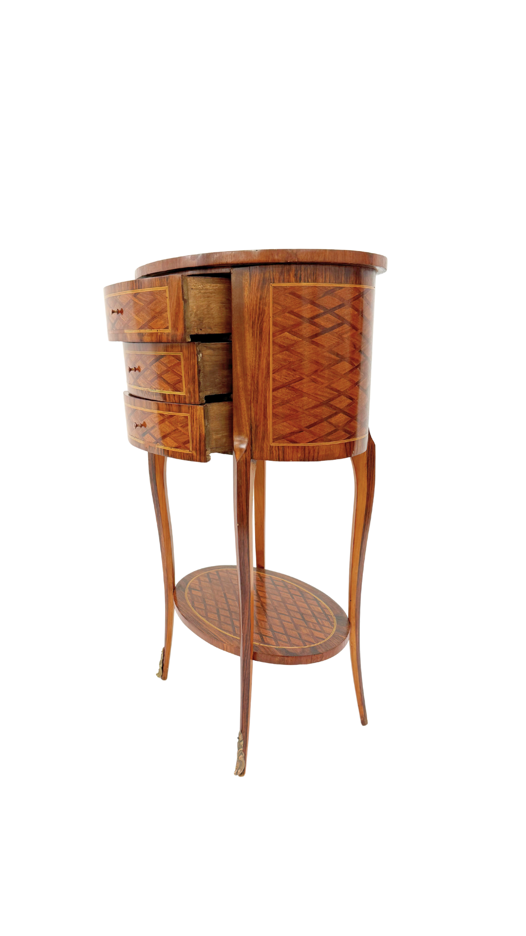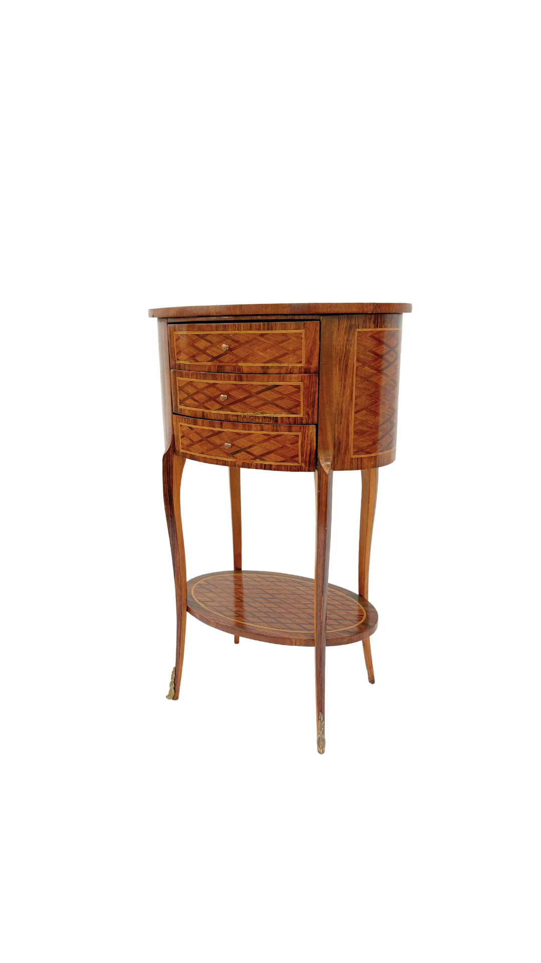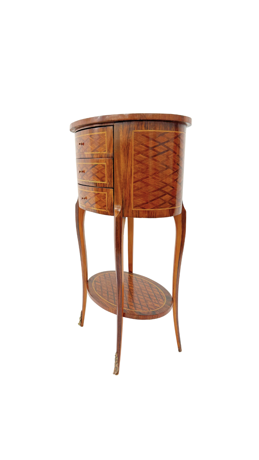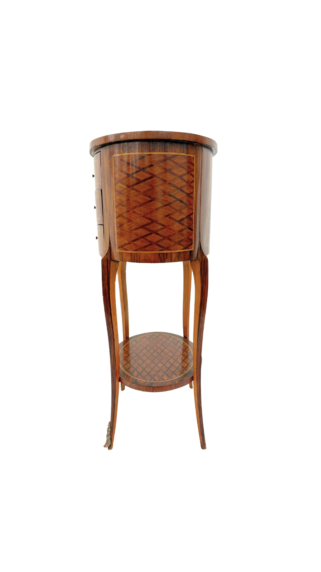 A true gem of craftsmanship, this petite French bouillotte-style table features marquetry throughout, diamond-patterned veneers that wrap the top, drawers, and lower tier in visual texture and warmth. Resting on slender, tapered cabriole legs with gilt bronze sabots, the form is light and elegant yet richly detailed. Three small drawers offer discreet storage making it practical and polished.