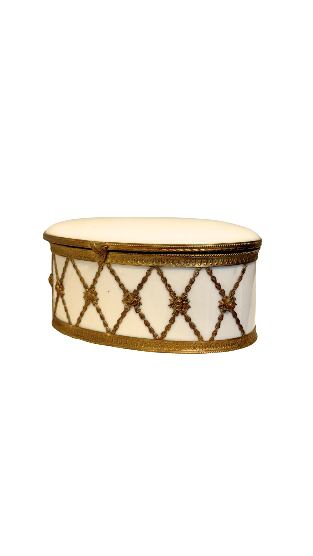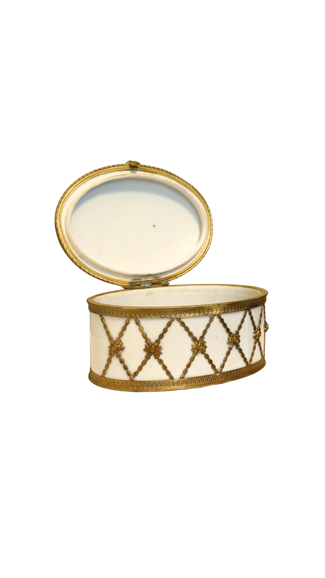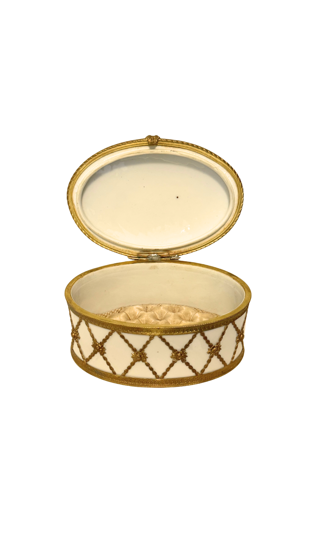 An exquisite oval porcelain jewelry casket, crafted in France and mounted in finely detailed gilt bronze (ormolu). The white porcelain body is adorned with a delicate lattice of gilt rope-twist garlands, each intersection finished with a rosette. The hinged lid opens to reveal the original tufted silk interior, now beautifully mellowed with age. Marked FRANCE with additional stamp Depose on the underside. A refined piece for storing jewelry or as a decorative objet, showcasing the opulence of 19th to early 20th century French craftsmanship.