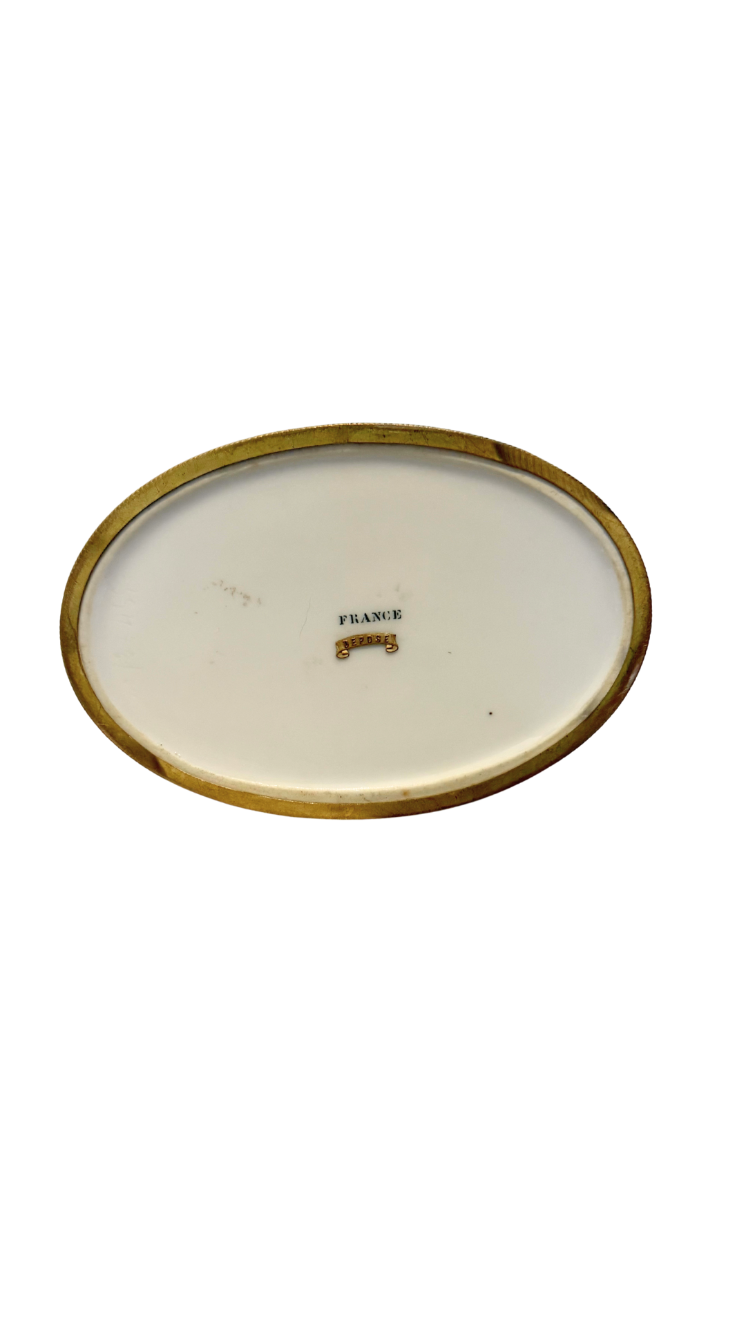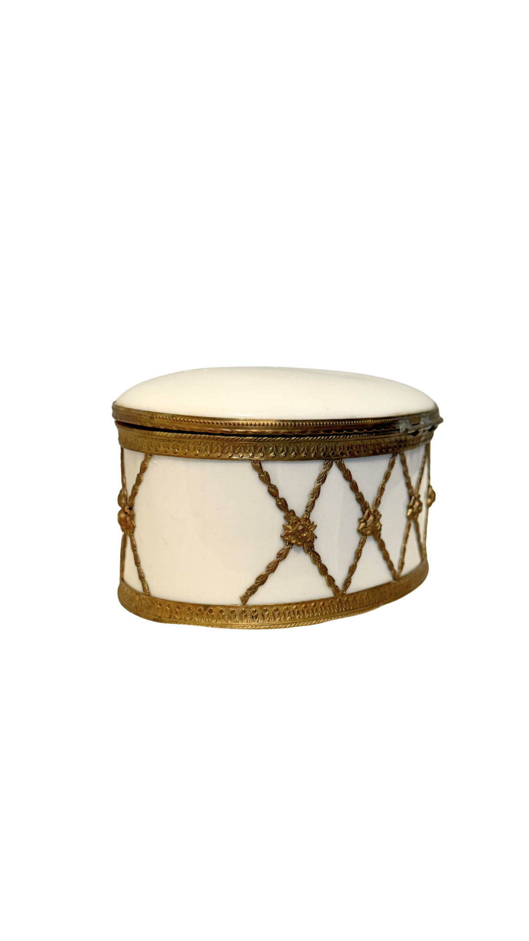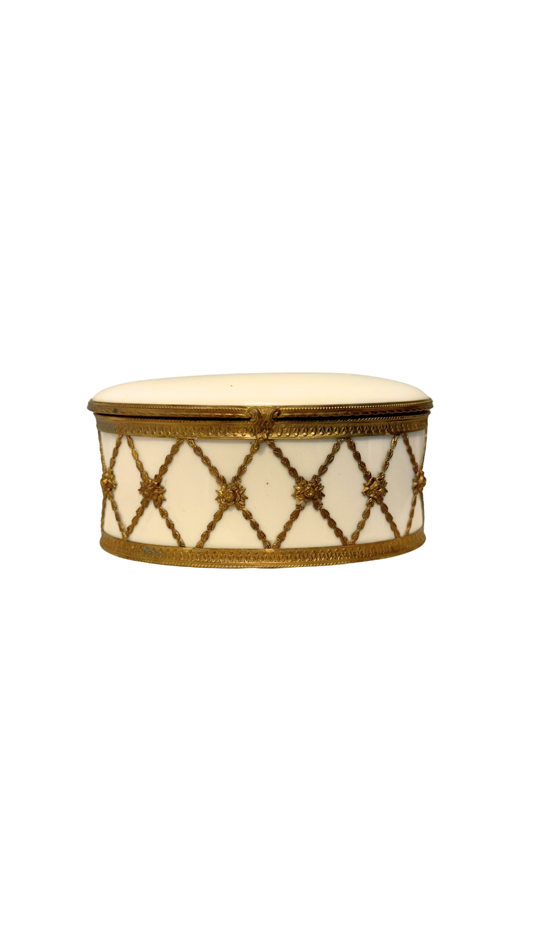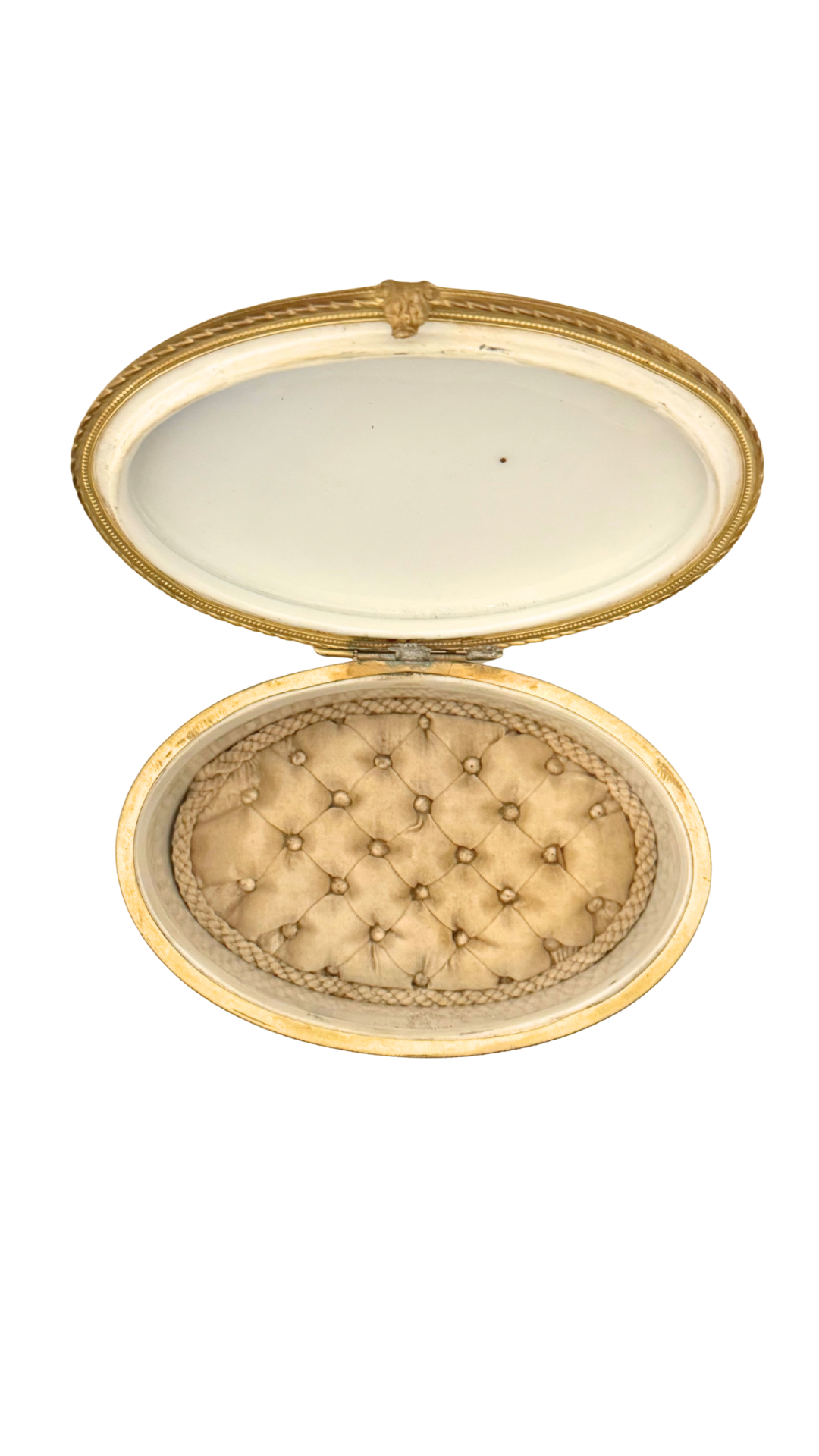 An exquisite oval porcelain jewelry casket, crafted in France and mounted in finely detailed gilt bronze (ormolu). The white porcelain body is adorned with a delicate lattice of gilt rope-twist garlands, each intersection finished with a rosette. The hinged lid opens to reveal the original tufted silk interior, now beautifully mellowed with age. Marked FRANCE with additional stamp Depose on the underside. A refined piece for storing jewelry or as a decorative objet, showcasing the opulence of 19th to early 20th century French craftsmanship.