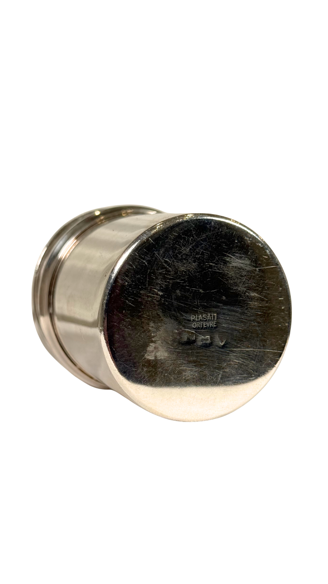 The base is stamped “Plasit Orfèvre,” identifying the piece as French silverplate craftsmanship, likely dating to the early 20th century. Originally intended for tabletop use, it now works beautifully as a decorative accent on a bar cart, desk, or coffee table—styled with matches, toothpicks, or left as a sculptural object on its own.