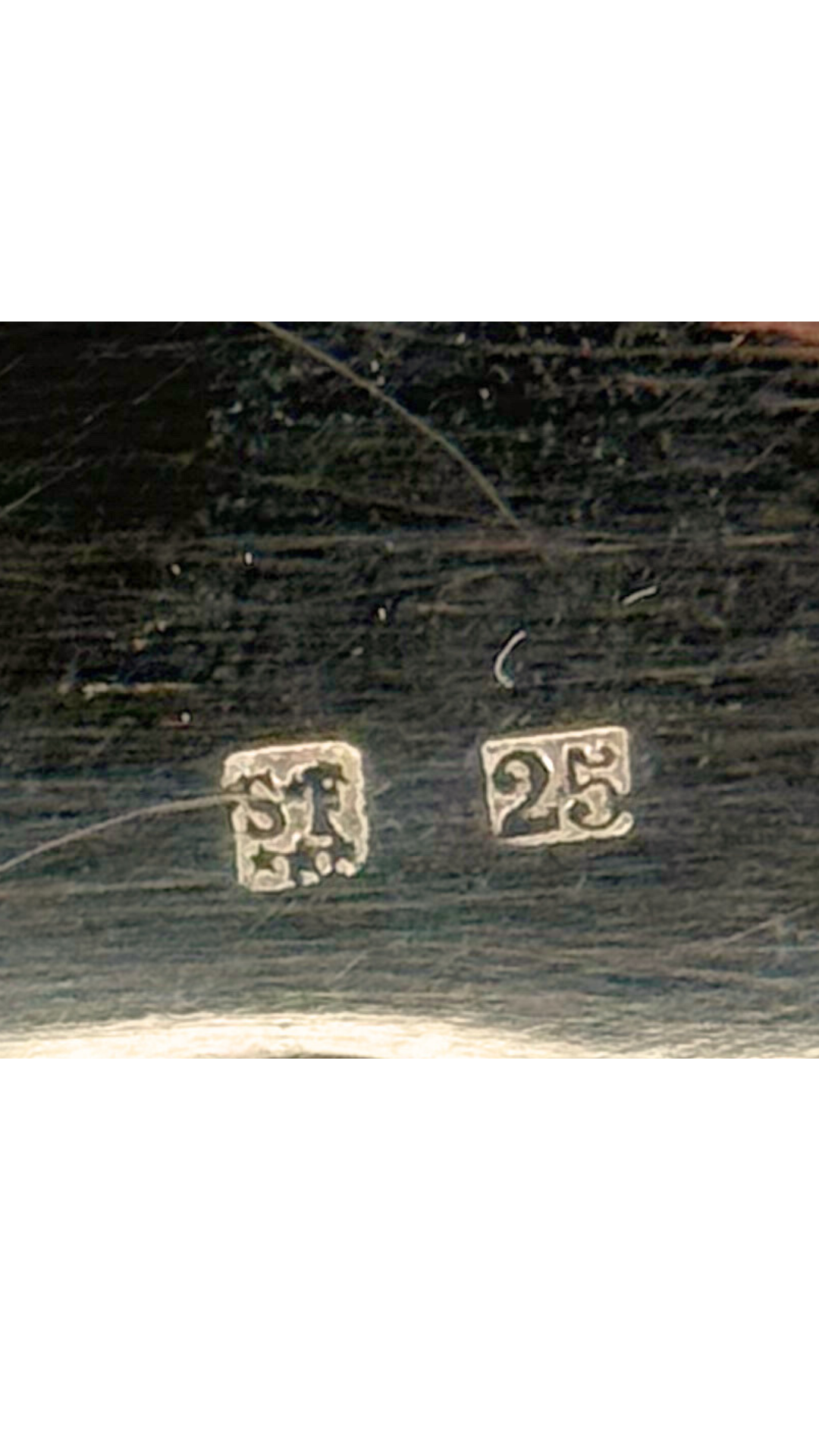 An elegant antique French silverplate sauce boat with its original underplate, marked SF and stamped 25, indicating a heavier-than-average silver deposit. The form is classic and well balanced, with softly flared edges, subtle shell detailing, and gently curved side handles that give it a refined, timeless presence.