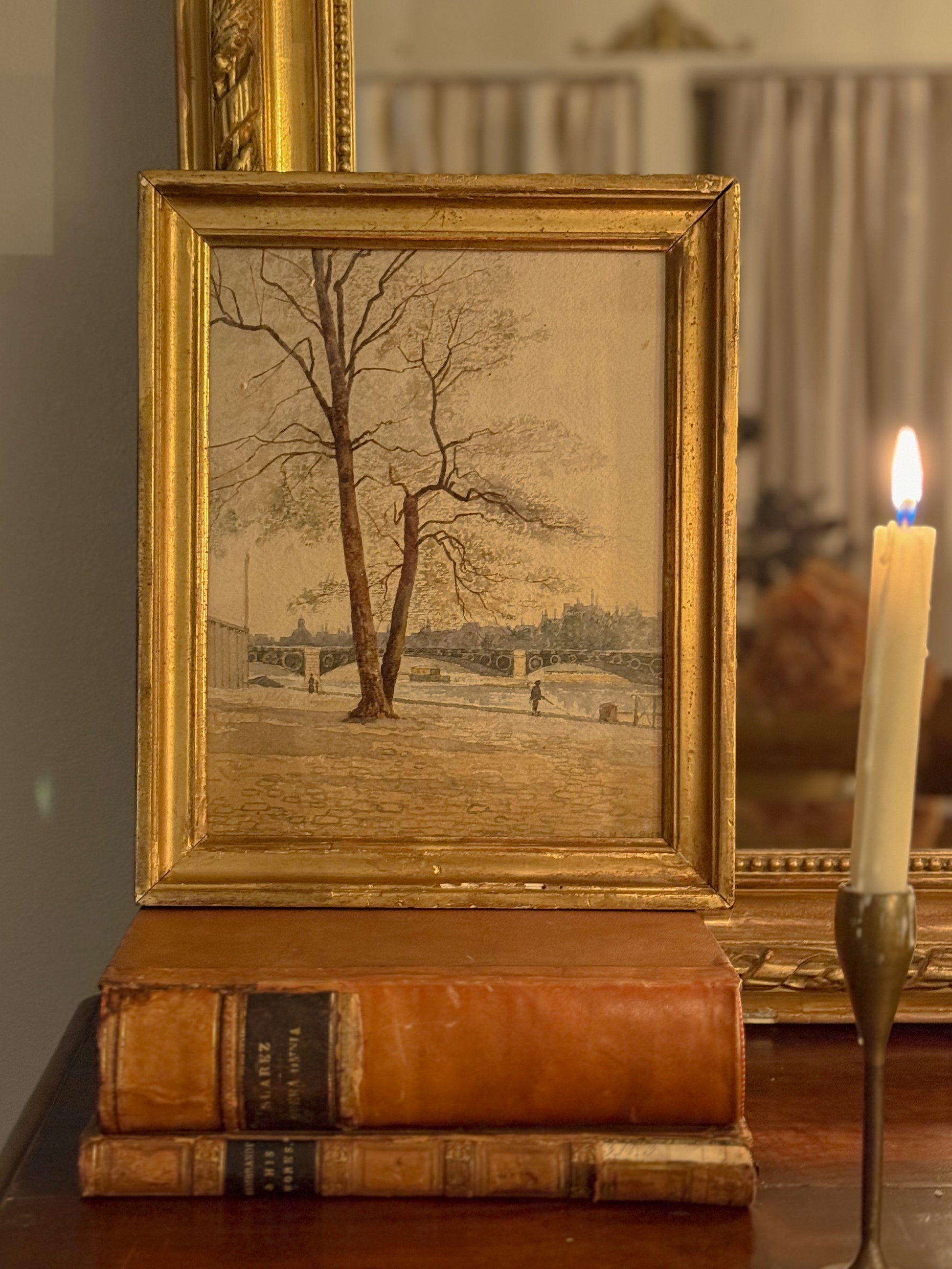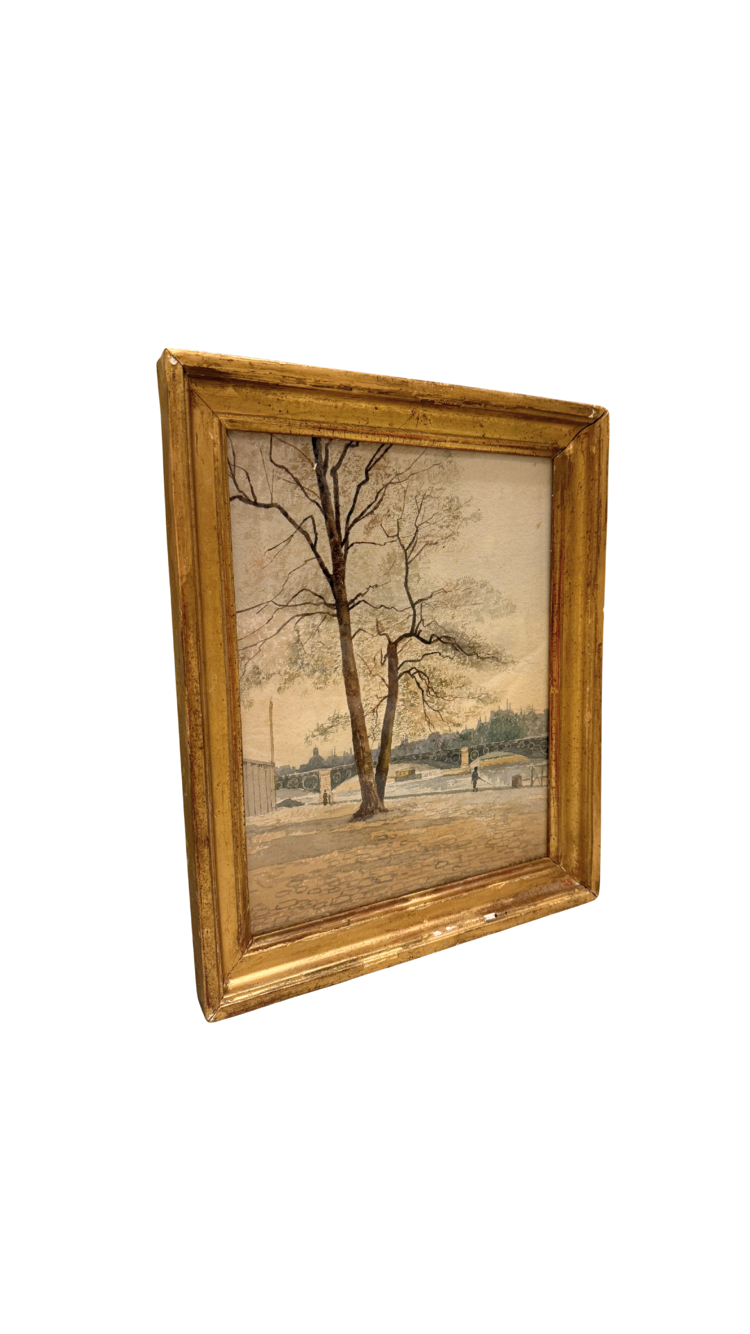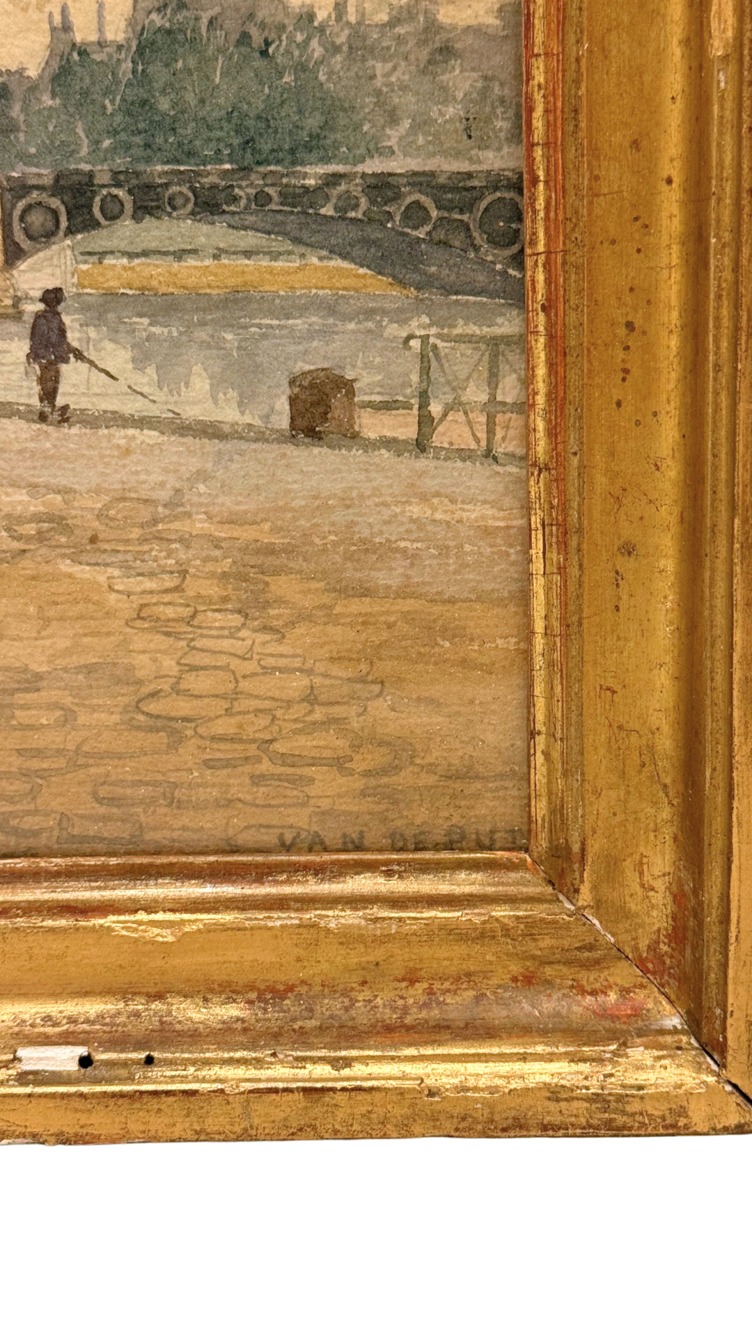 A serene 19th-century French watercolor signed Van de Put, capturing a quiet stretch of the Seine with remarkable delicacy. The artist’s hand is soft and intentional—cobblestones, winter-bare trees, distant architecture, and the graceful arches of the bridge all rendered in gentle washes of muted color.