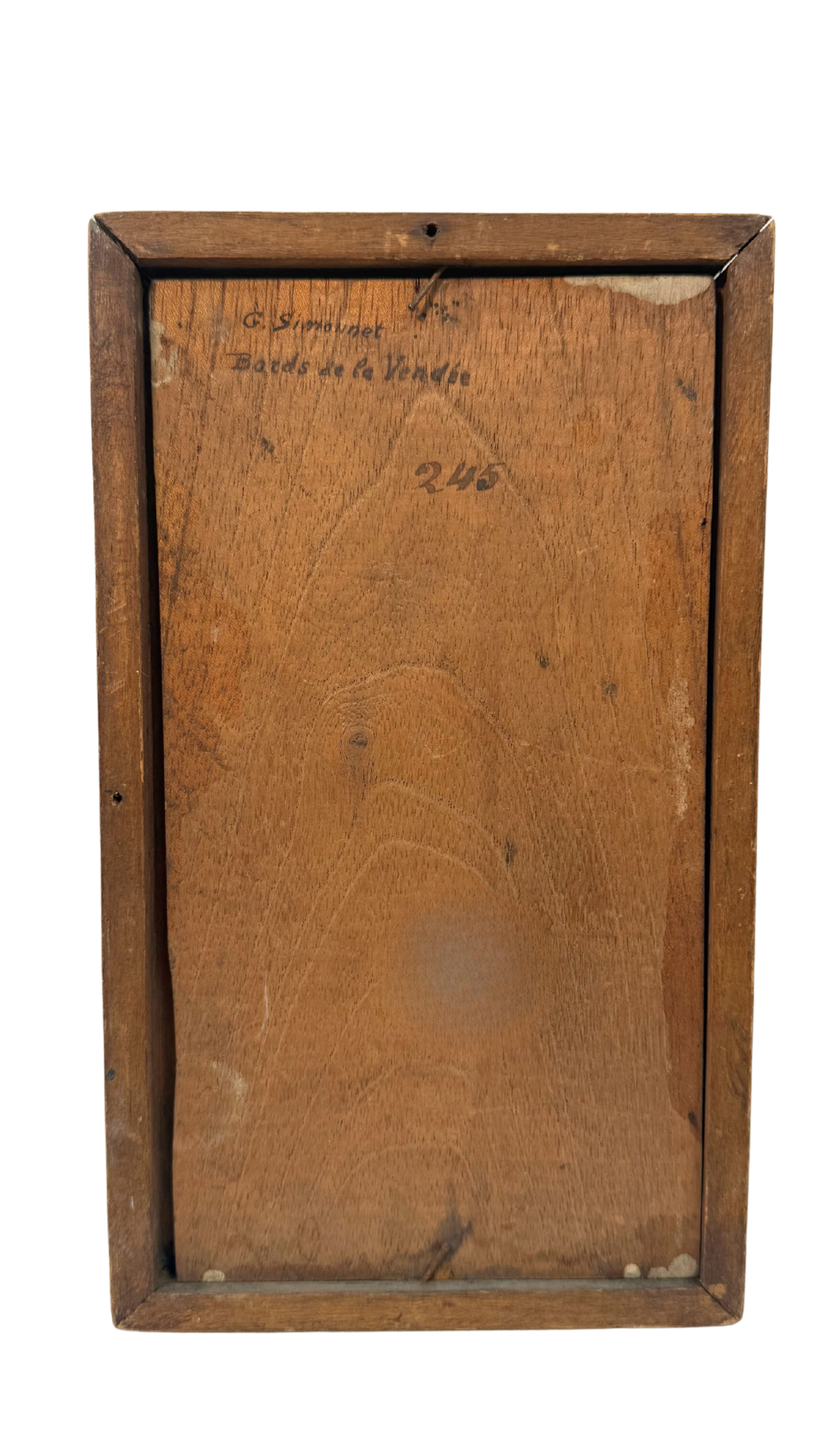 A beautifully atmospheric French landscape by G. Simonnet, titled “Bords de la Vienne” on the reverse. Painted in rich, impressionistic strokes, the scene captures the quiet glow of sunset over the river — deep greens, warm golds, and soft reflections shimmering across the water.