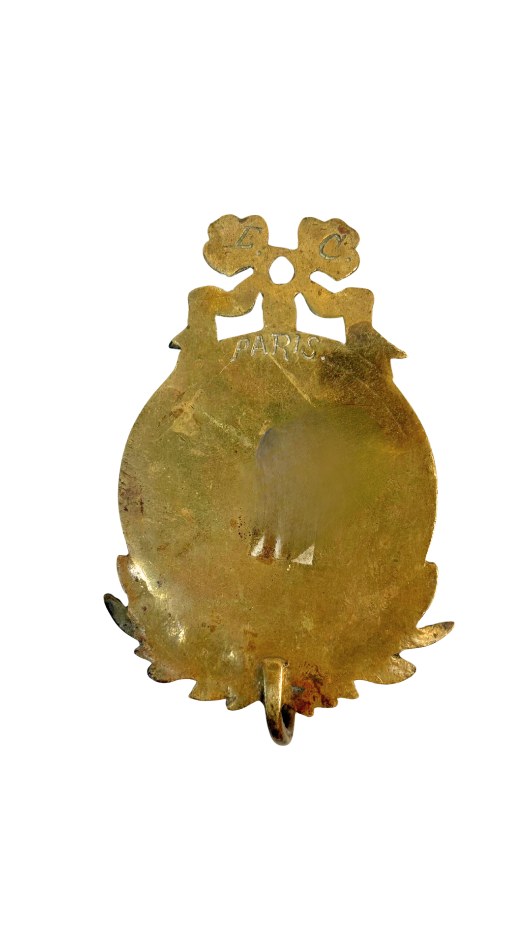 A solid bronze wall hook featuring a medallion portrait of Jeanne d’Arc, framed with laurel leaves and topped with a ribbon motif. The back is engraved “E.C. Paris,” denoting its Parisian origin. Originally designed as a decorative wall hook or key holder, it reflects the late 19th-century French fascination with national heroines and historical revival motifs.