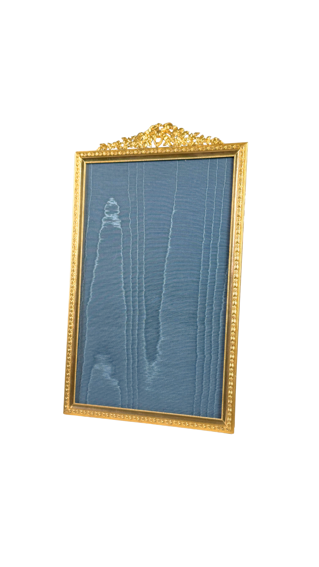 A striking large-scale antique French table frame crafted in gilt brass, featuring a finely pierced crest and crisp architectural lines. The frame retains its original blue moiré silk backing, offering a rich contrast against the warm gilt finish and adding depth and texture to the overall presentation.