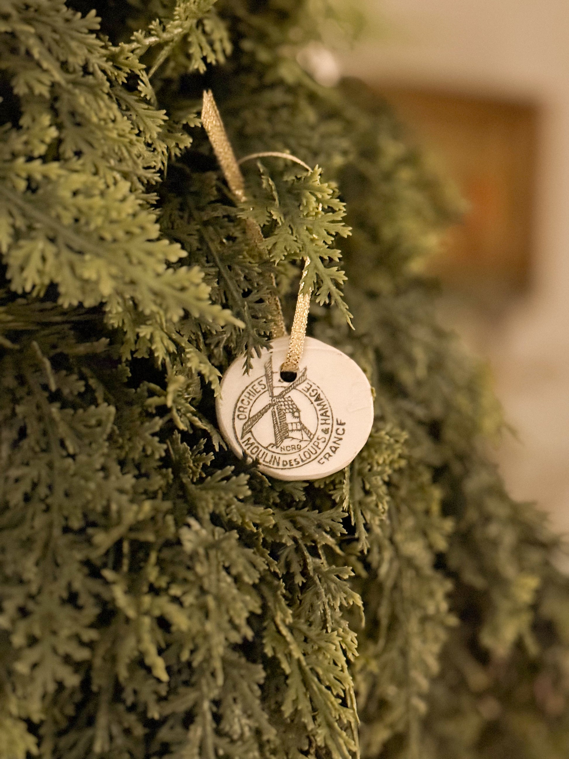 Sourced in Paris and handcrafted from an antique French ironstone plate, this ornament showcases one of the most charming maker’s marks in French faïence history: the Moulin des Loups & Hamage windmill. The crisp black stamp is perfectly framed within the cut of this piece, giving it the feel of a tiny archival medallion.