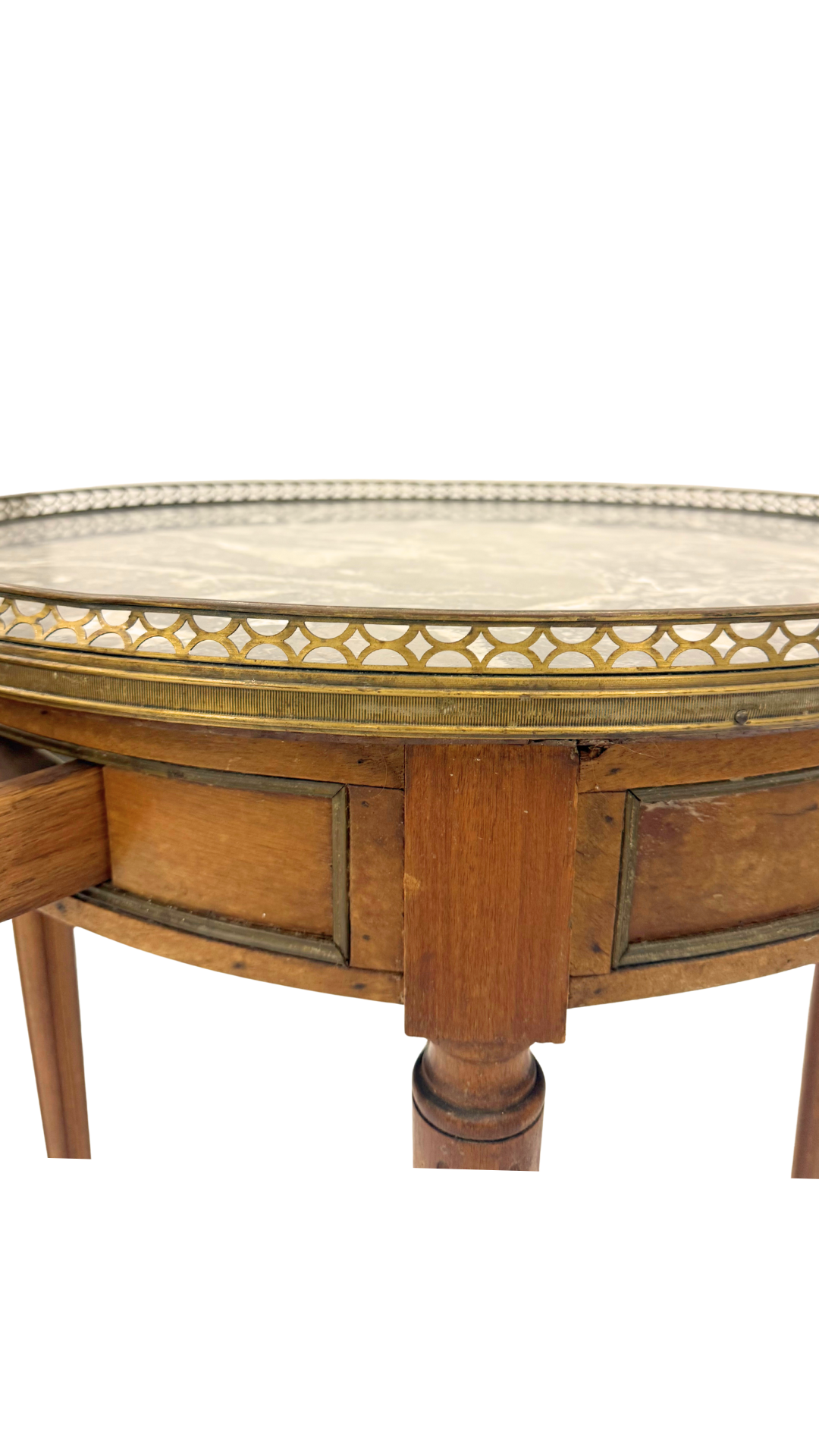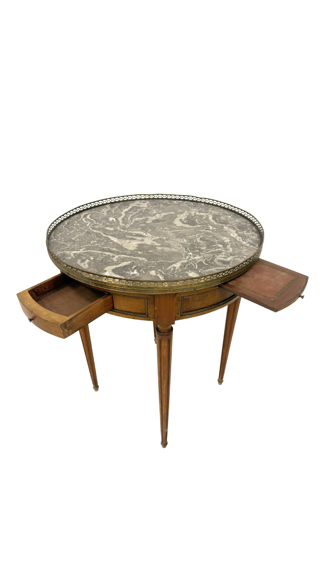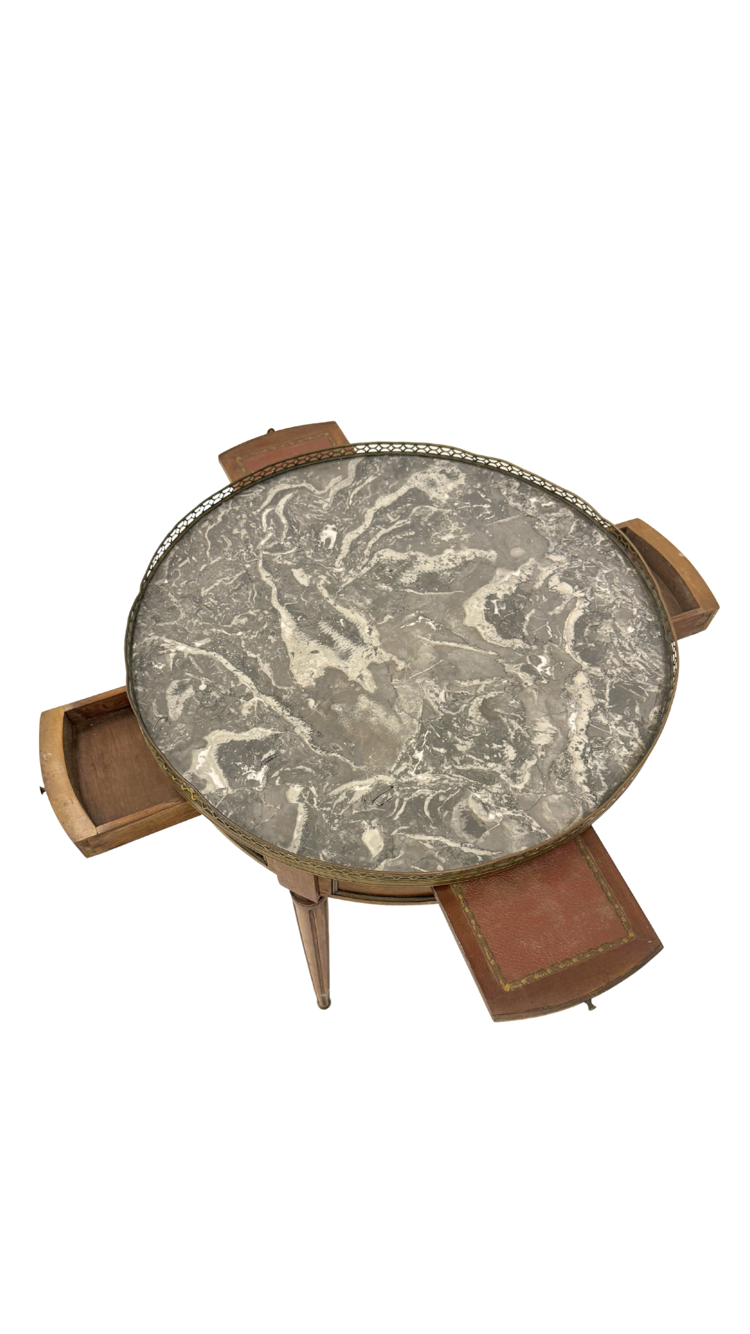 A classically elegant French bouillotte table in the Louis XVI style, featuring a gray and white marble top framed by a pierced brass gallery. Four pull-out slides extend from the apron, two with tooled leather writing surfaces and two with wooden trays, adding both charm and function. The fluted legs and original brass accents reflect refined craftsmanship and a balanced neoclassical form.