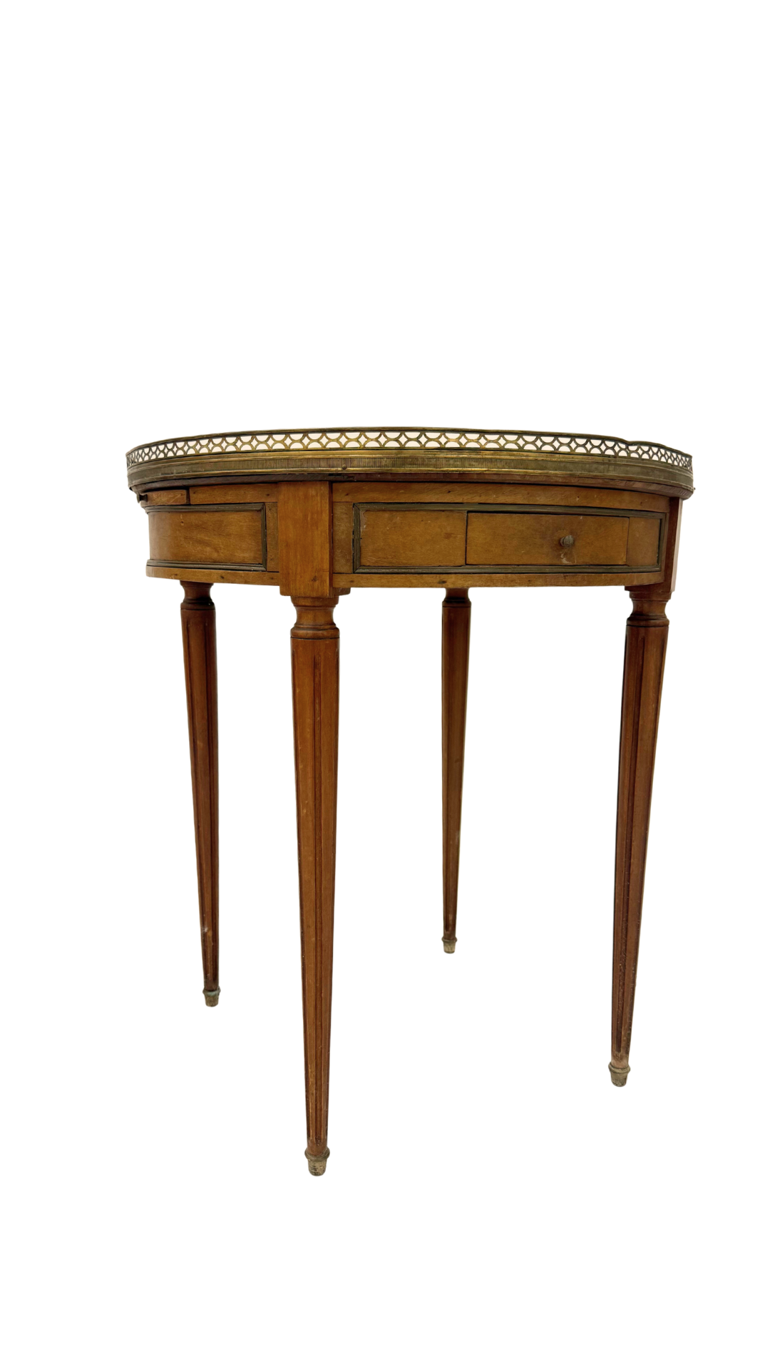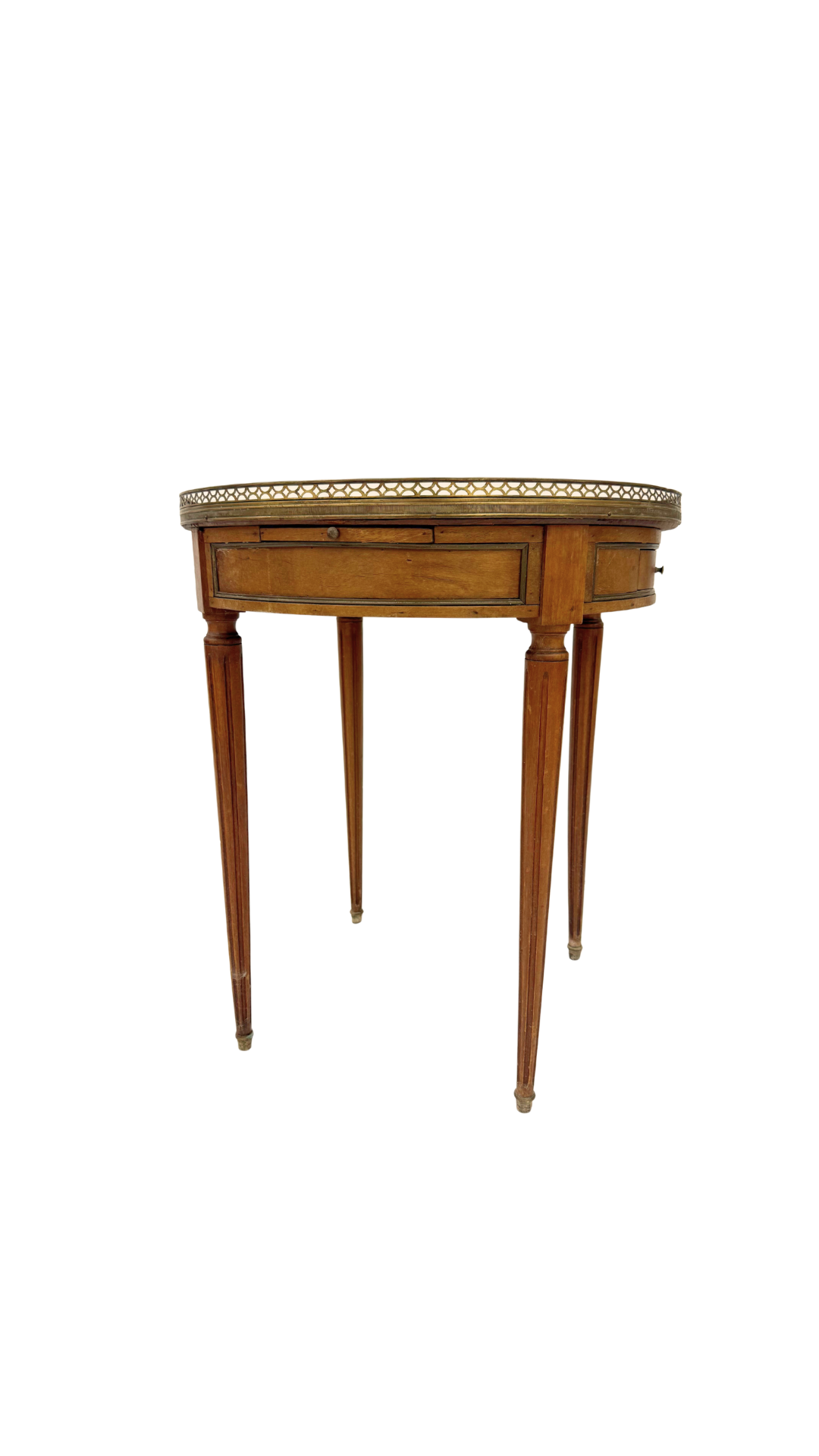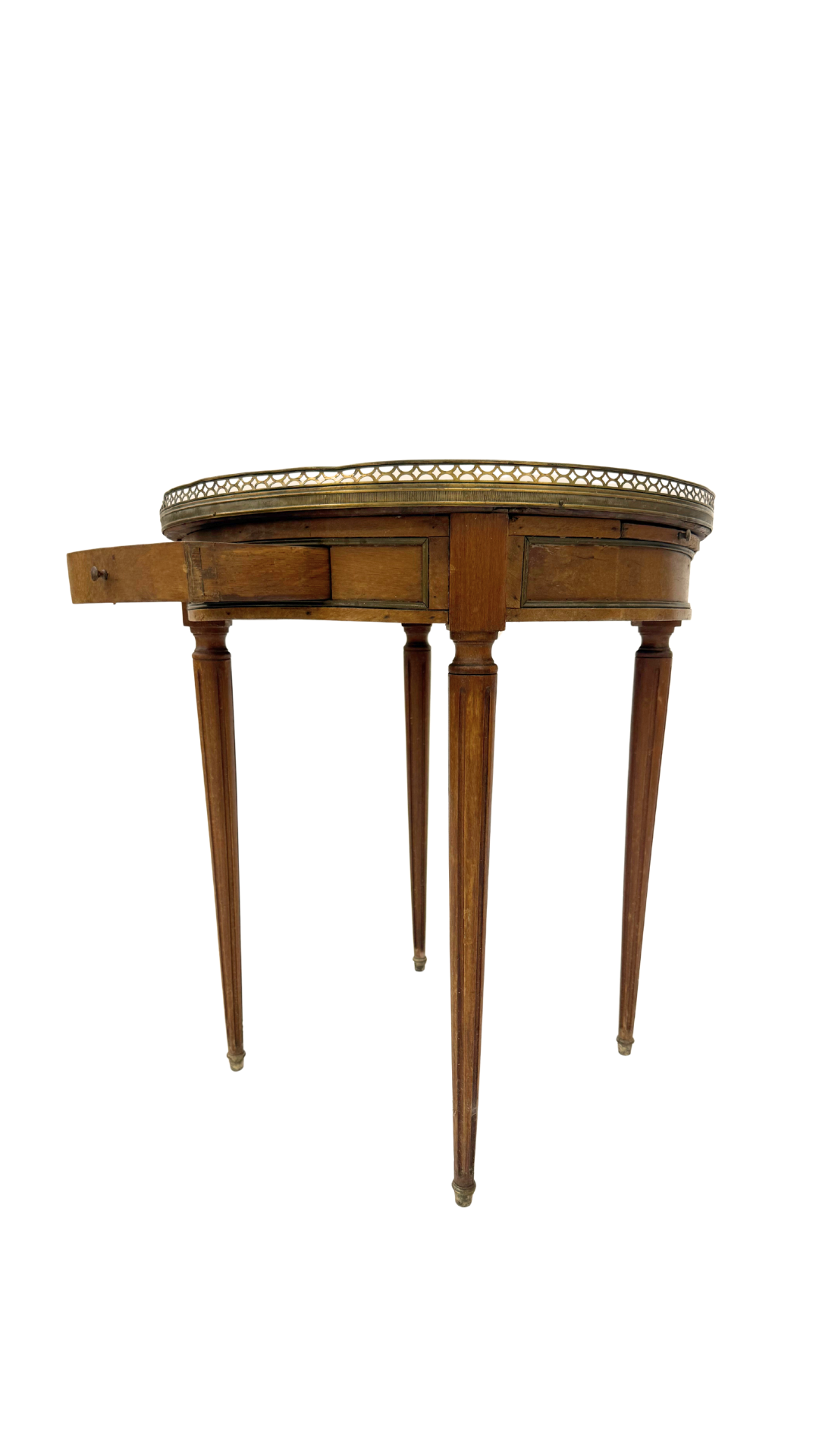 A classically elegant French bouillotte table in the Louis XVI style, featuring a gray and white marble top framed by a pierced brass gallery. Four pull-out slides extend from the apron, two with tooled leather writing surfaces and two with wooden trays, adding both charm and function. The fluted legs and original brass accents reflect refined craftsmanship and a balanced neoclassical form.