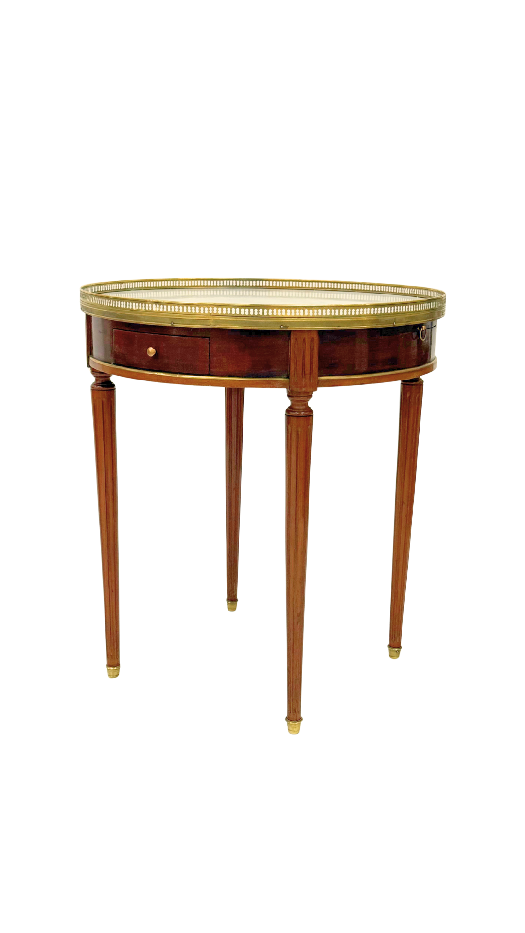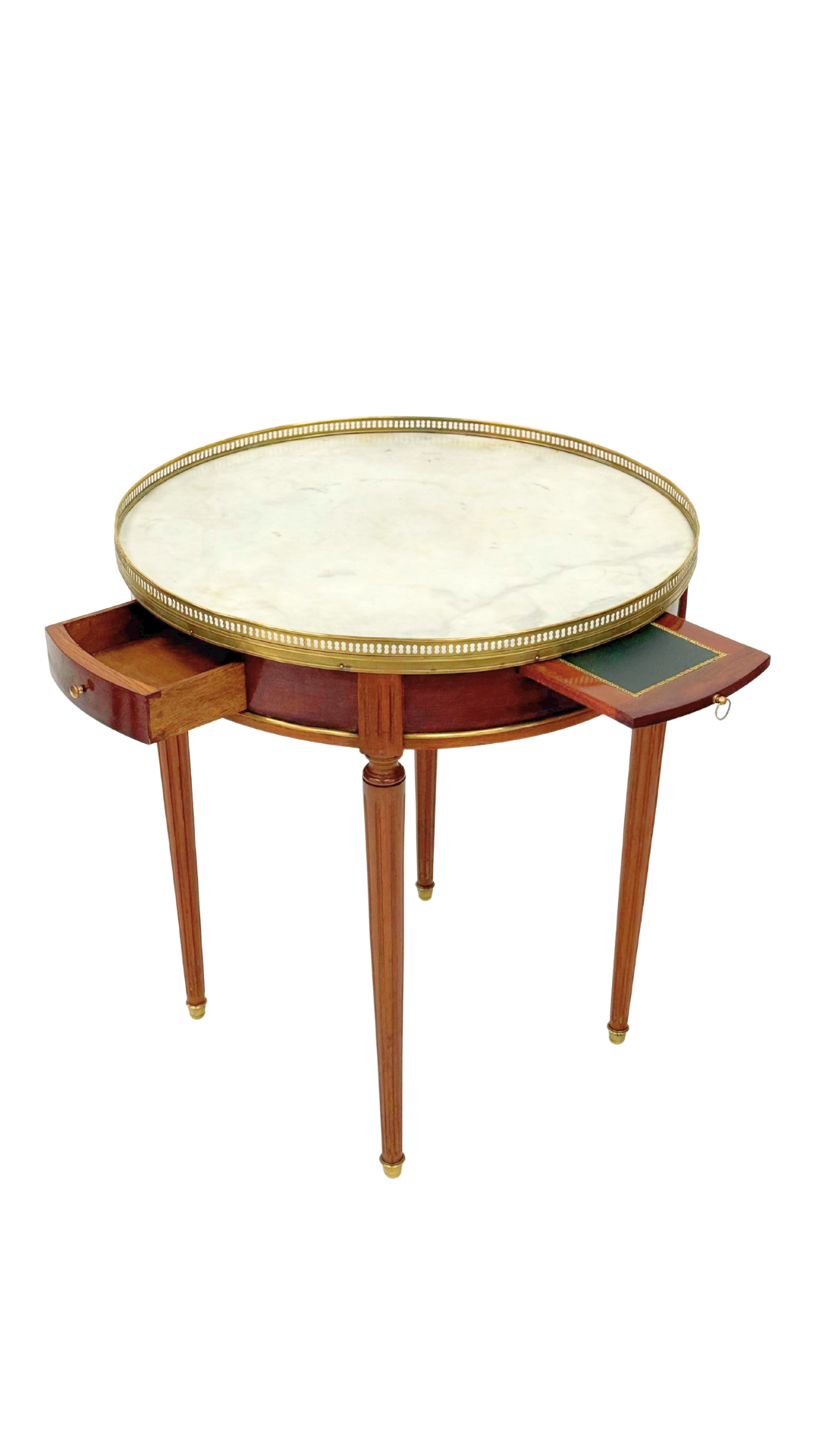 An elegant French bouillotte table in the Louis XVI style (circa 1900s) featuring its original white marble top surrounded by a stunning pierced brass gallery. The apron holds two discreet drawers and two pull-out slides - one lined with tooled leather, perfect for correspondence or cocktails.