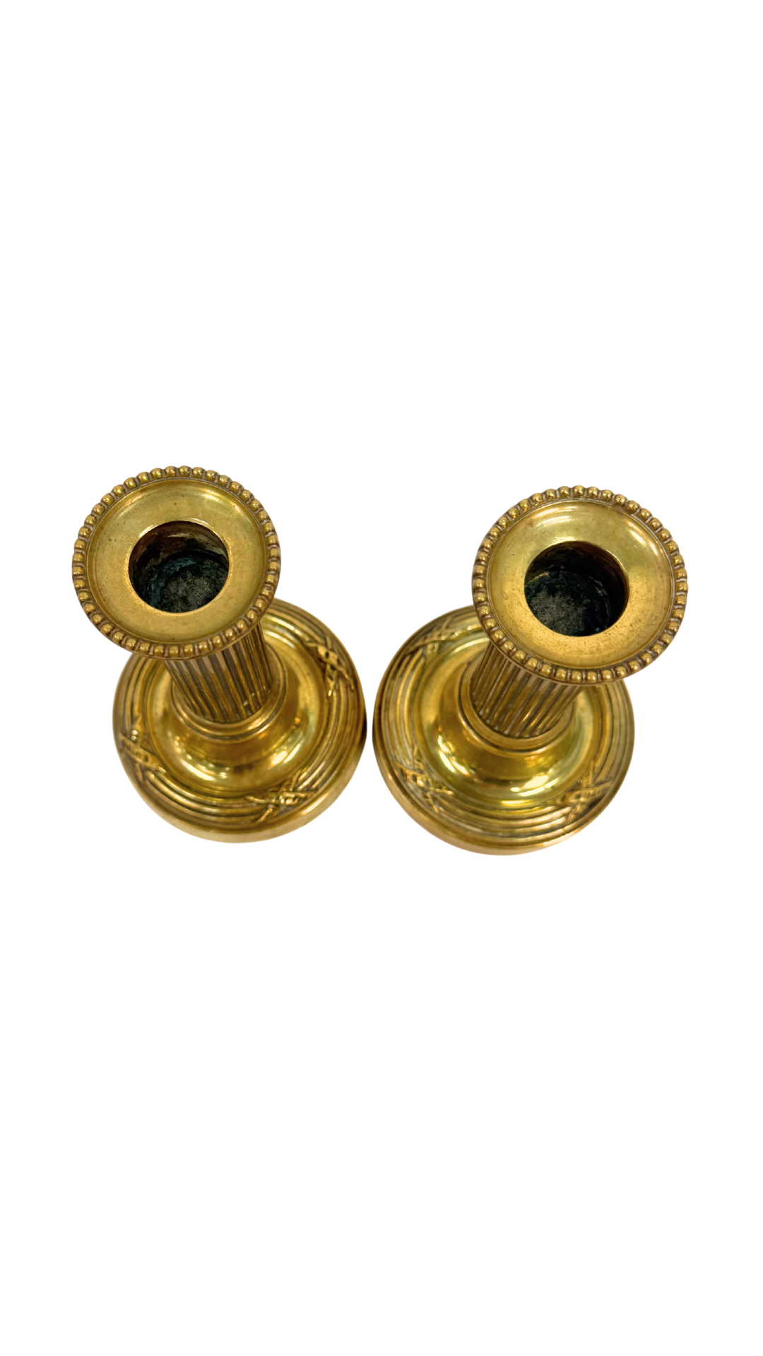 A refined pair of French Empire-style candlesticks featuring fluted column stems and delicately beaded rims. Each rests atop a circular base adorned with an interlaced laurel motif — a hallmark of early 19th-century neoclassical design.