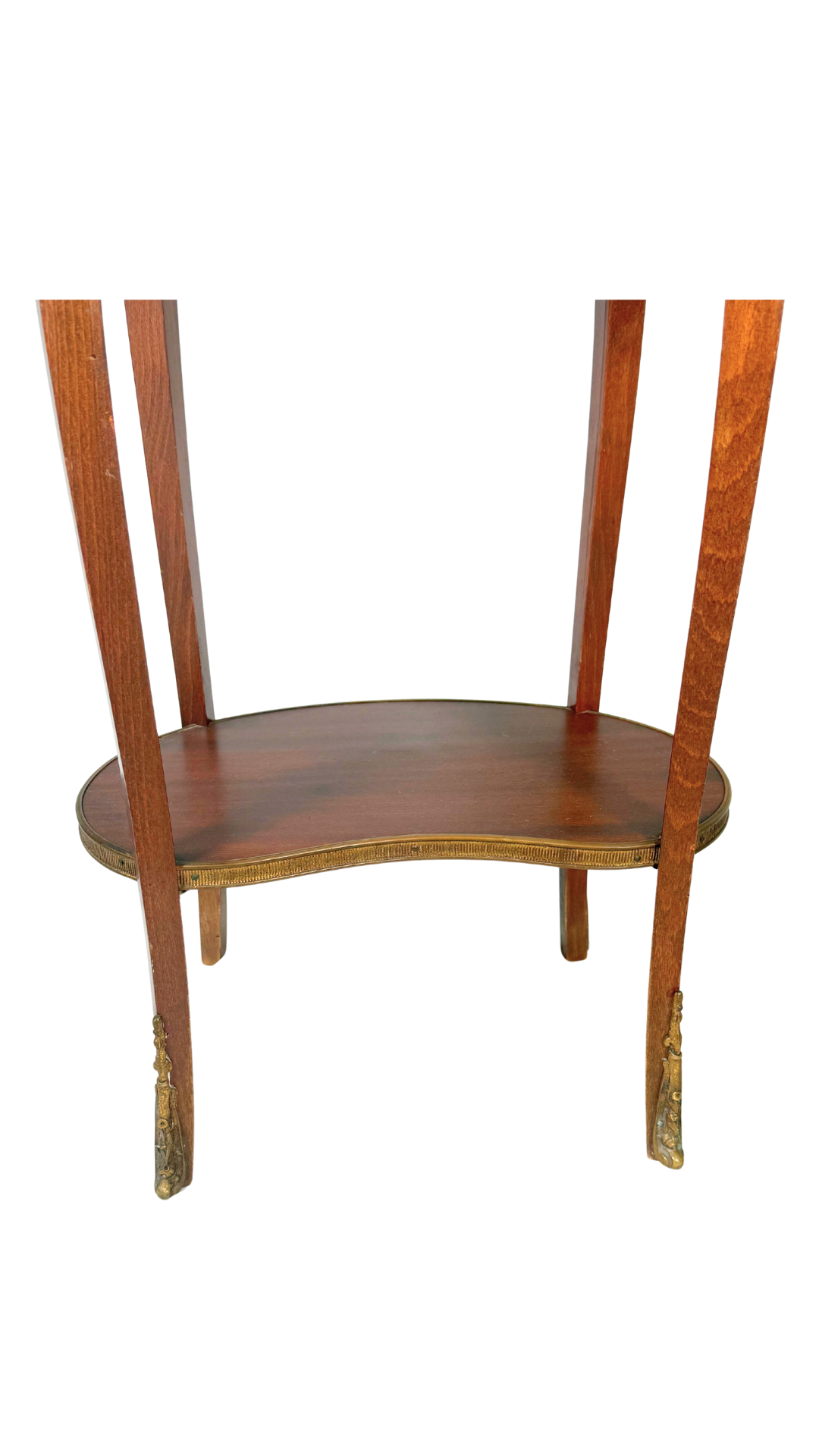 A charming pair of French mahogany and ormolu-mounted side tables, each with a shaped white marble top encircled by a pierced brass gallery. The kidney form — or “form en haricot” — lends a soft, elegant silhouette, perfectly suited for use as bedside or occasional tables. Each table features a single drawer adorned with delicate brass pulls, a lower tier for display or storage, and cabriole legs capped with gilt bronze sabots and mounts.