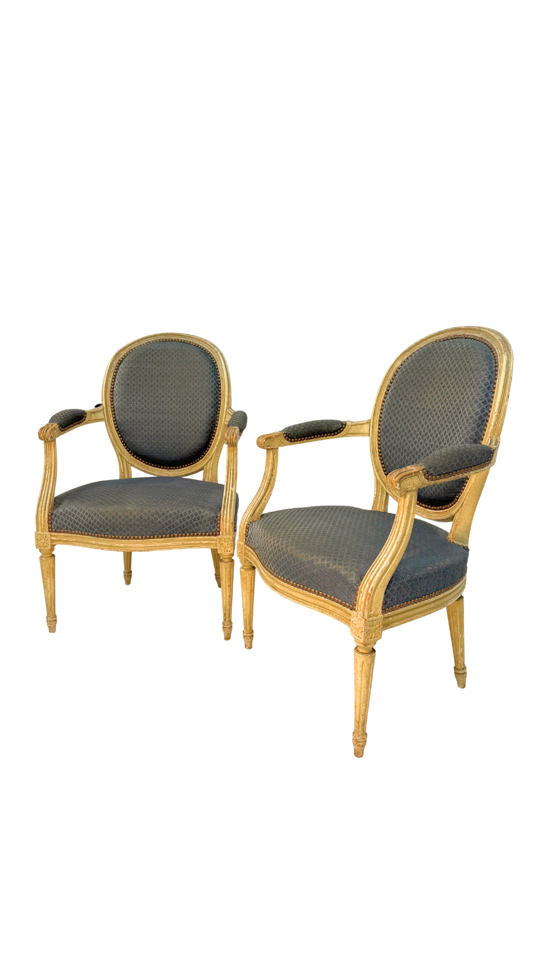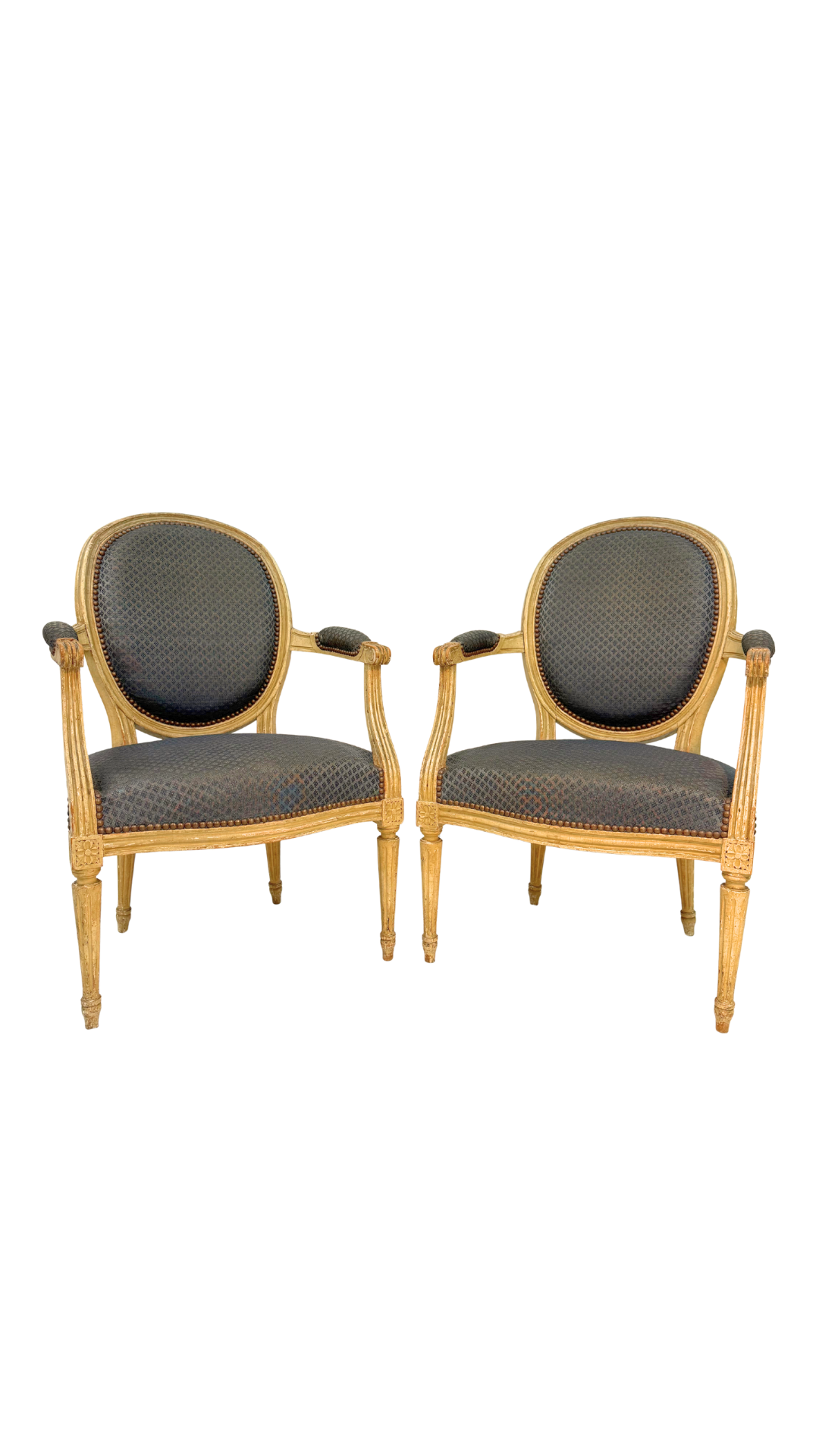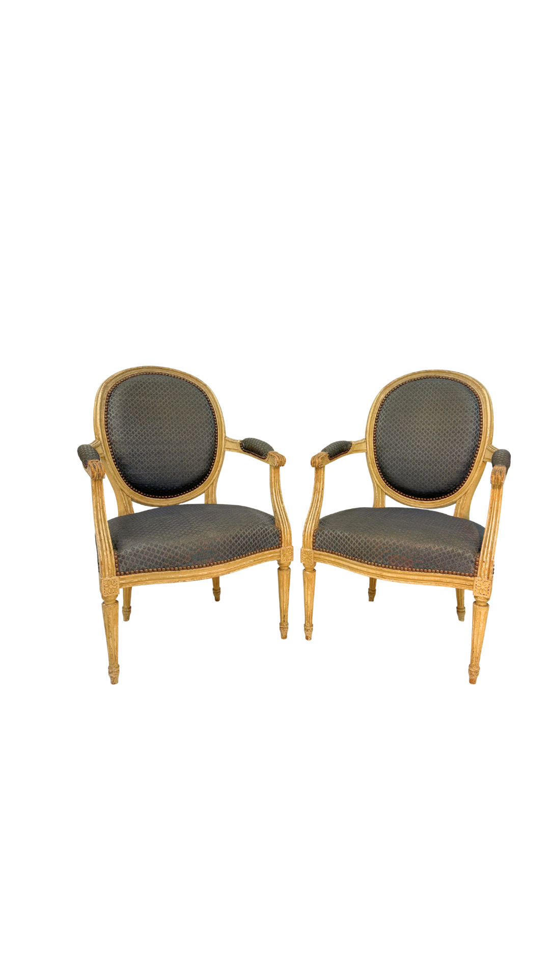 A handsome pair of French Louis XVI-style open armchairs, late 19th to early 20th century. Each chair features a carved wood frame with an oval medallion back, fluted legs, and scrolled arms. The finish has acquired a warm, time-softened patina, enhancing their antique character.