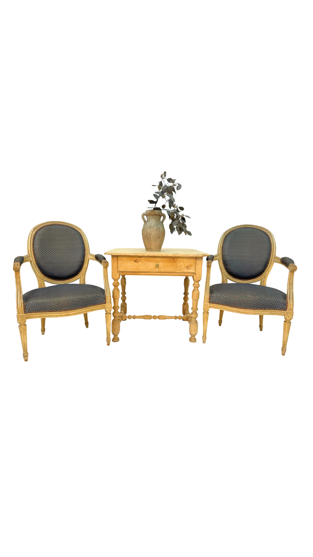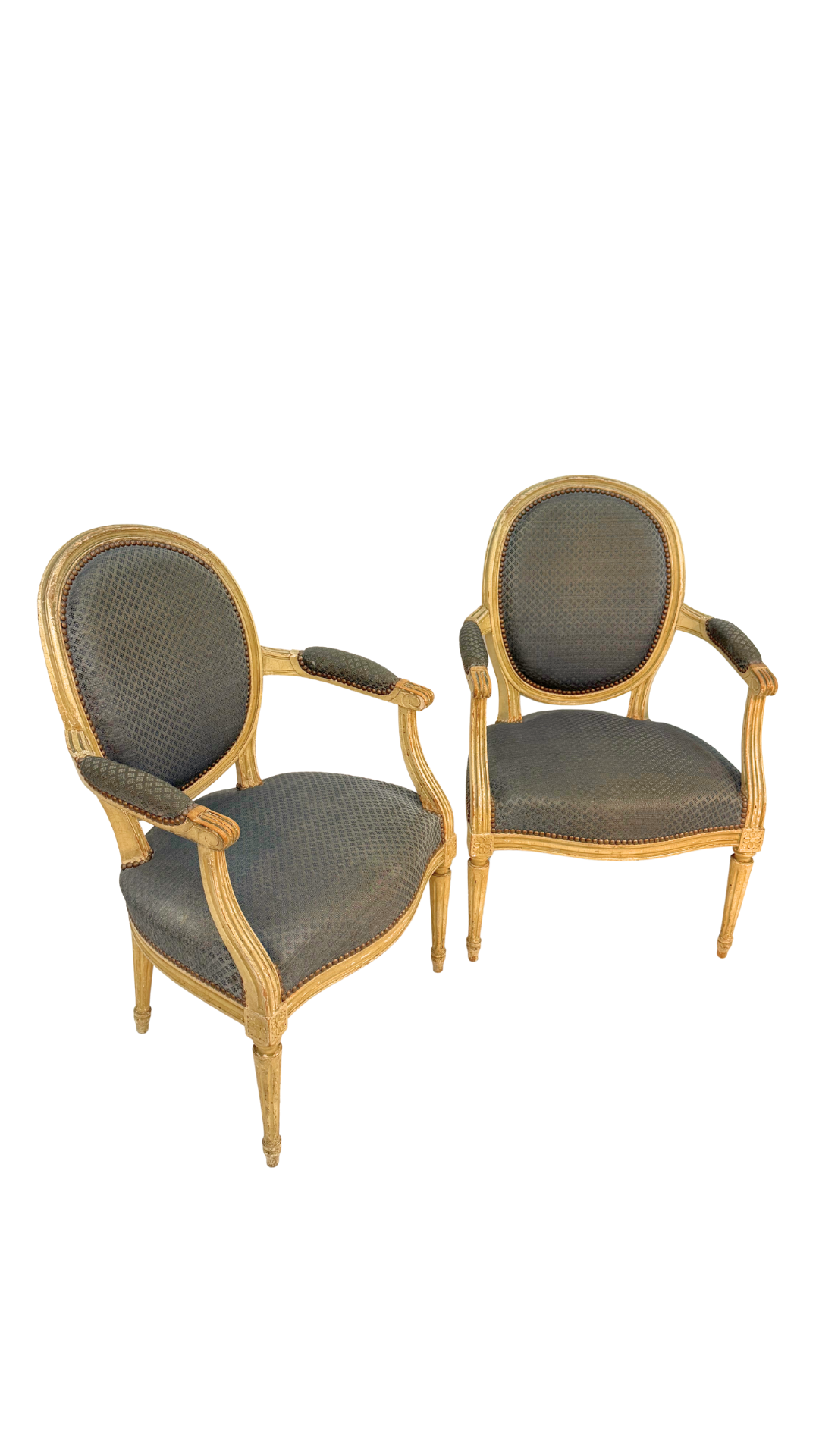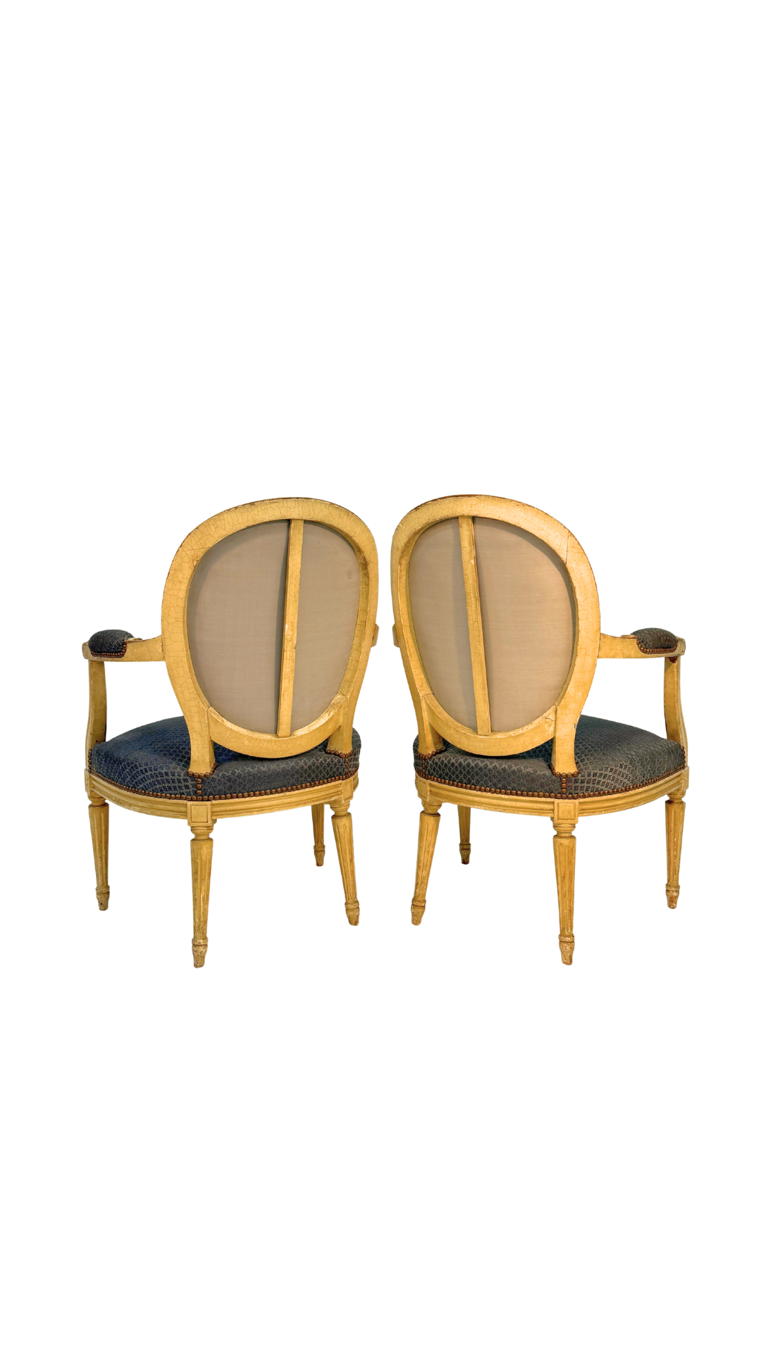 A handsome pair of French Louis XVI-style open armchairs, late 19th to early 20th century. Each chair features a carved wood frame with an oval medallion back, fluted legs, and scrolled arms. The finish has acquired a warm, time-softened patina, enhancing their antique character.