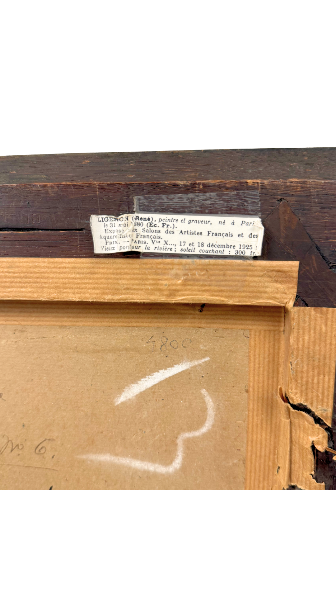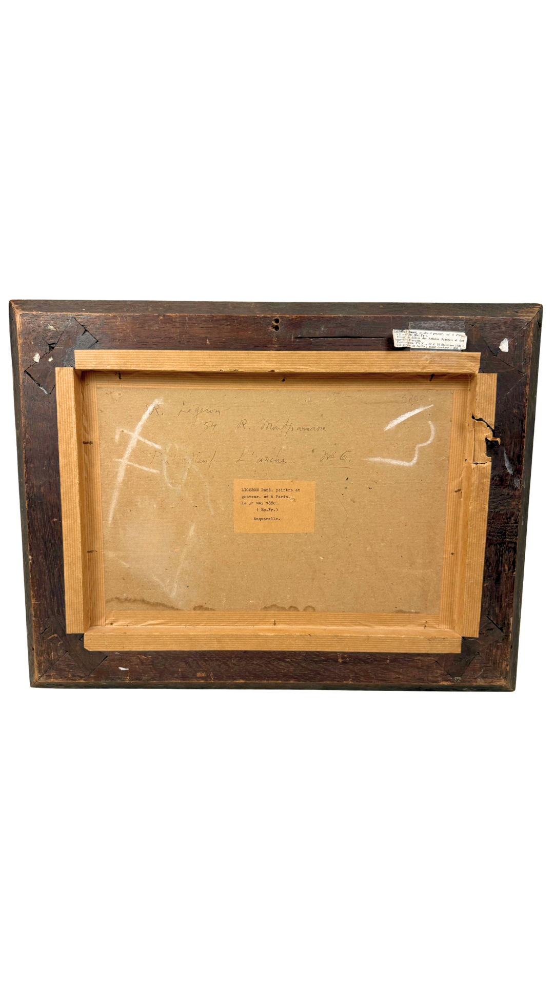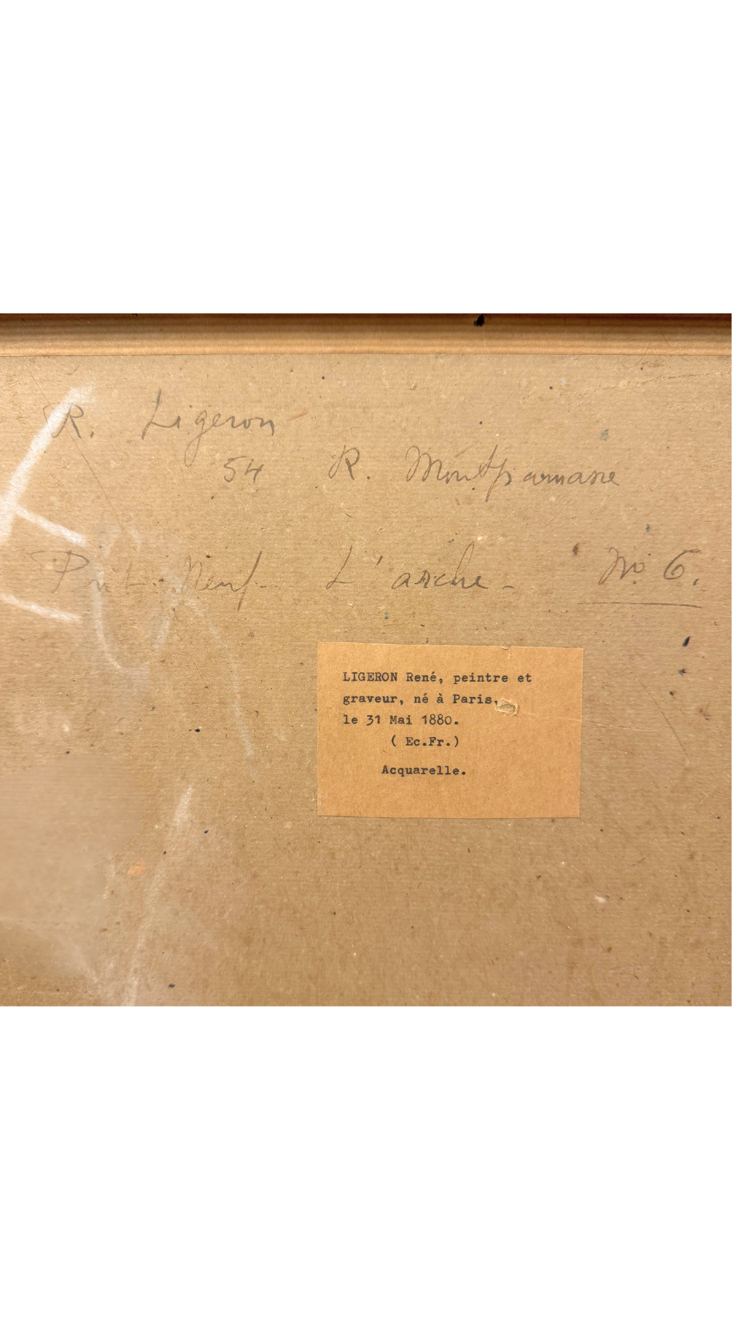 The watercolor is signed lower left and retains original labels and handwritten annotations on the reverse, identifying the artist, medium (aquarelle), and exhibition references—details that meaningfully elevate the piece for collectors. The painting is housed in a richly patinated gilt frame that complements the warmth of the scene and feels entirely appropriate to the period.