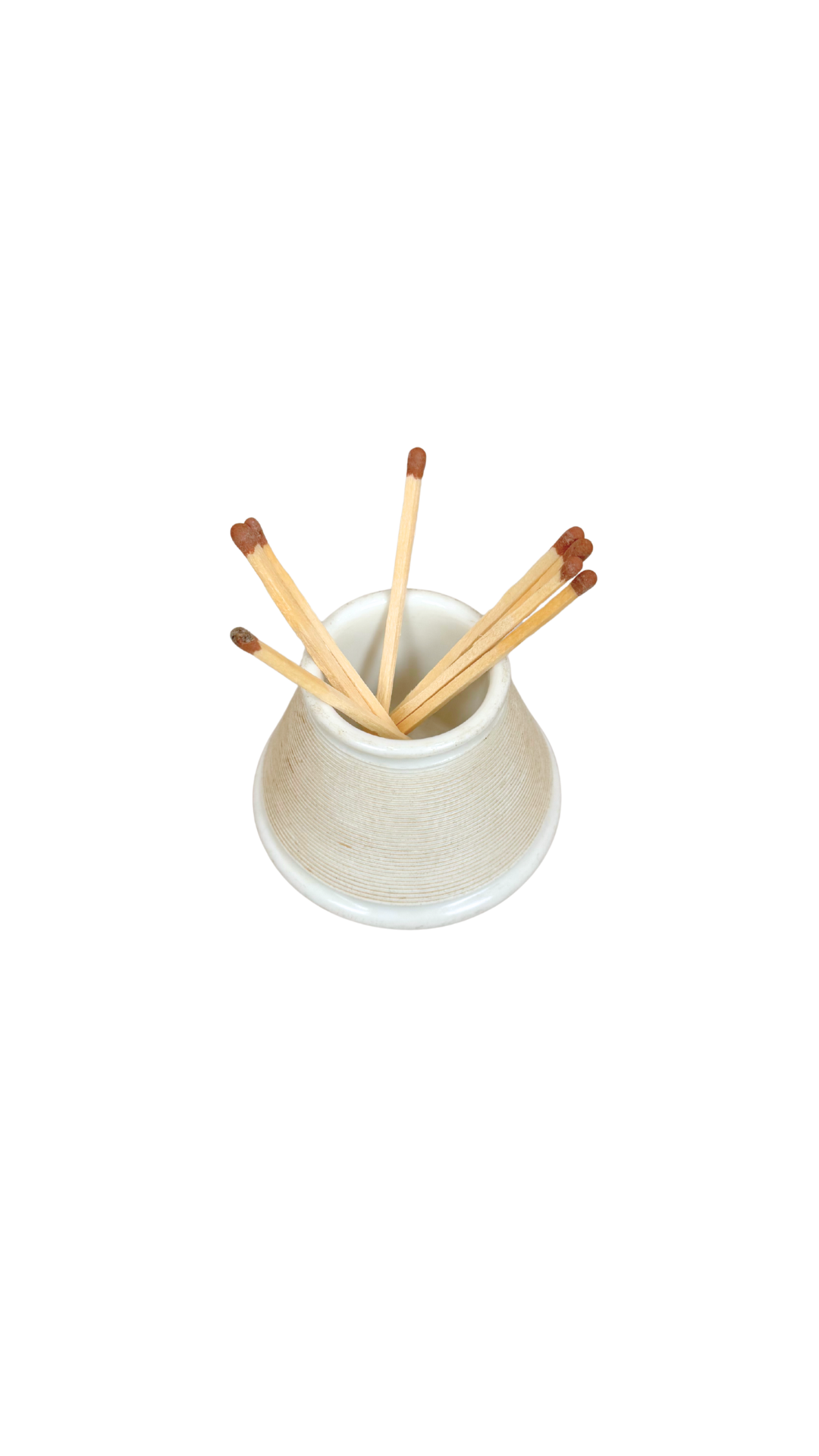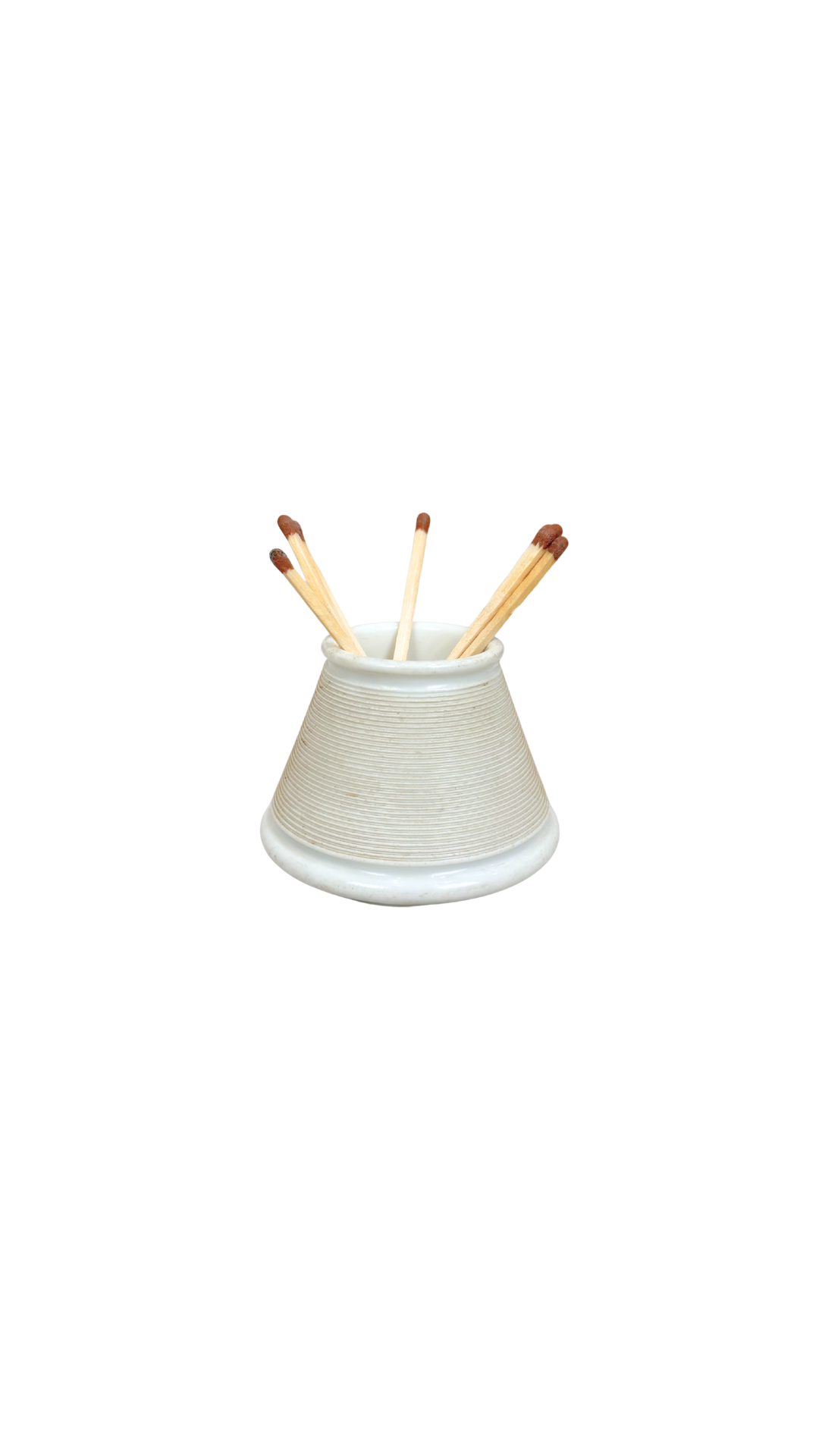 A classic French pyrogène match strike in creamy white faience, featuring fine horizontal ribbing and a softly flared silhouette. Designed for both storage and striking, these countertop pieces lived beside the hearth or kitchen range — practical objects elevated by simple form and texture.