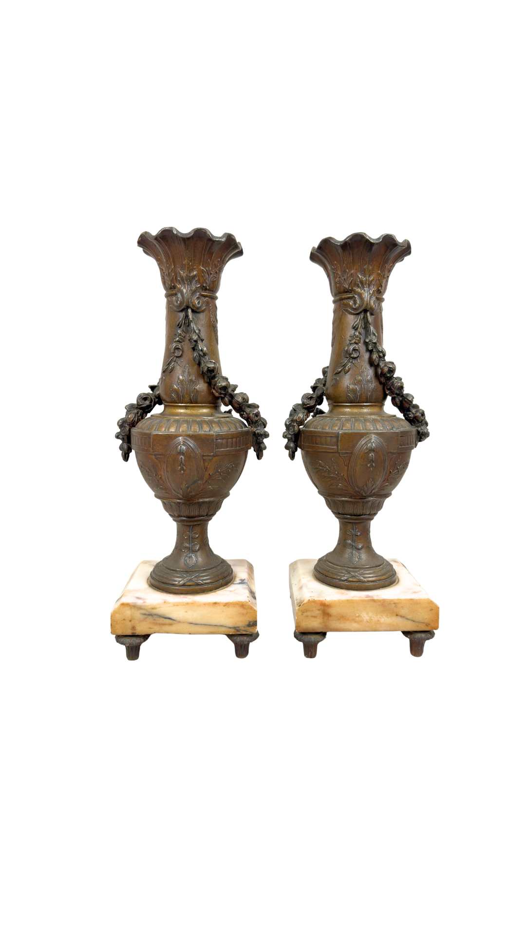 A beautifully sculptural pair of antique French bronze urn vases resting on solid marble plinth bases. The bodies are richly detailed with ribboned garlands, florals, and classical motifs — a nod to Louis XVI neoclassical ornamentation that remained popular into the Napoleon III period.