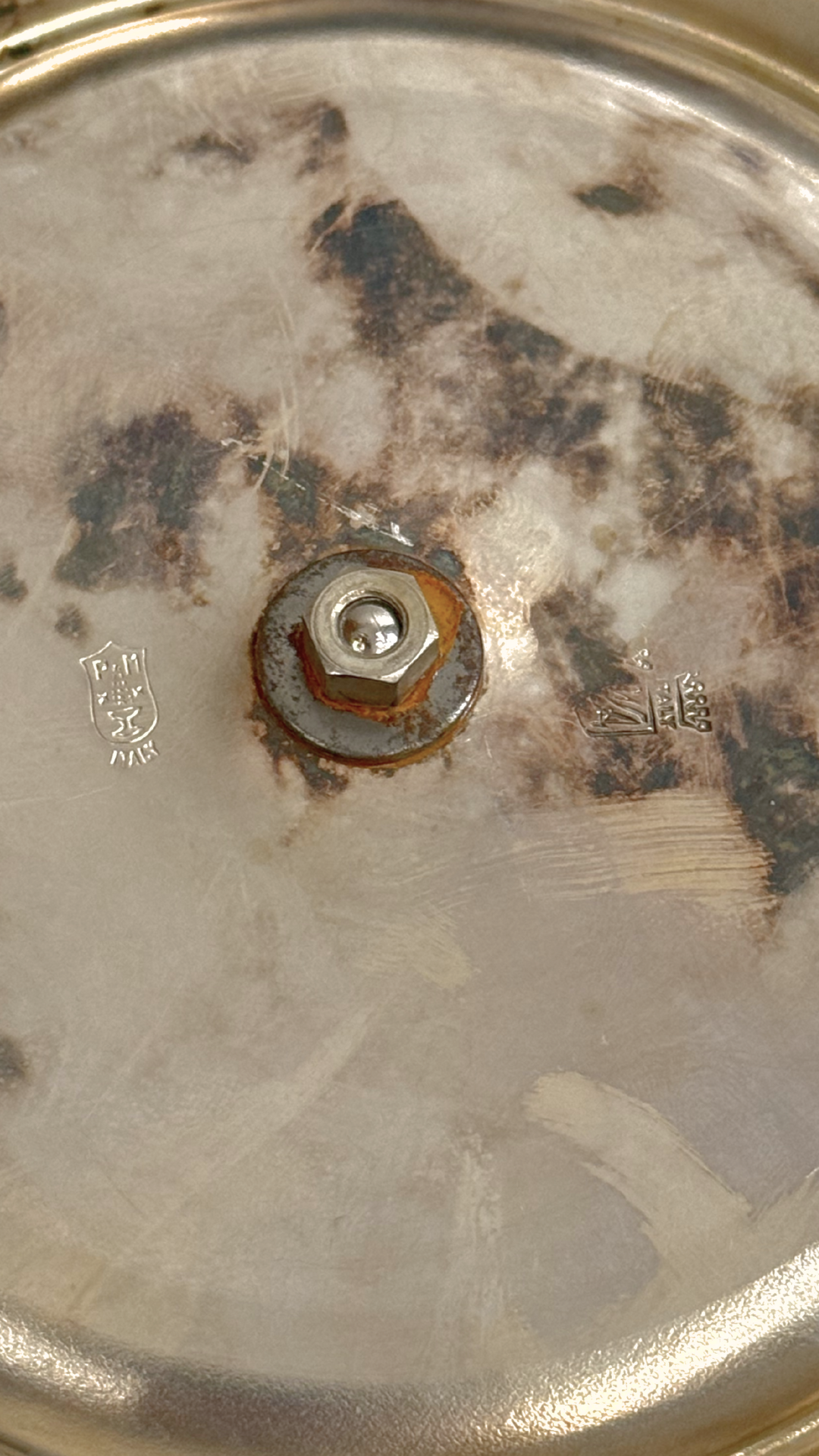 Light wear and patina consistent with age, including surface scratching and tarnish to the underside near the swivel mount. Swivel mechanism rotates properly. No dents or warping.