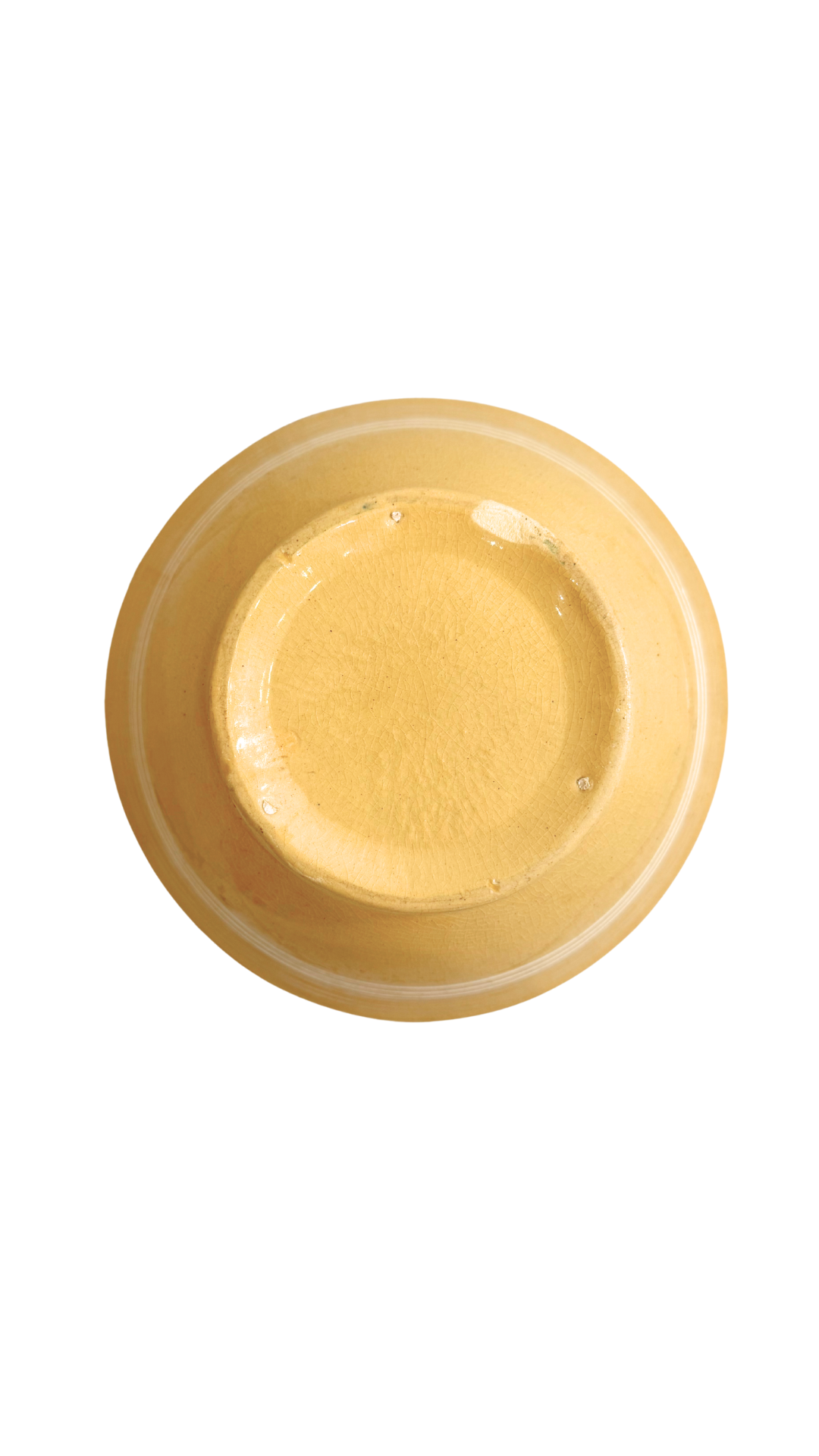 A warm, vintage yellow slip-glazed pottery bowl with that perfectly lived-in, kitchen-staple look. Its honey-ochre glaze, hand-thrown shape, and subtle white banding give it an inviting, nostalgic character that works beautifully on open shelves, counters, or styled with produce or linens.
