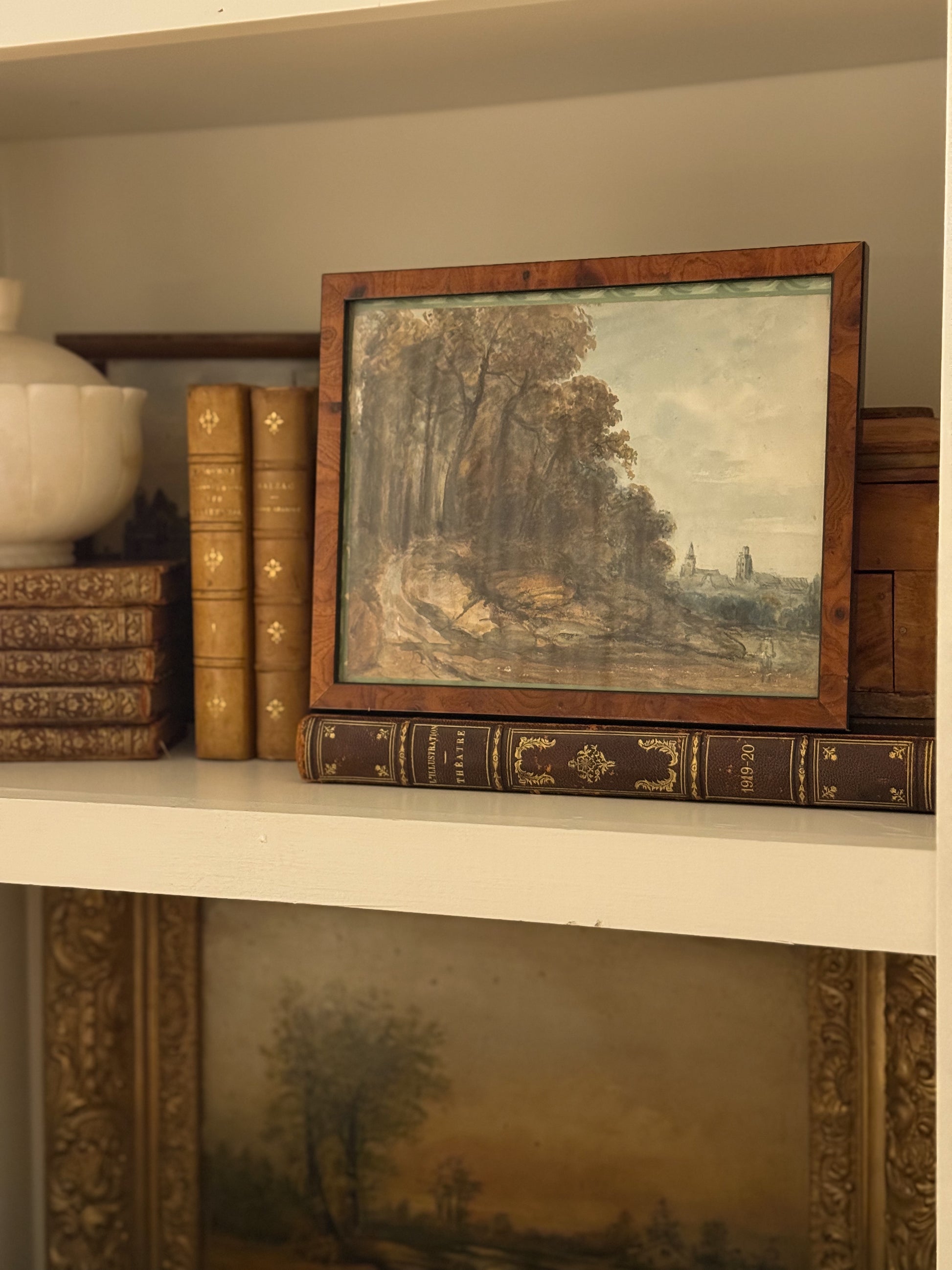 A softly-rendered 19th-century English watercolor capturing a quiet wooded path opening toward distant cathedral towers. The palette is muted and atmospheric—warm chestnut, moss green, slate blue—exactly the kind of piece that brings a gentle, lived-in elegance to a vignette.